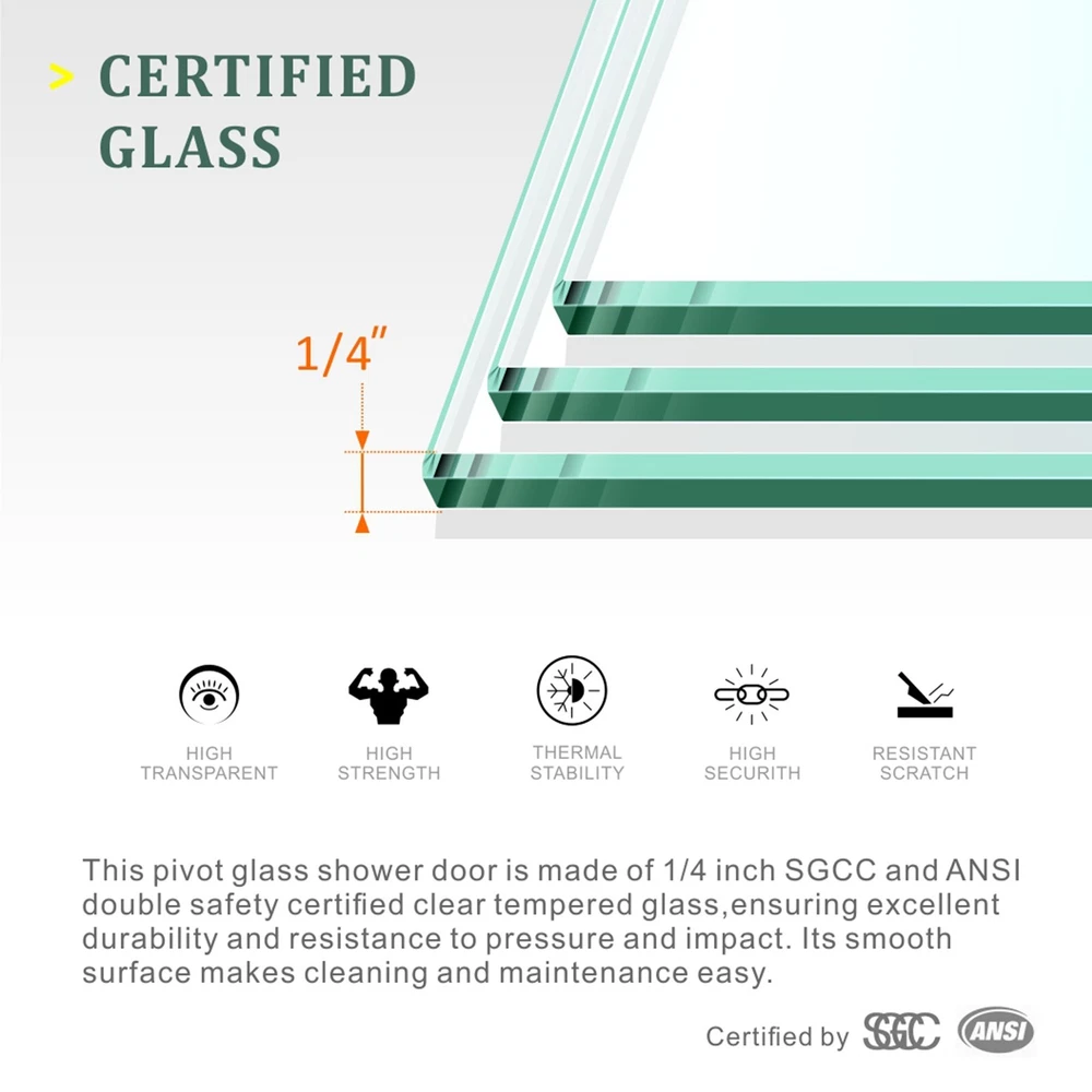 ADJUSTMENT WIDTH: The size of this pivot shower door is 30''x 72'',it can be adjusted by 0.75 inches on both sides,suitable for 29.5-31 inches wide bathroom openings (all measurements must be taken after wall finishes are completed).The pivot can be raised slightly when opening the door and lowered slightly when closing to avoid rubbing against the floor,making opening and closing easier and safer. SPACE SAVING DESIGN:The panel of the single pivot shower door opens from one side, saving space while providing ample passageway. The pivot small shower door has a maximum swing range of approximately 90°, making it an ideal choice for small bathrooms.The hinged shower door is reversible design, which can be opened from the right or left side according to your preference. SAFETY TEMPERED GLASS: This pivot swing glass shower door is made of 1/4" (6mm) SGCC and ANSI double safety certified clear tempered glass, ensuring excellent durability and resistance to pressure and impact. Its smooth surface makes cleaning and maintenance easy. MAGNETIC WATERPROOF DESIGN: The pivot glass shower door adopts an innovative leak-proof design, the side adopts magnetic seal to make the door more tightly sealed after closing, and the closing experience is smoother and quieter. The special waterproof seal strip at the bottom can effectively prevent water from leaking onto the bathroom floor,which can effectively separate the dry and wet areas. EASY INSTALLATION: User manual and all installation accessories included in package,this swing shower door for bathroom is very easy to install even if you are not a professional, Glazenclos online consulting service is always available to help you around the clock to solve any shipping, sales or installation problems you may Pivot Glass Shower Door As a professional bathroom product manufacturer, we always provide you with better products and more efficient services, but the following service terms need to be known to you: 1: If you find some problems with the product after receiving the goods, please do not discard the product, because we need you to provide pictures or videos of the relevant faults to better serve you. 2: Please note that we do not bear the installation/assembly costs. If you find a fault during the installation of the product, we will not bear or reimburse this cost because we stipulate that all parts must be checked before booking. 3: Delivery within the United States only, excluding Alaska/Hawaii, Puerto Rico, Guam, Saipan, APO/FPO, US Protectorates and PP Box. Usually the delivery time is 1 to 7 business days. If you still have not received the goods after 7 business days, please contact us immediately and we will track the order for you. 4: If your goods are damaged when delivered, you must refuse the order and describe the damage on the receipt. Just fill in "the goods are damaged". If you accept the goods and the damage is not noted on the receipt, we reserve the right not to refund or replace your goods. If you are not satisfied with your purchase, please contact us within 7 days. Please note that there is a 20% restocking fee and all shipping and handling charges are the responsibility of the buyer.