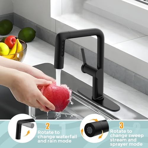 Matte Black Pull-Down Sprayer Kitchen Faucet with Waterfall Spout