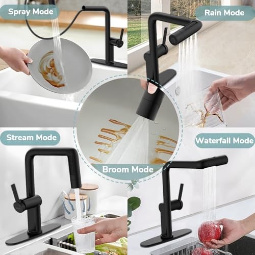 Menu 1. We require immediate payment. 2. We currently accept payment via eBay managed payments only. 3. Once payment is cleared, we will dispatch your shipment within 1-3 business days. Please refer to the "Shipping" tab for more information regarding shipping speed to your destination. Waterfall Kitchen Faucet with Pull Down Sprayer, Kitchen Sink Faucets with 5 Spout Modes, 360° Swivel Single Handle Faucet with Deck Plate, Matte Black Product description 5 FUNCTIONAL MODES: waterfall kitchen faucet has 5 water modes (rain, waterfall, stream, spray and broom), the multifunctional faucet can be switched to assist you to clean easily and meet your daily water needs! PULL-OUT DESIGN AND 360° ROTATION: This sink faucet with pull-down shower extends your range of application, the sprayer pull-out extends to cover the entire sink and even more areas, the 360° rotatable kitchen faucet is highly flexible, and the plastic pull-out sprayer makes it lighter for you to use. SINGLE HANDLE DESIGN: Hot and cold single-lever mixer faucet allows you to adjust the size and temperature of the water flow according to your needs, single-lever faucet with ceramic cartridges can save you 30% of water use, long service life after 50,000 times of switching detection. RICH USE SCENES: multifunctional faucet design and modern appearance structure can be adapted to most of the scenes, such as the kitchen, bar, RV, outdoor camping, in daily use, the kitchen pull-down faucet with different spray modes can be efficiently wash fruits and vegetables, rinse stains, clean pots and pans. QUICK INSTALLATION: Chrome kitchen faucet Overall Height: 11.02 inches, Spout Height: 8.66 inches, Spout Length: 5.19 inches.3/8 inch threads are compatible with standard port connections, and the hot and cold water pipes are pre-installed in advance, so you can install and use it by yourself in just 15 minutes without the help of a plumber. PLEASE MESSAGE US IF YOU HAVE ANY OTHER QUESTIONS, AND MANY THANKS FOR READING ALL OF THIS. Copyright ©#. All Rights Reserved.