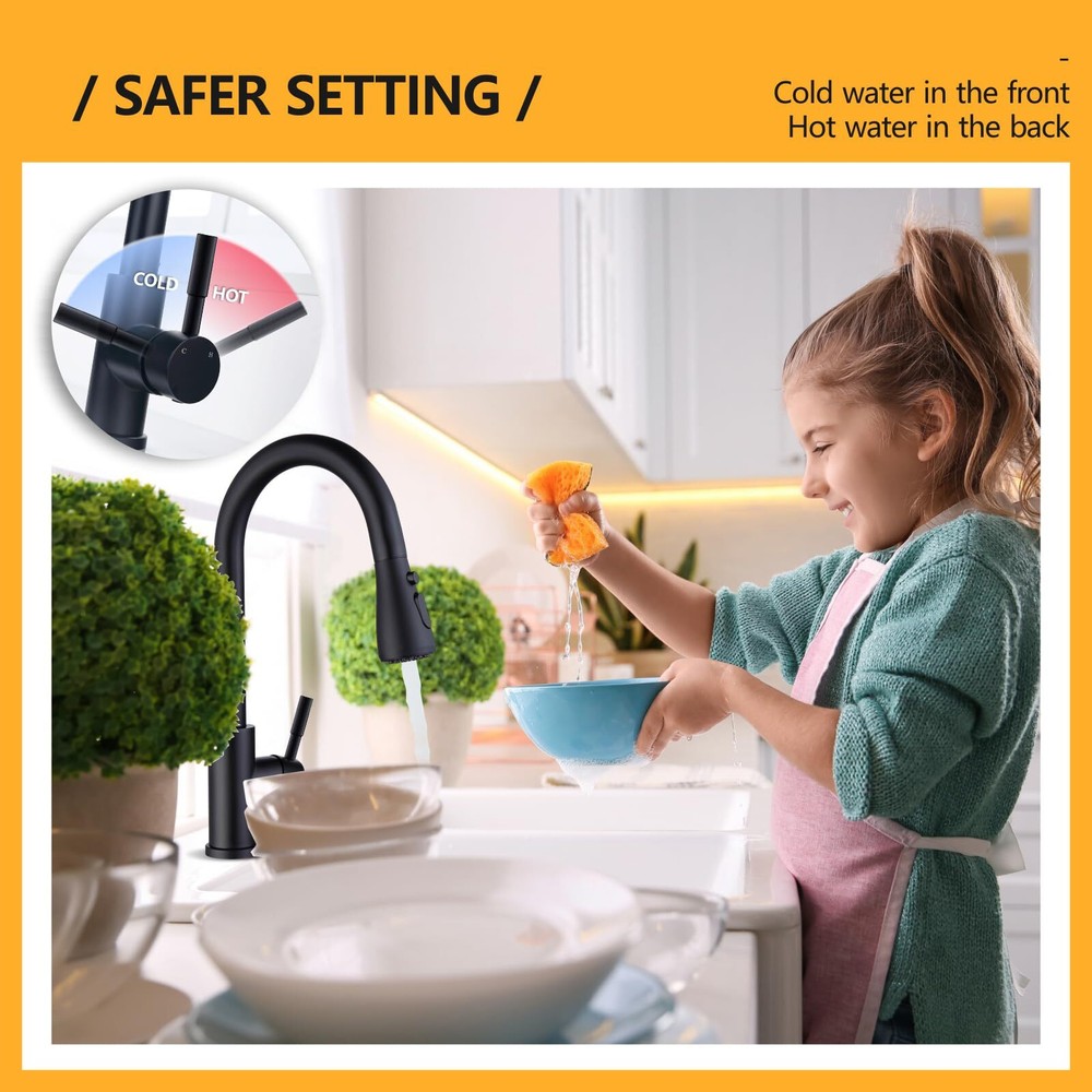 Black Kitchen Faucet with Pull Down Sprayer, Rv Kitchen Sink Faucets, Fingerprint Resistant Single Hole Single Handle Stainless Steel, Matte Black Flexible Cleaning: The kitchen faucet can be pulled out flexibly for cleaning with 360 degree rotation. The cleaning range of ordinary faucet is not large enough, but the kitchen faucets with pull down sprayer can let you clean easily, free to pull, meeting all the big cleaning experience. Standard Size: Total Height: 15.2”, Spout Height:7.5”, Spout Reach: 9.4”. The kitchen sink faucet will come with all the mounting hardware, 3/8” hot and cold water hoses included, and you can install it by yourself without a plumber to save money and time. What we do offer is a good product at a rock-bottom price. 3 Setting Modes: Faucet for kitchen sink with three setting modes can meet all your requirements of kitchen housework. This kitchen faucets for sink can allow you to easily move from aerated stream to powerful spray. You can change different modes as the sprayer head is with rocker switch. Considerate Design: Base on a large number of investigations for famlies, we found that children also use faucets frequently. In order to prevent children from getting scalded, we specially designed cold water in the front when pulling forward the handle on the sink faucets for safety. Heathier Drinks: All the water pipes inside the brushed nickel faucet are food grade materials, SUS304 stainless steel material corrosion prevention and rust prevention, you don't need to worry about the safety of drinking water, with comfortable, drink at ease. MAKE LIFE EASIER has always been committed to simplifying the busy lifestyle and providing consumers with quality sink faucet with sprayer. We strive to motivate people to improve the quality of life with simple and practical design. We encourage you to experience 's difference and make life easier. PREMIUM CERAMIC CARTRIDGE 500,000 open&close tests done on pull down kitchen faucet handle to provide professional drip-free durability performance. We adopt attractive, reliable, and innovative product designs to provide your whole family with better use and protection. HIGHT QUALITY The Solid 304 stainless steel material for water faucet, provides enhanced leak-tightness and non-corrosion. It’s a kind of health materials which does not release harmful substances to ensure family health and hygiene. Also, stainless steel with matte black finish helps your faucets for kitchen sinks perform like new for life. Food-grade PEX material PEX inner hose for rv sink faucet suits for potable water supply applications without odds or bad taste takes special care for your family health. Shipping We offer FREE shipping on all orders! We ship within Three business days of payment, usually sooner. We use a selection of shipping services such as UPS, FedEx, USPS etc. We only ship to the lower 48 states, no APO/FPO addresses or PO Boxes allowed. Local pickups and combined shipping options are not provided at this time. Return You can return a product for up to 30 days from the date you purchased it. Any product you return must be in the same condition you received it and in the original packaging. Please keep the receipt. Payment We accept payment by any of the following methods: PayPal Please pay as soon as possible after winning an auction, as that will allow us to post your item to you sooner! Feedback Customer satisfaction is very important to us. If you have any problem with your order, please contact us and we will do our best to make you satisfied. Contact Us If you have any queries, please contact us via ebay. We usually respond within 24 hours on weekdays. Please visit our eBay store to check out other items for sale! Thank you for shopping at our store.