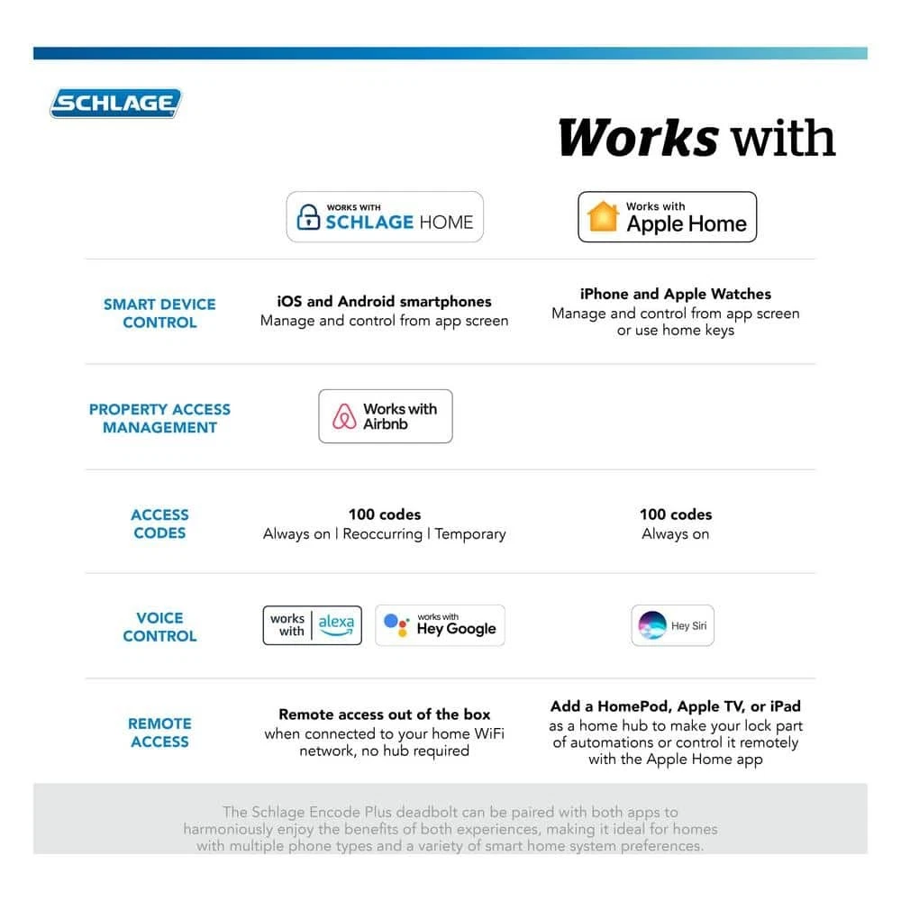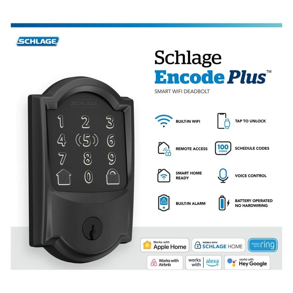 Camelot Matte Black Electronic Encode Plus Smart WiFi Deadbolt with Alarm Electronic Deadbolts Manage with Schlage Home app; Tap to unlock using Apple home keys Control through home integrated Wifi; no smart home hub required AAA highest BHMA rating and 3 year electronic warranty Built on a century of industry-leading innovation and trusted security, the Schlage Encode Plus Smart WiFi Deadbolt is changing the way you protect what matters most. Built-in WiFi and secure encryption help you control and monitor your home from anywhere, no additional accessories needed. This innovative smart lock provides secure, seamless access when paired to the Schlage Home app and connected to your home's WiFi network. Conveniently schedule up to 100 access codes, view ... Urintelligentbi Hello, respected customer Camelot Matte Black Electronic Encode Plus Smart WiFi Deadbolt with Alarm Camelot Matte Black Electronic Encode Plus Smart WiFi Deadbolt with Alarm Electronic Deadbolts Manage with Schlage Home app; Tap to unlock using Apple home keys Control through home integrated Wifi; no smart home hub required AAA highest BHMA rating and 3 year electronic warranty Built on a century of industry-leading innovation and trusted security, the Schlage Encode Plus Smart WiFi Deadbolt is changing the way you protect what matters most. Built-in WiFi and secure encryption help you control and monitor your home from anywhere, no additional accessories needed. This innovative smart lock provides secure, seamless access when paired to the Schlage Home app and connected to your home's WiFi network. Conveniently schedule up to 100 access codes, view lock history, receive push notifications, pair with Amazon Alexa and Google Assistant for hands-free control, and so much more. It also works with Apple HomeKit and Apple home keys. With home keys, you can simply tap to lock or unlock using your iPhone or Apple Watch for easy and secure access to your home. Built smart and tough, the Schlage Encode Plus deadbolt is certified highest in Security, Durability, and Finish by industry experts. ANYWHERE ACCESS: With built-in WiFi compatibility, you can easily and securely connect your Schlage Encode Plus lock to your home WiFi network to control and monitor your home from anywhere with the Schlage Home app PEACE OF MIND: Lock and unlock from anywhere, mange up to 100 access codes, view lock history, receive customizable notifications and easily manage multiple locks at once - all when paired to the Schlage Home app and connected to a secure WiFi network TAP TO UNLOCK: Works with Apple HomeKit and Apple home keys; with home keys you can simply tap to lock or unlock using your iPhone or Apple Watch for easy and secure access to your home VOICE CONTROL: Works with Amazon Alexa and Google Assistant for optional, hands-free convenience when paired with the Schlage Home app and a voice enabled device ADVANCED SECURITY: Secure, encrypted connection; built-in, customizable alarm for door movement and forced entry attempts; fingerprint-resistant touchscreen; certified highest residential Security, Durability and Finish rating by BHMA industry experts EASY INSTALL: Install in minutes with just a screwdriver, no hardwiring required; Snap 'n Stay design helps keep the lock on the door so both hands are free; fits standard doors with 1-3/8 in. to 1-3/4 in. door thickness and 2-3/8 in. or 2-3/4 in. backset COME AND GO WITH EASE: Auto-lock conveniently relocks the door for you and has a variety of time delay options to choose from or can be turned off completely; One-touch locking from the exterior touchscreen makes locking up when leaving easy BATTERY-OPERATED: Uses four AA batteries (included); up to six months of battery life with typical use; low-battery indicator on lock touchscreen and in Schlage Home app provides advance notice; one (1) physical backup key included WARRANTY: Limited lifetime mechanical and finish warranty and 3-year electronics warranty, see Schlage for full details Click here for more Schlage Door Hardware products Click here for more information on Electronic Recycling Programs Item Specifics Brand Schlage Type Outdoor Dining Chairs length width height weight 3 lb Payment [ 1. We accept Paypal. Each buyer's payments is protected by Ebay. 2. Payment time affects delivery time. 3. If you want more quantities or other models , please contact us! ] Shipping [ 1.Processing time It normally takes 3 business days. We will confirm in time after receiving the payment from the buyer, verify the address of buyer then deliver the item according to the buyer's order time. 2.Shipping time We ship to eBay's address only,please ensure your address in eBay. We ship to all parts of the world, but we are sorry that we do not support the Russian Federation and Ukraine for the time being. There may be some delay due to flight, National holiday, weather, local natural disaster impact, etc, hope you can be patient and contact us freely, we will try our best to help you. ] Returns [ 1. We gu arantee to provide you with a five-star shopping experience, and provide return& refund services for buyers. If you are not satisfied when you receive the items, please contact us within 30 days for return and refund. (Buyer pays return shipping) 2. Please don't open case via ebay or paypal. 3. For order questions please contact us via the Ebay Message System. We are willing to answer your questions and we will provide you the best soloution within 24 hours. Please understand that we are not in the office on Saturday and Sunday, so the questions asked over the weekend will be answered on the following Monday. 4. We sincerely invite you to leave a fair feedback after completing the transaction. If you are satisfied with our service, please rate us. Your valuable feedback and comments are very important to us. ] Contact Us If you are not satisfied when you receive the items, please contact us within 30 days for return and refund. (Buyer pays return shipping) 