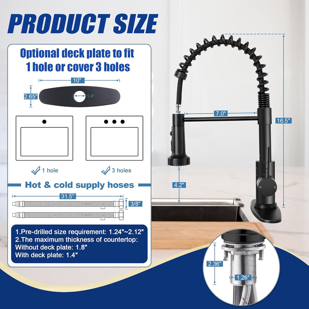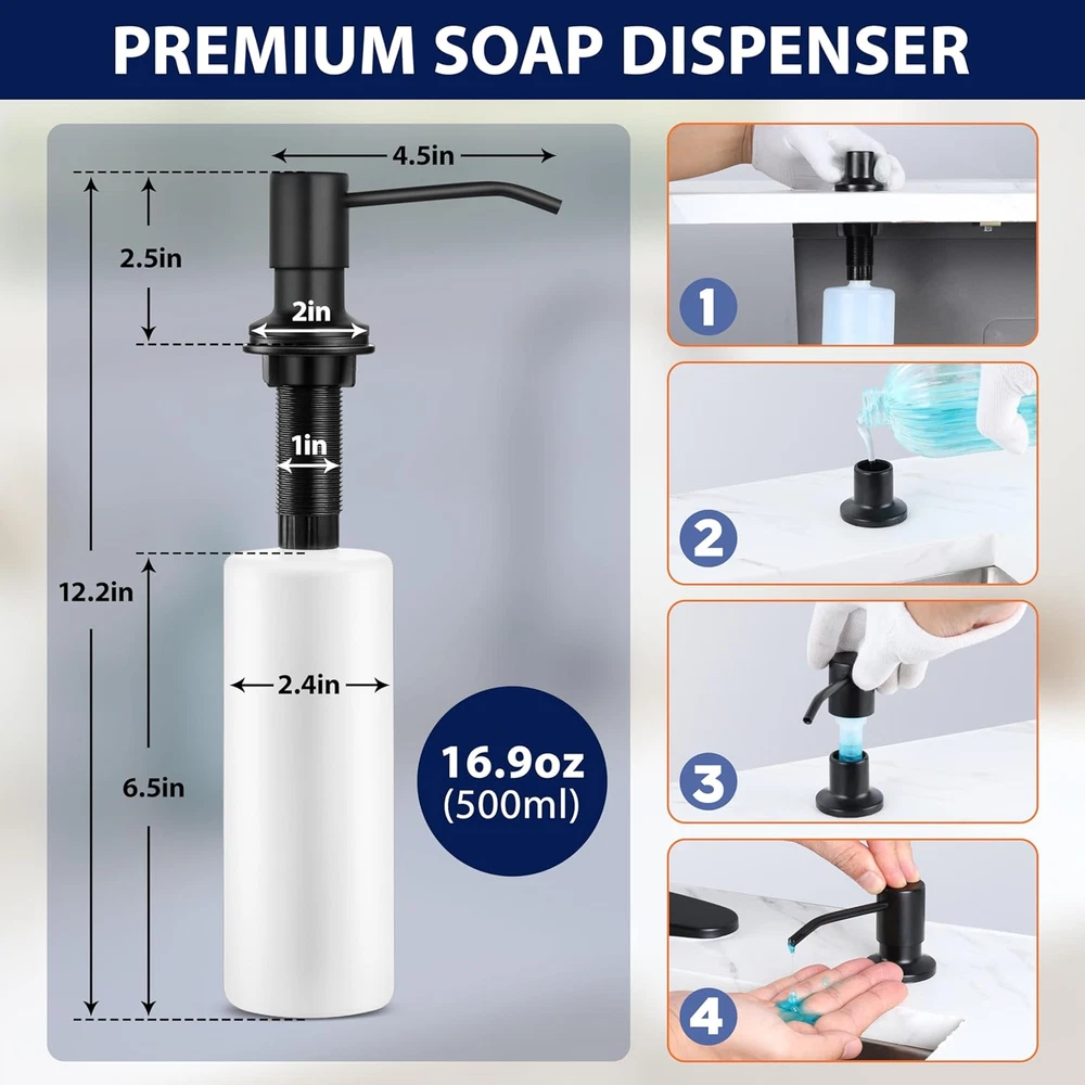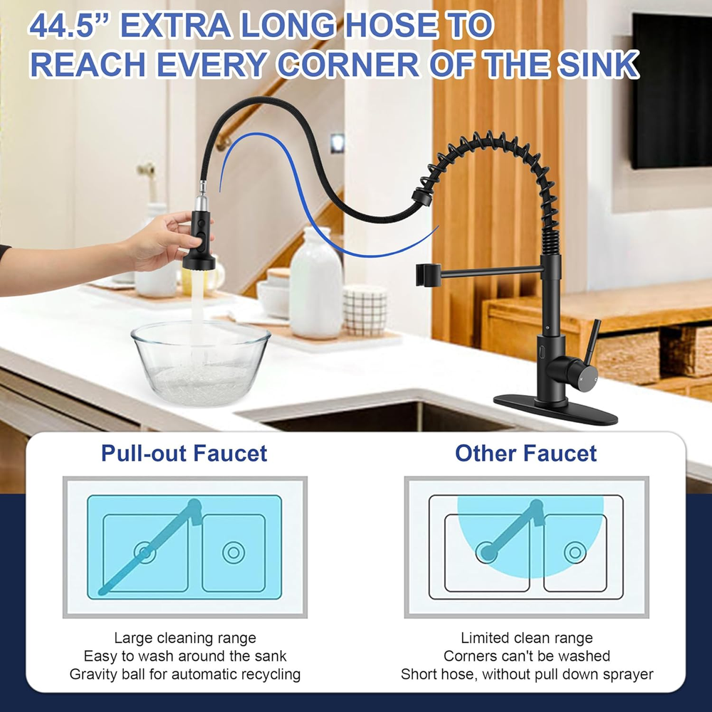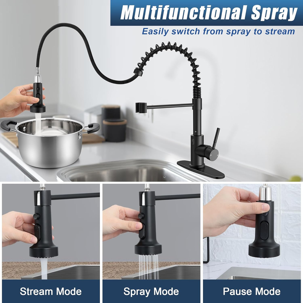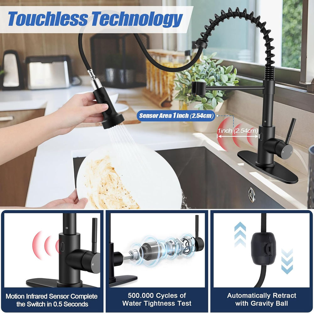 Fast Shipping On All Items 30 Days Money Guarantee Customer Support Excellent Service 100% Satisfaction Satisfaction Guaranteed Matte Black Touchless Kitchen Faucet with Pull Down Sprayer & Soap Dispenser,... Specification Style Spring Faucet Hole Count 1 Mounting Type Embedded Color Matte Black Finish Type Stainless Steel Material Stainless Steel Number of Handles 1 Recommended Uses For Product Kitchen Special Feature Touchless Included Components Deck Plate 13.78 inches x 17.72 inches x 2.95 inches. Weight: 5.39 lb Item Description Touchless kitchen faucet, the kitchen faucet has a motion infrared sensor with 1" sensing distance, just wave your hand to turn the faucet on when the handle is open, wave again to shut off or wait to shut off automatically after 3 minutes to prevent accidental opening, no need to touch the faucet with dirty or wet hands, provide hands-free convenience Healthy material, smart kitchen faucet is made of premium 18/10 stainless steel, resist rust and corrosion resistance, high sealing ceramic cartridge core ensures no leakage or dripping, food grade and upgrade high-temperature resistant PEX inner hoses bring you fresh water, come with a soap dispenser designed with 360°swivel, easy to press Pull down sprayer, modern black faucets featured with 3 function spray to meet your various needs, stream for filling, spray for thorough cleaning, pause for avoiding splashing in multitask mode, 360° rotation sprayer and 44.5 inch extended pull out hose can reach any corner around the sink, flow rate is 1.7 gallons per minute Easy to operate, our motion activated faucet integrates with both the motion sensor and single handle to control water flow and temperature effortlessly, easily switch between hot and cold water, if you don't want to use the sensor function, just remove the controller and use it as a normal faucet, modern and functional faucet ideal for all style kitchens, vanity, farmhouse and ry sink Quick installations, we provide everything complete accessories and tools for quick installation by yourself including kitchen faucet, soap dispenser, 10" optional deck plate to cover 1 or 3 holes, pre-installed water supply lines and gravity ball, mounting hardware and instructions, no plumber needed, save money and time Package include: Kitchen Faucet Soap dispenser Color: Matte black Function: Automatic sensor faucet Wide application: Kitchen sink, farmhouse, RV, bar, laundry and more Features Constructed of high quality 18/10 stainless steel for durability. Featured with a motion infrared sensor, just wave your hand to turn the water on and off within 0.5s or wait to shut off automatically after 3 mins. Three multifunctional spray head can be easily switched between stream, spray and pause, extended cleaning range. The single handle design is easy to adjust the water temperature and flow. About us We offer the best prices around on high quality products. Our E-store includes media such as books, movies, music and games while offering electronics, toys, sporting apparel, clothing, tools, general home, garden items and more. Shipping We are always working hard to ensure your package arrives as soon as possible. Please understand that some factors like weather, high postal traffic, and the performance of shipping companies are outside of our control. We offer free shipping to the lower 48 states and ship within 2-3 business days of payment, usually sooner. We do not accept P.O. Boxes. Please provide a physical address. For shipping outside of the continental USA, we only use eBay's Global Shipping Program.The item is shipped to KY and then sent to the rest of the world. International customers are responsible for all duties and taxes. Continue to check out to calculate costs for shipping the item to your country. Messages regarding eBay's Global Shipping Program MUST be directed at eBay EXCLUSIVELY. Returns We offer a 30-Day Return Policy on items in which you are not completely satisfied with. You have the option of a full-refund or an exchange of the item. No returns are available on items shipped outside of the USA Satisfaction We try over very best to make sure every customer is completely satisfied. If there's a problem, message us! We're happy to help. Payment Options Shop With Confidence