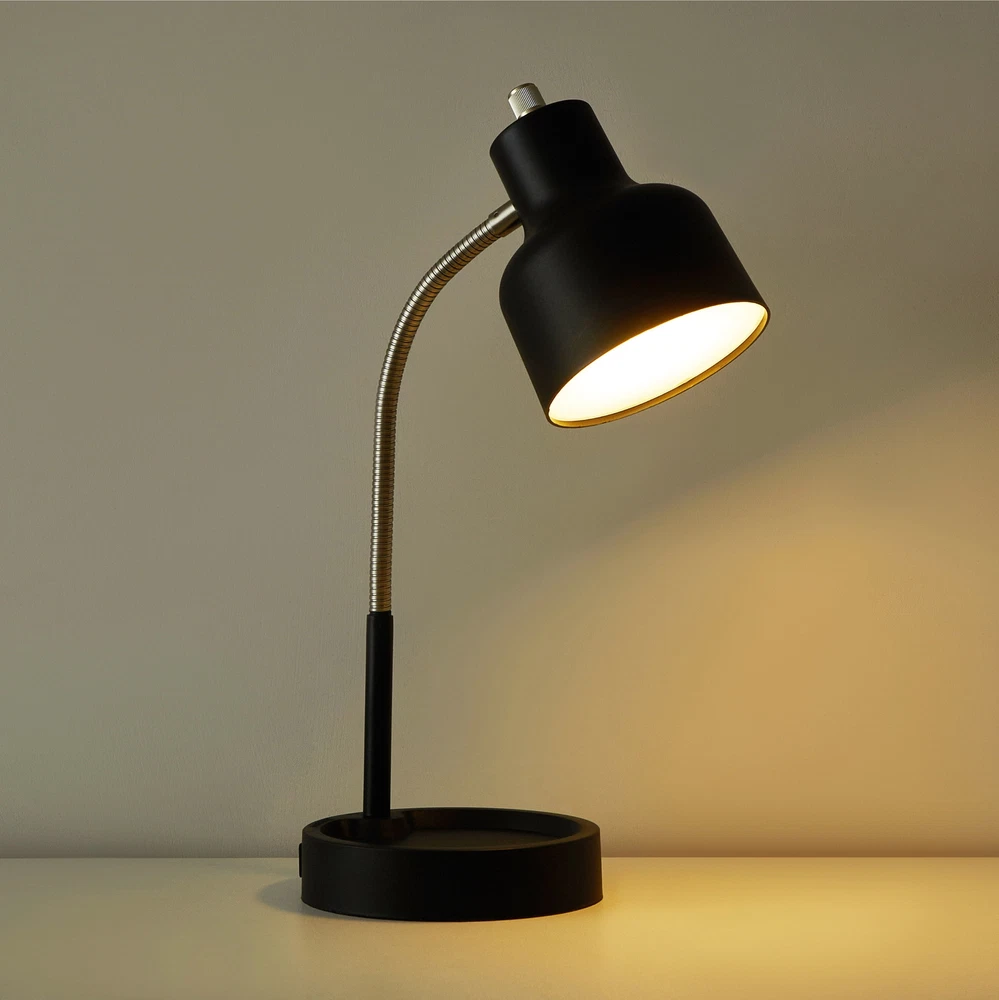 Provides ample lighting for desks and bedside tables Catch-all base provides convenient storage for small items Integrated AC outlet allows for convenient device charging Integrated LED bulb lasts up to 12,000 hours for energy-efficient use On/off switch is integrated on the shade for easy access Metal gooseneck allows for flexible and easy adjustment Made from durable for long-lasting use Max height of 14.5" H x 5.52" W makes it a perfect fit for most workspaces Easy to assemble and use, with no tools required Sleek design adds a modern touch to any workspace Introducing the LED Desk Lamp with Catch-All Base and AC Outlet - The perfect lighting solution for any workspace! This lamp is designed to provide ample lighting while also serving as a convenient storage space for all your small desk items. Measuring at 14.5" H x 5.52" W at it's maximum height, this lamp is perfect for use on desks or beside tables. The integrated LED bulb lasts up to 12,000 hours, making it long-lasting and energy-efficient lighting solution. The on/off switch is integrated on the shade for easy use, allowing you to quickly and conveniently turn the light on and off as needed. The lamp is crafted from durable and features a metal gooseneck for flexibility and easy adjustment. The catch-all base is perfect for storing small items such as headphones, paper clips and more, keeping your workspace clean and organized. Plus, the integrated AC outlet allows you to conveniently charge your electronic devices while at work. Whether you're working late into the night or need a reliable source of lighting for your daily tasks, the LED Desk Lamp with Catch-All Base and AC Outlet is the perfect solution.