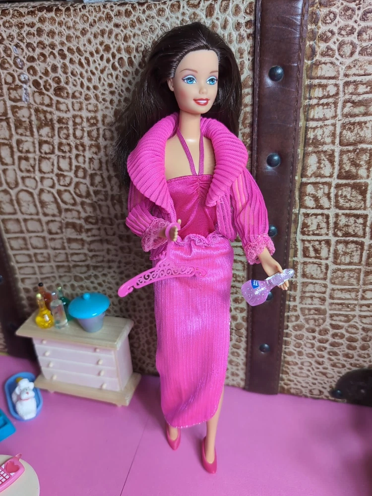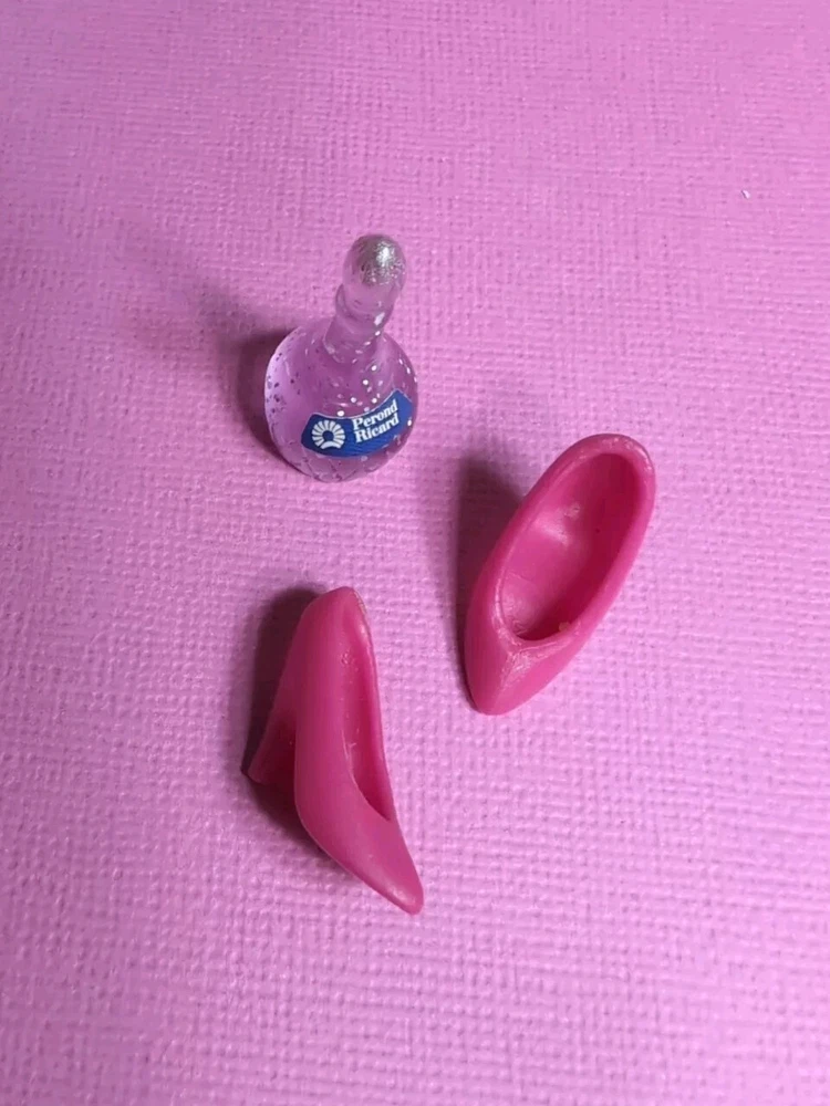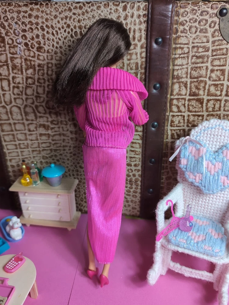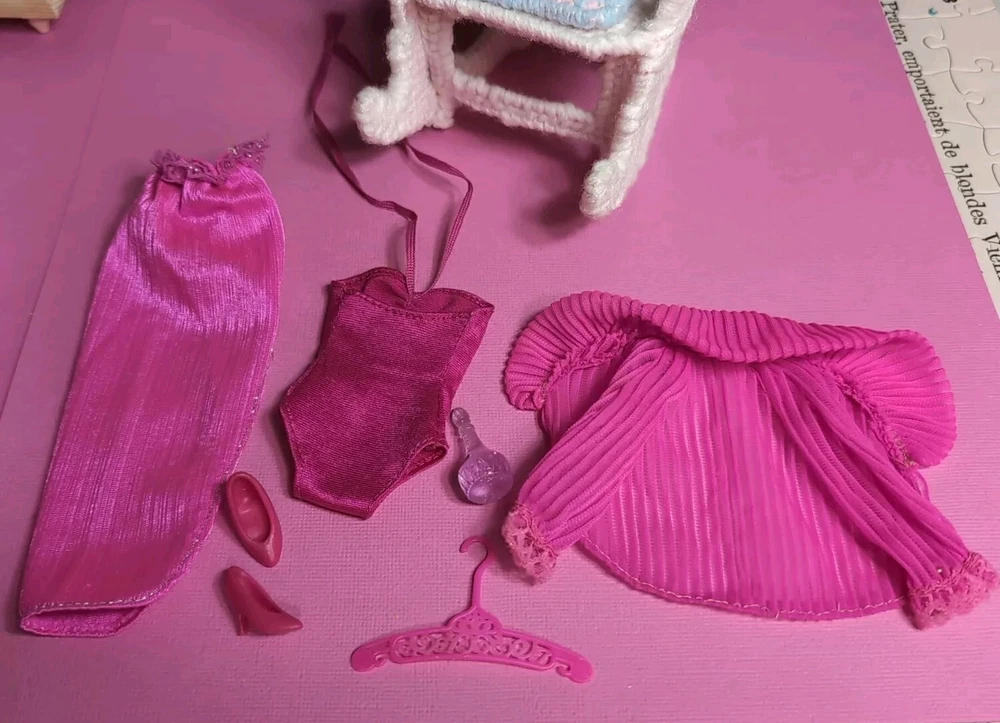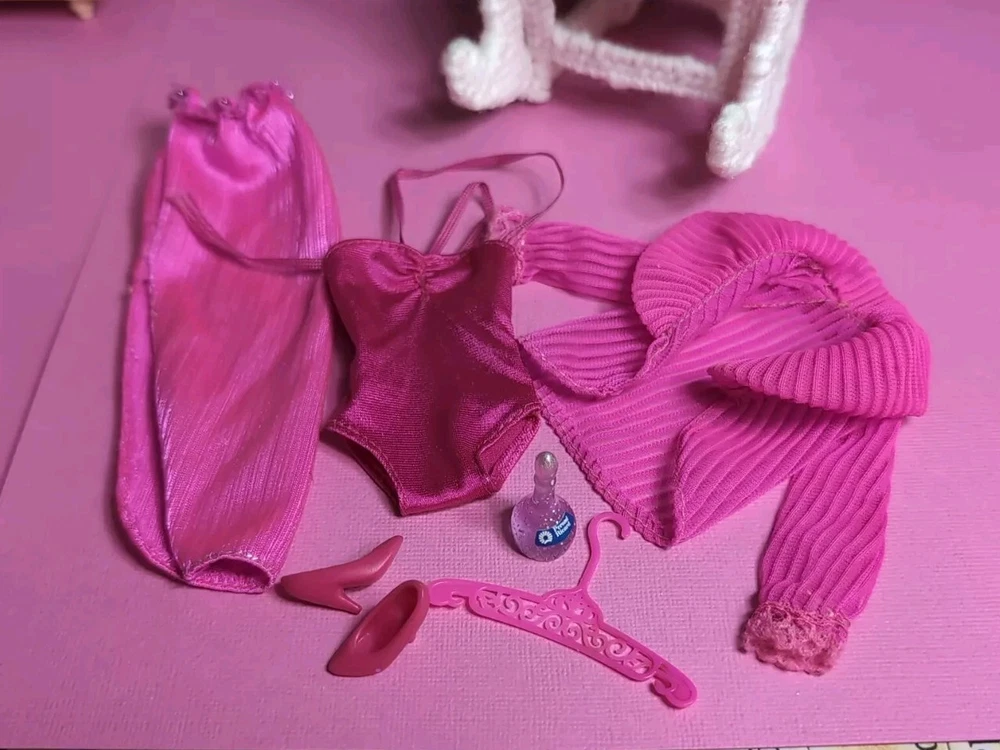 The Mattel Barbie 1980 Beauty Secrets #1290 Pink Outfit is a vintage Barbie clothing set from the Superstar Era. This set includes a pink skirt and jacket. I have added a bodysuit, shoes and a bottle to bring to the party. All are in a vibrant pink color with lace detailing on the jacket and skirt. The outfit is part of the Barbie franchise and designed for a Fashion Doll measuring 11 inches. Made of cloth material, this set is original and showcases a loungewear style popular in the 1980s. A perfect addition for collectors of vintage Barbie items. All items are in very good condition. I did note a little wear to the skirt. Please see photos. Doll and background items not included.