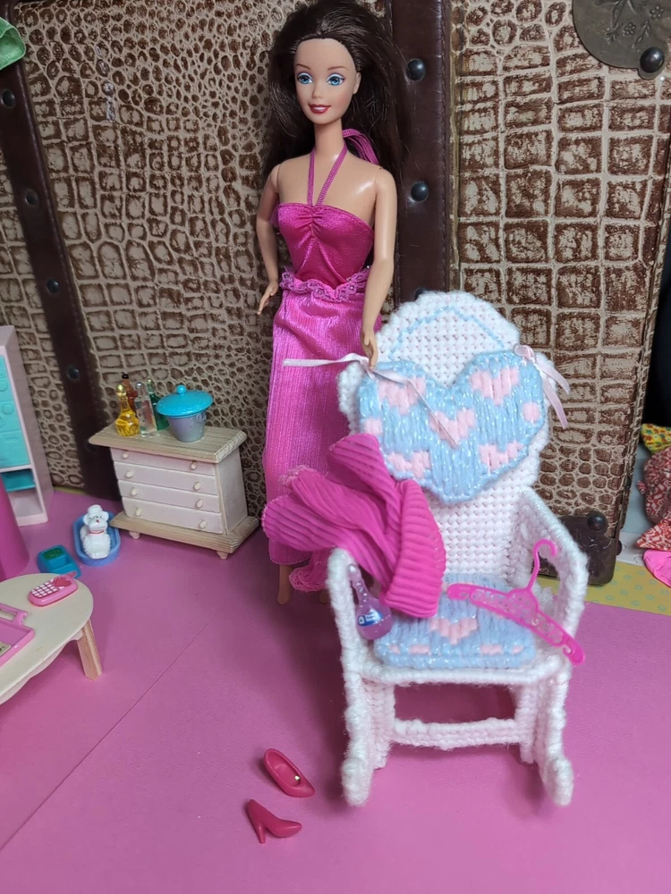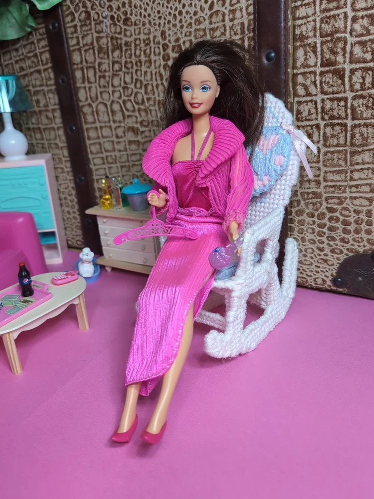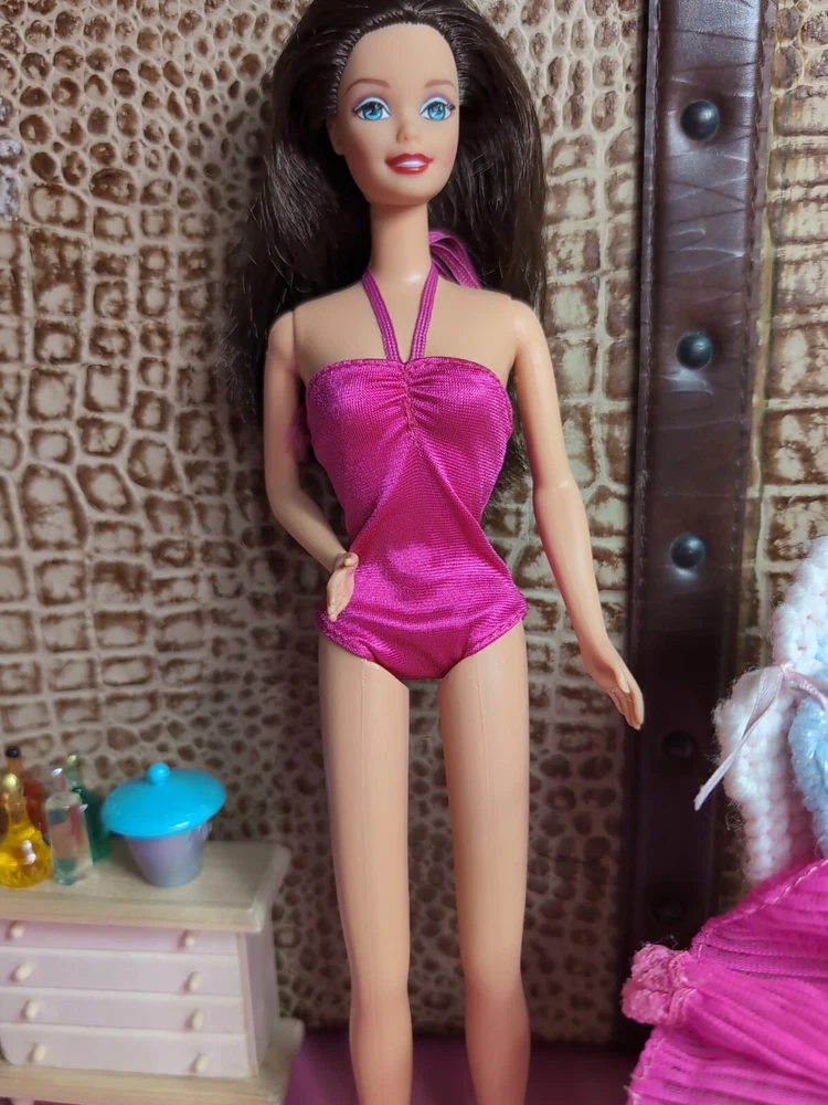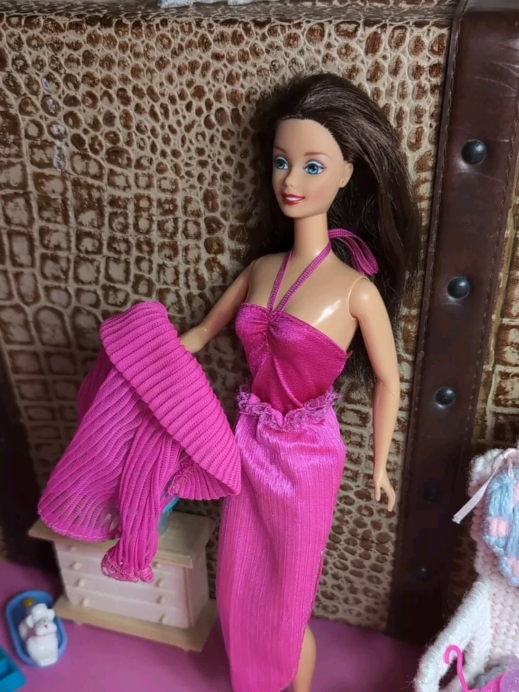 The Mattel Barbie 1980 Beauty Secrets #1290 Pink Outfit is a vintage Barbie clothing set from the Superstar Era. This set includes a pink skirt and jacket. I have added a bodysuit, shoes and a bottle to bring to the party. All are in a vibrant pink color with lace detailing on the jacket and skirt. The outfit is part of the Barbie franchise and designed for a Fashion Doll measuring 11 inches. Made of cloth material, this set is original and showcases a loungewear style popular in the 1980s. A perfect addition for collectors of vintage Barbie items. All items are in very good condition. I did note a little wear to the skirt. Please see photos. Doll and background items not included.
