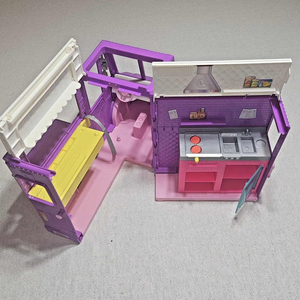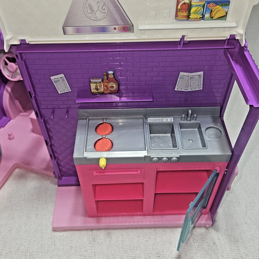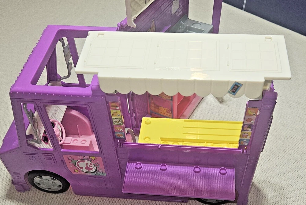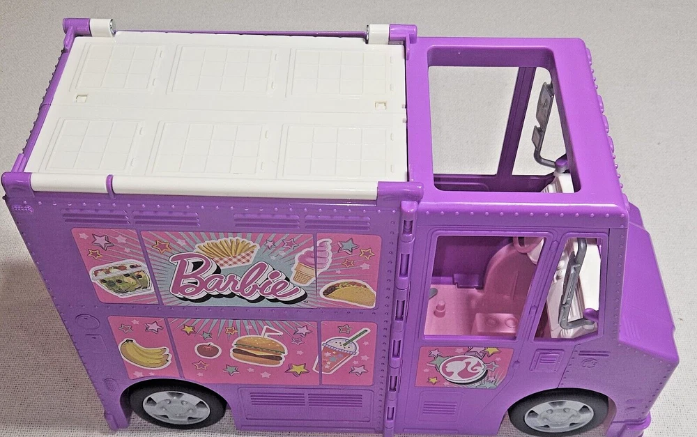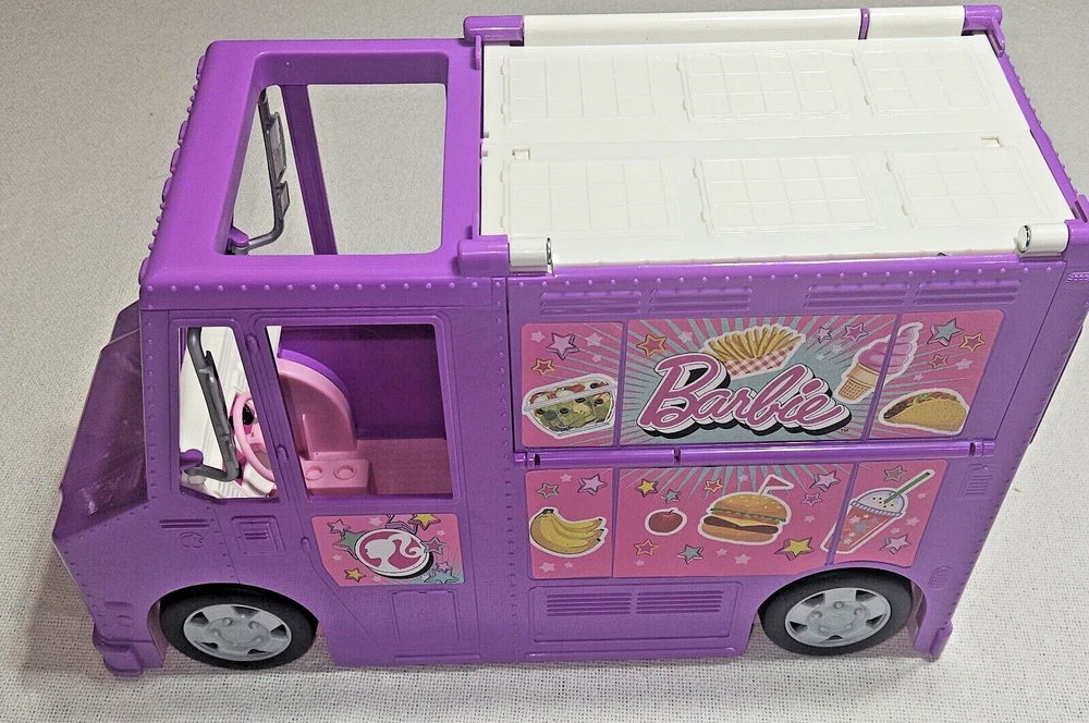 Introducing the Mattel Barbie Fresh 'N' Fun Purple Food Truck, a vehicle that expands and transforms to bring excitement to any Barbie doll collection. This food truck is perfect for imaginative play and is designed for Barbie dolls aged 5-7 years. With a length of 17 inches, a height of 10 inches, and a width of 6.5 inches, this purple food truck is made of durable plastic and is an original Mattel product. It is compatible with 11& 12 inch Barbie dolls and is perfect for youth who love the Barbie franchise. This food truck is a great addition to any Barbie doll collection and is sure to bring hours of imaginative play.