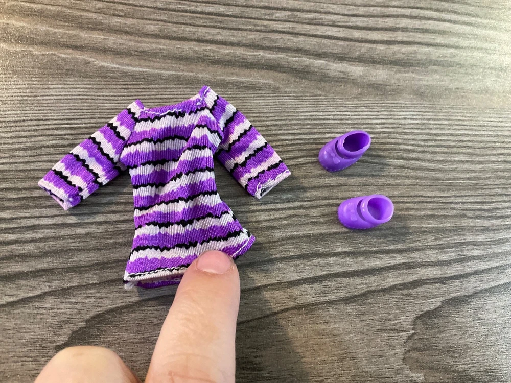 Kelly Doll Outfit This Kelly Clothes Set features A log sleeve purple and white striped dress A pair of shoes are included Set is in Nice Condition ***Please don’t hesitate to make an offer! *** ***Buy It Now :$ 4.50*** OR Best Offer ***Shipping: $ 4.75*** ***Happy to combine shipping for you*** *** Please let me know if you have any question, Happy to help in any way I Can*** ****Please , if you have the time check out my newly opened eBay store. I will be listing many Barbies, clothing, & accessories. As rims goes on I hope to add more fun collectible and vintage items. Like my store to see my newly listed items. Thanks so much!