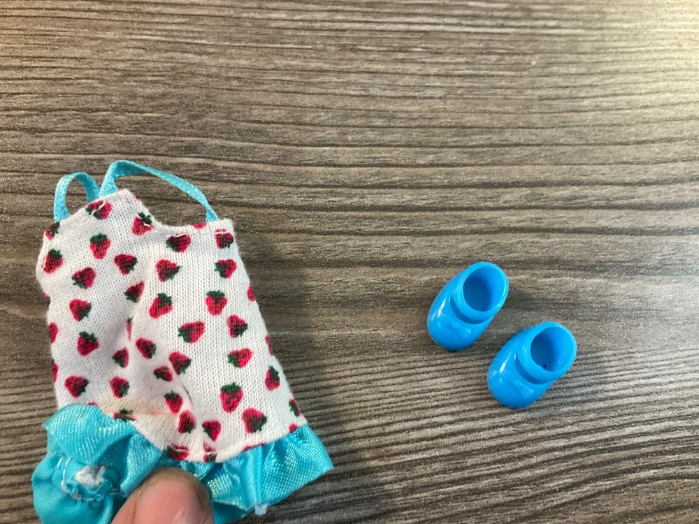 Kelly Doll Outfit This Kelly Clothes Set features A sleeveless white dress with strawberry print on both sides and turquoise ruffles A pair of shoes are included Set is in Nice Condition ***Please don’t hesitate to make an offer! *** ***Buy It Now :$ 4.50*** OR Best Offer ***Shipping: $ 4.75*** ***Happy to combine shipping for you*** *** Please let me know if you have any question, Happy to help in any way I Can*** ****Please , if you have the time check out my newly opened eBay store. I will be listing many Barbies, clothing, & accessories. As rims goes on I hope to add more fun collectible and vintage items. Like my store to see my newly listed items. Thanks so much!