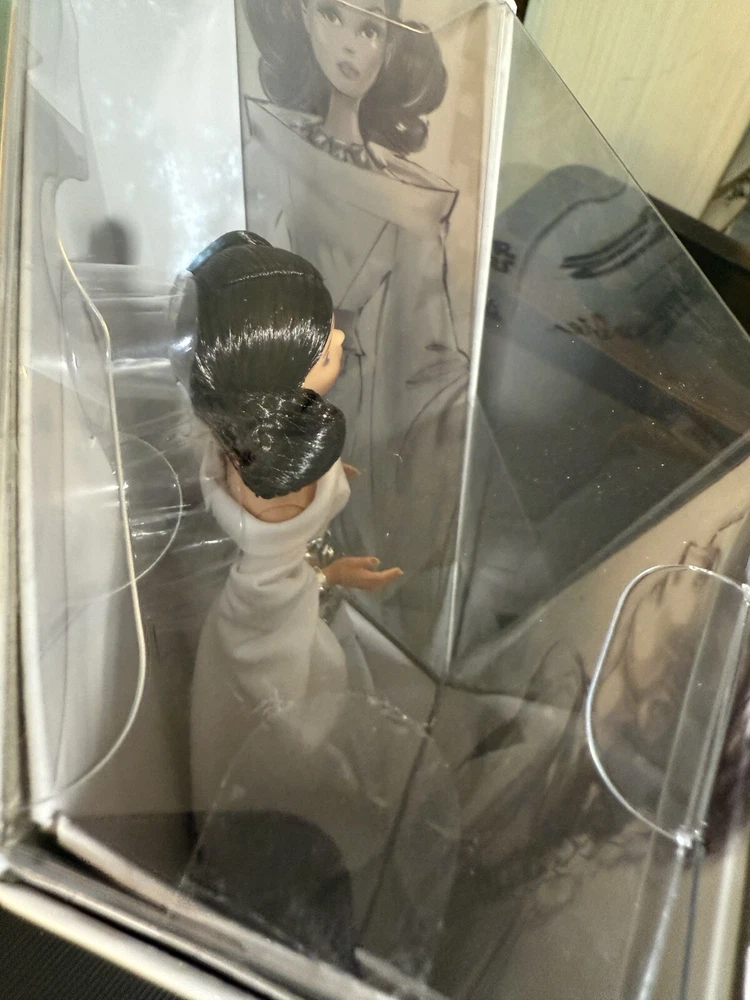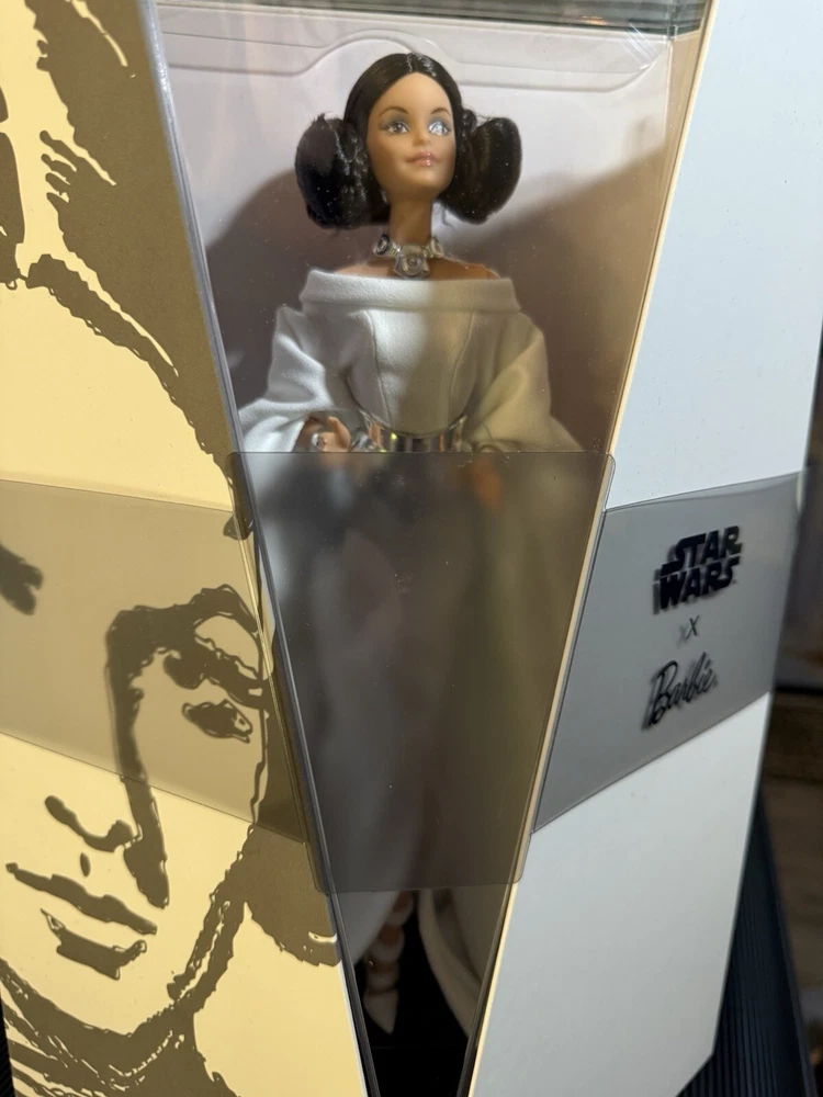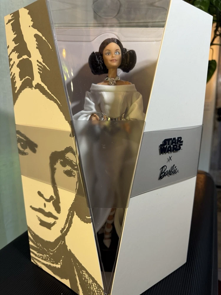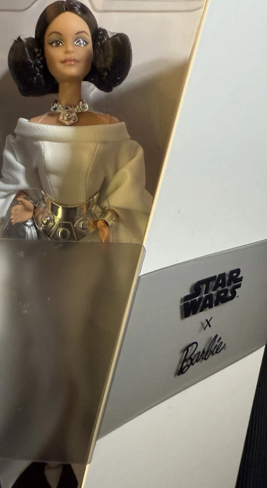 The Mattel Barbie Princess Leia Star Wars Gold Label Doll is a fashion doll featuring the character Princess Leia from the Star Wars franchise. This Barbie doll has straight hair and is an original reproduction, not an antique or vintage item. The set includes an outfit, making it a desirable collector's item for Barbie and Star Wars fans alike. This Gold Label doll was manufactured between 2010-2019, adding to its appeal as a modern and sought-after piece for collectors of dolls and pop culture merchandise.