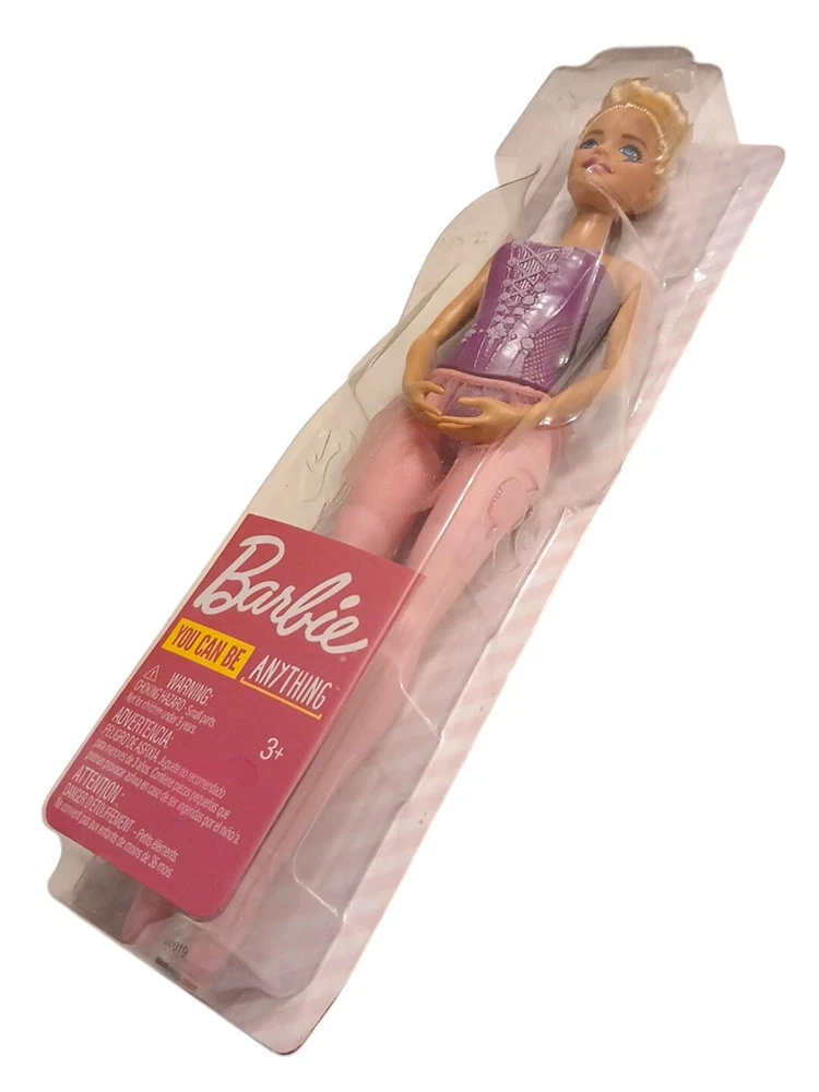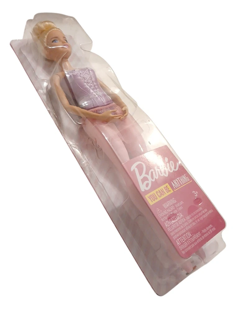 The product is a Mattel Barbie "You Can Be Anything" doll representing a blond ballerina. Standing at 12 inches tall, the Barbie doll features a light complexion, blonde hair, and a multicolor outfit, including a pink and purple tutu. The doll is part of the Career Barbie product line, reflecting the theme of fantasy and encouraging children to imagine themselves in various careers. This original Barbie doll is suitable for all occasions and is designed for youth aged children.