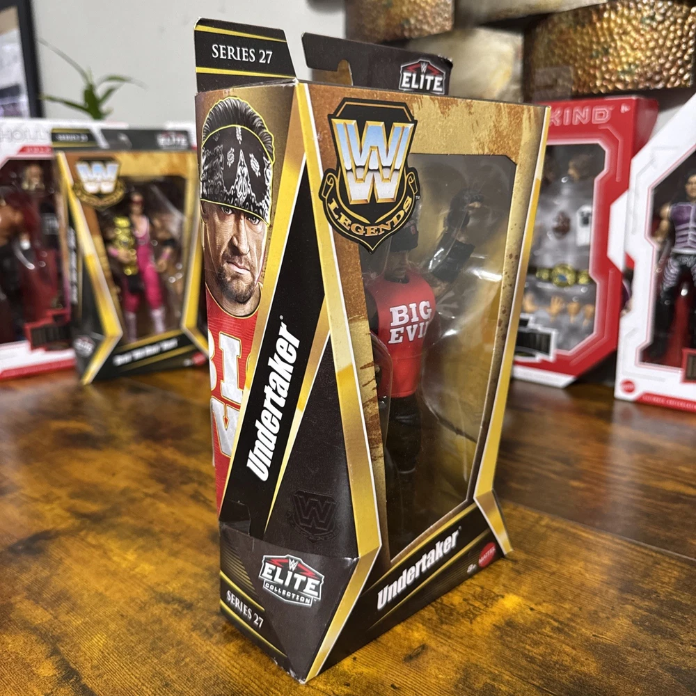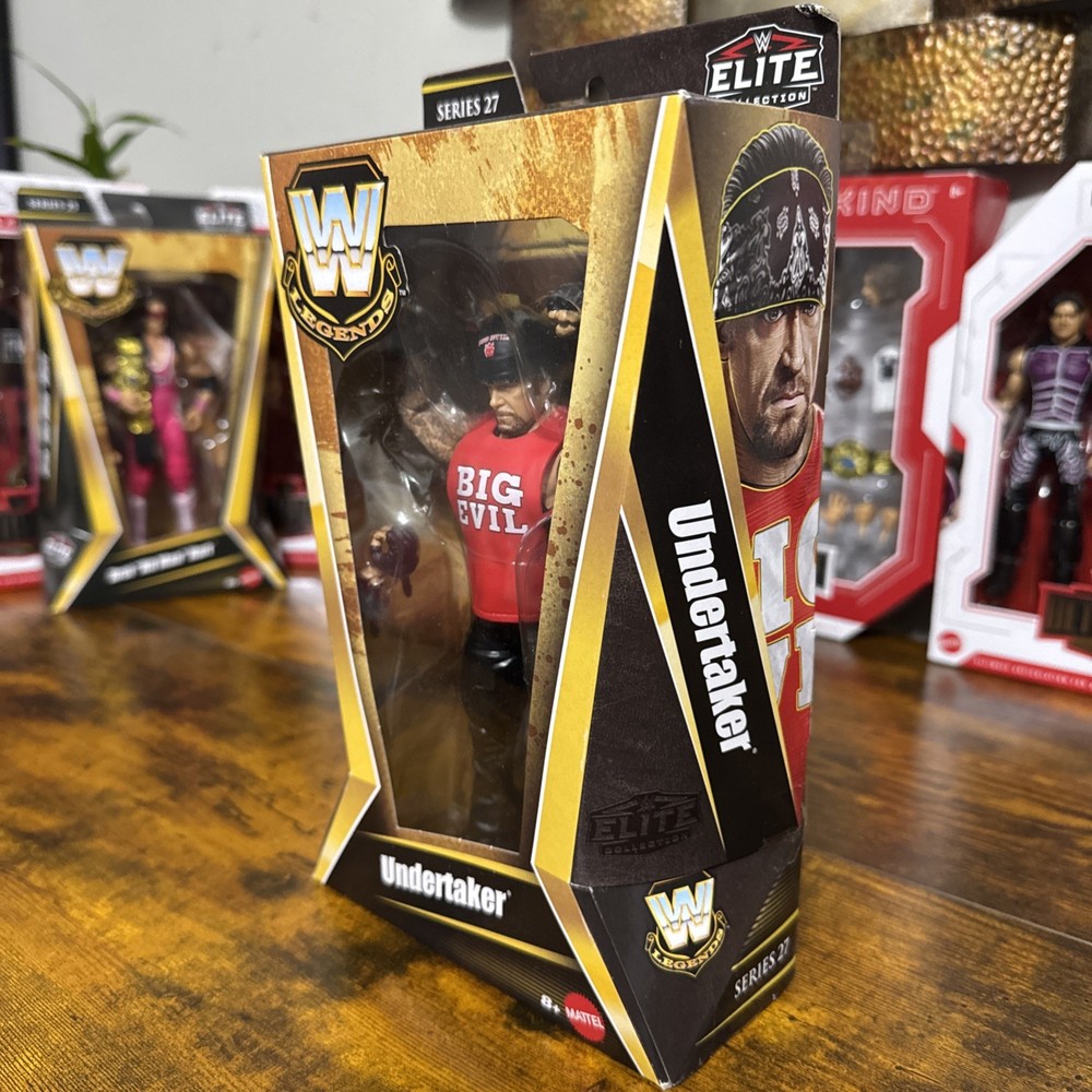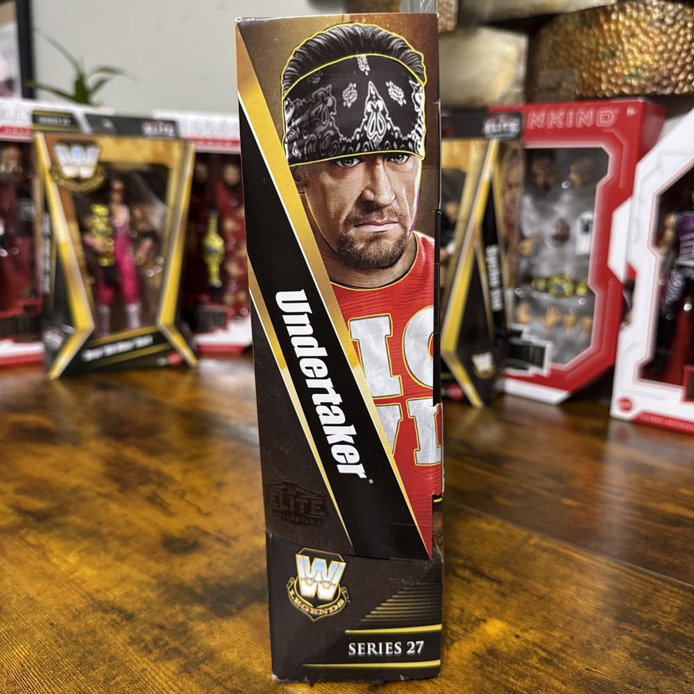 The product is a Mattel WWE Elite Legends Series 27 Undertaker action figure, standing at 10.5 inches tall and weighing 0.550 lbs. This collectible item showcases the iconic WWE character Undertaker, known for his American Bad Ass persona. Produced in Vietnam, this action figure is a must-have for fans of wrestling and the WWE franchise.
