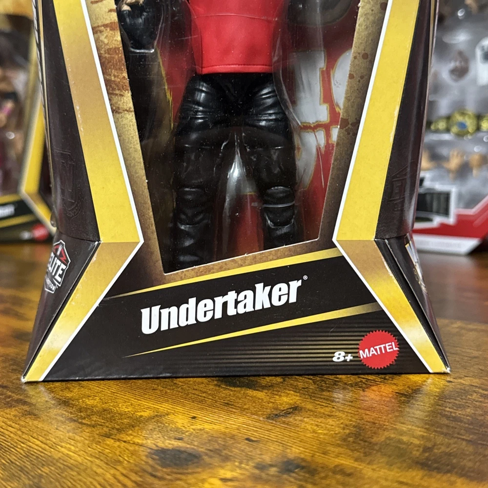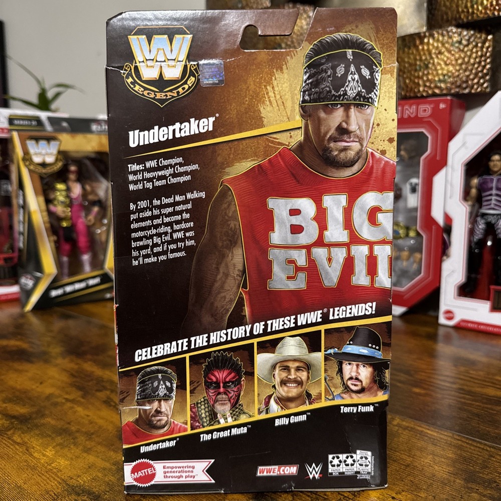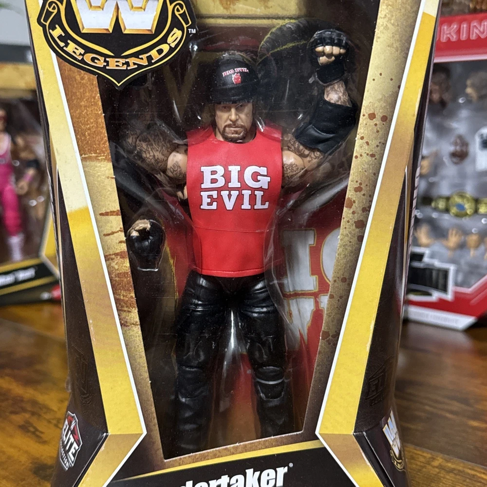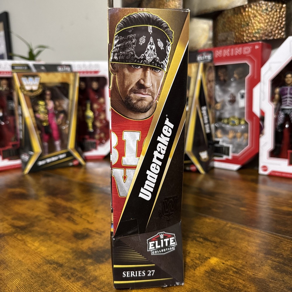 The product is a Mattel WWE Elite Legends Series 27 Undertaker action figure, standing at 10.5 inches tall and weighing 0.550 lbs. This collectible item showcases the iconic WWE character Undertaker, known for his American Bad Ass persona. Produced in Vietnam, this action figure is a must-have for fans of wrestling and the WWE franchise.