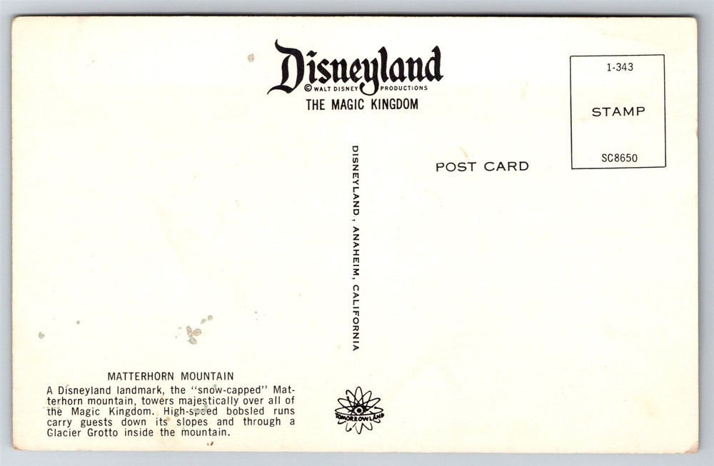 This vintage Disneyland postcard is a must-have for collectors and fans! The vibrant image of the Matterhorn Bobsleds captures the magic of the park perfectly. High-quality print, standard size, and fast shipping make it a great purchase. Seller is friendly and ensures satisfaction—highly recommended for any Disney enthusiast!