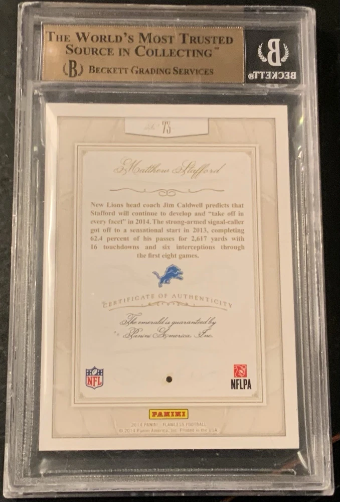 This is a rare and highly sought-after Matthew Stafford 2014 Flawless Emerald trading card, graded 9.5 by Beckett Grading Services (BGS). The card features the Detroit Lions quarterback in his original team and is part of the 2014 Panini Flawless set. This sports trading card is a must-have for any collector or fan of the National Football League (NFL). It is a parallel/variety card, with a print run of 5/5, and includes memorabilia and an insert. Don't miss your chance to own this exceptional piece of sports history.