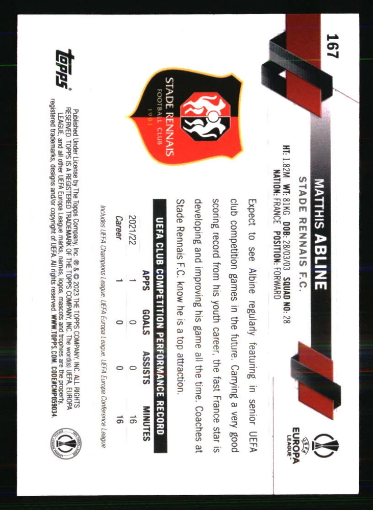 Year Manufactured: 2022 Season: 2022 Player|Athlete: Matthis Abline Graded: No Team: Stade Rennais FC Sport: SOCCER Manufacturer: Topps Autographed: No Card Number: 167 Type: Sports Trading Card Set: 2022-23 Topps UEFA Club Competitions 1st Edition