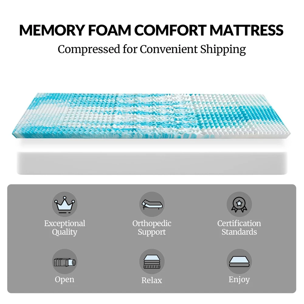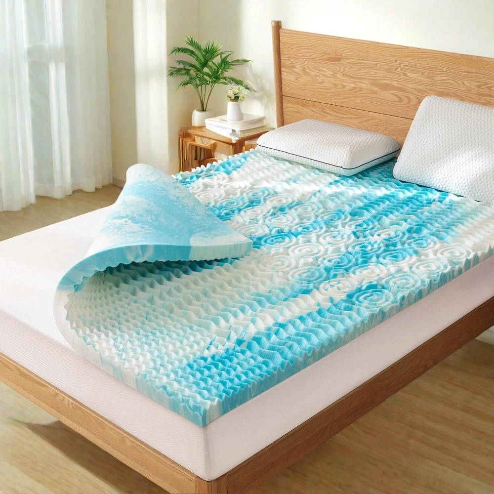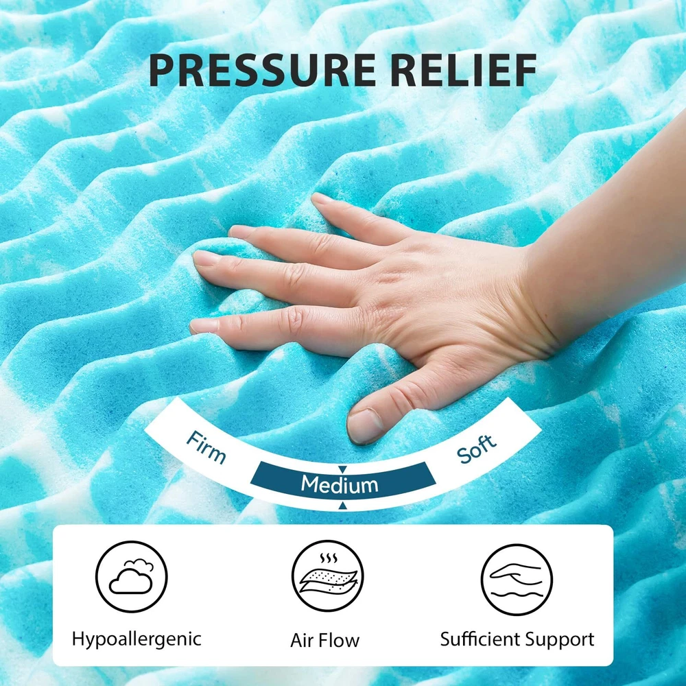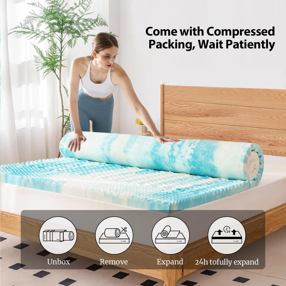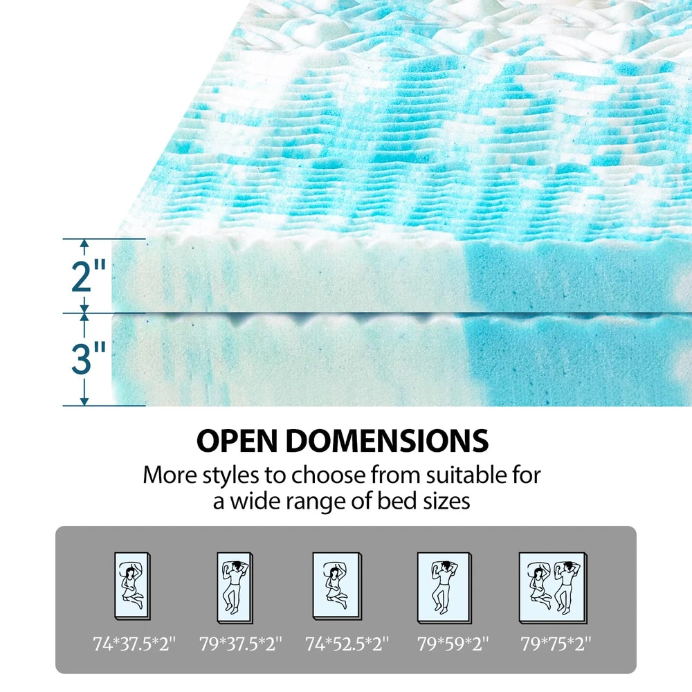 5-Zone Pressure : This mattress topper features a unique 5-zone design that provides tailored support for your head, neck, shoulders, back, hips, and legs, effectively relieving pressure points and enhancing sleep quality. Cooling Infusion: Infused with , this cooling memory foam mattress topper actively disperses heat and improves airflow, making it an ideal choice for sleepers who prefer a cooler sleeping environment. Supportive Comfort: Made from CertiPUR-US certified high-density memory foam, this memory foam mattress topper offers excellent support while reducing discomfort, ensuring a cozy and stable sleep experience every night. Versatile Upgrade Solution: Easily placed on top of an existing mattress, this mattress topper revitalizes older beds by providing additional softness and support, extending their lifespan and improving overall comfort. Quick Recovery Time: The mattress topper arrives compressed; simply lay it flat in a well-ventilated area for 24-48 hours to allow it to fully expand to its original size, ready for immediate use.