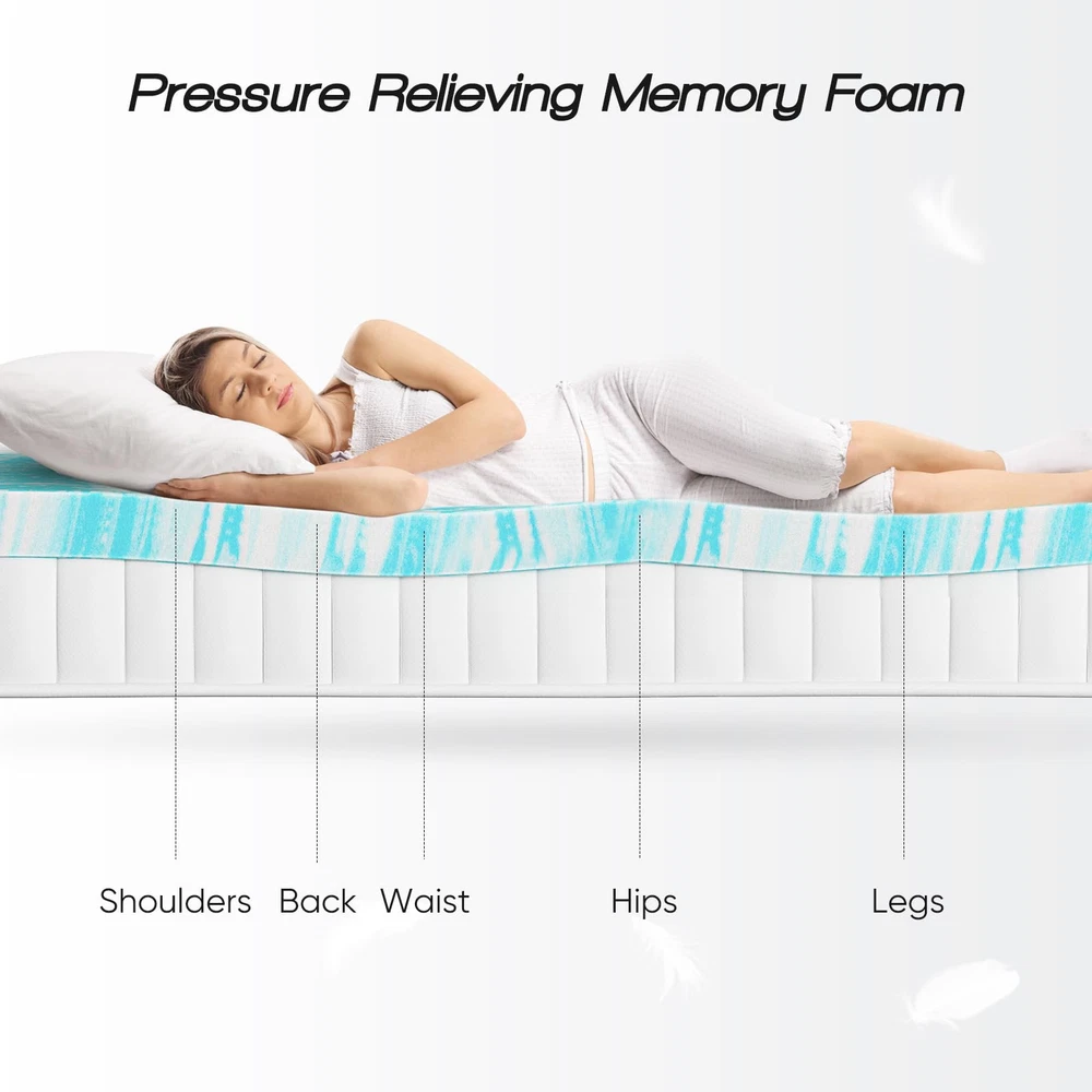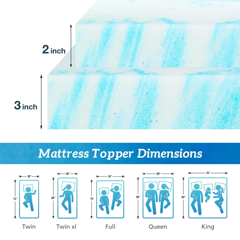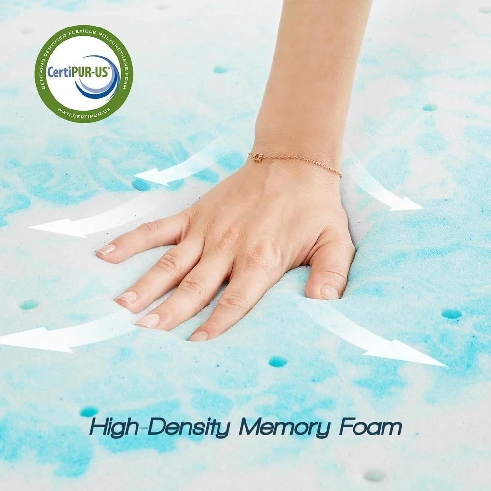 Pressure-relief Foam Topper - The memory mattress topper is designed with ergonomic optimization for various body parts, ensuring it conforms to different body curves and shapes. It effectively distributes body pressure evenly, allowing for comfortable adaptation to different sleeping positions and ultimately enhancing sleep quality. Cooling Gel Distribute Heat - Our mattress topper is skillfully designed using a cooling gel bead injection and vortex technology, precisely engineered to reduce heat and enhance airflow. This thoughtful design ensures that individuals experience a refreshing coolness and superior air permeability, promoting a delightful sensation of freshness. Quality Material - Crafted using CertiPUR-US certified materials. Following a thorough analysis conducted by an independent and certified testing laboratory, its content, emissions, and durability surpass the standard requirements. This guarantees an exceptional level of safety and friendliness, particularly for individuals with highly sensitive skin. Rejuvenate Your Old Mattress - Crafted using high-density memory foam, showcasing exceptional support. Even after numerous uses, it retains its original, like-new feeling, resembling a brand new mattress. Foam toppers make your mattress more comfortable. If a mattress is too firm, a topper will give it a softer feel while maintaining support. The thicker the topper is, the more it changes the mattress's feel. Easy Set Up - The cooling mattress boasts remarkable elasticity and resists deformation effectively. Installing our mattress topper is effortless. The memory foam topper is compressed and packed for easy transportation. So please put it in a ventilated place for 24 hours and let it return to its original size.In addition, please do not leave the sponge in the sun, it will turn yellow.