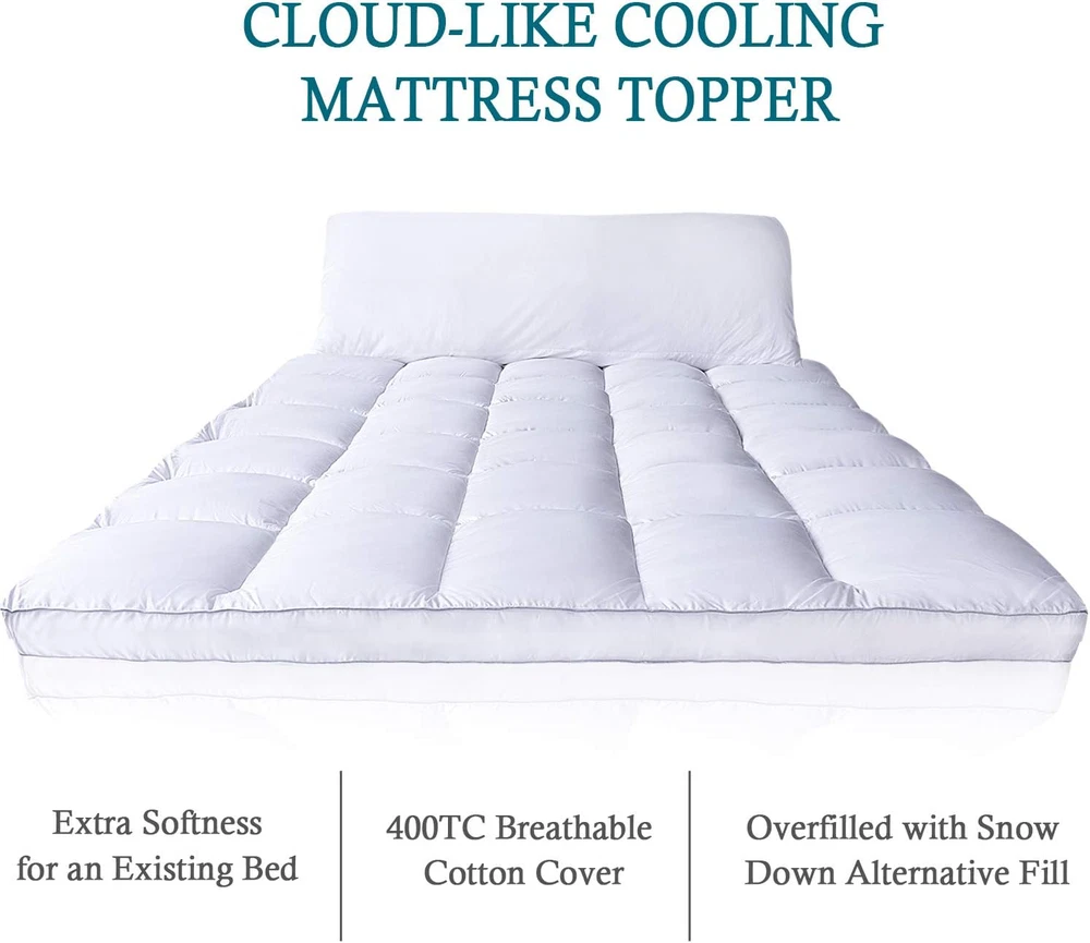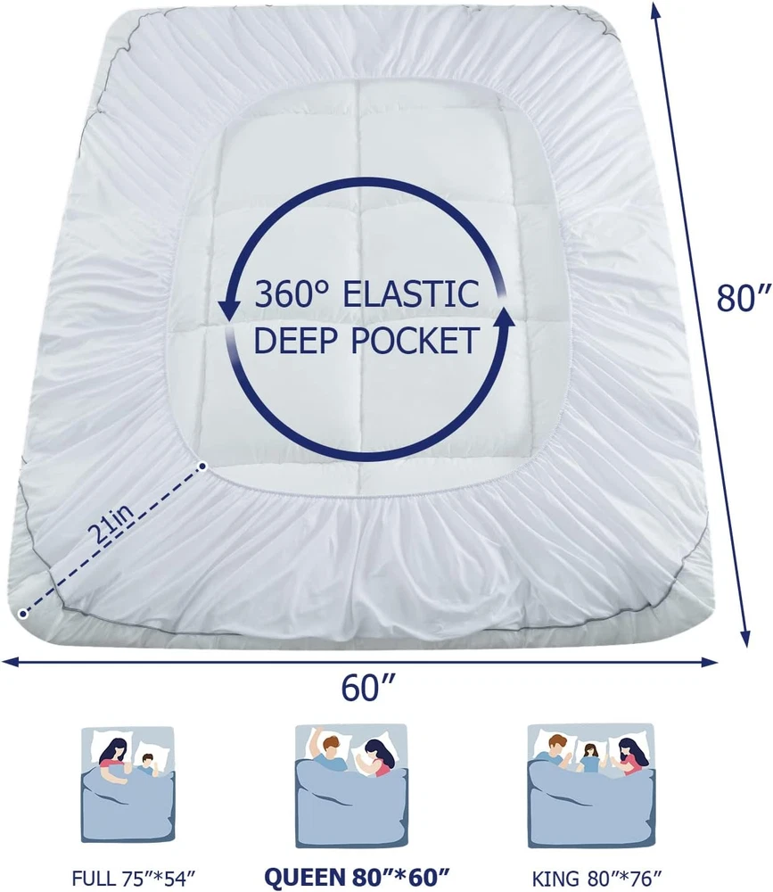 Store New Arrivals Add to Favorite View Feedback Contact Mattress Topper Queen, Cooling Plush Bed Thick Pillow Top Pad, Hotel Quality down Alternative for Queen Size with Deep Pocket,Soften Hardened Bed Description Closure Type Pull On Color Classic White Thread Count 400 Product Dimensions 80 x 60 x 21 inches Material Snow Down Alternative Water Resistance Level Not Water Resistant Fabric Type 400tc Top / 7d Down Alternative Filling Item Weight 9.53 pounds Age Range (Description) Adult Department Bedding Size Queen Special Feature Plush Pillow Top Country of Origin China Instantly Refresh Any Mattress: Enjoy this cloud-like mattress topper with the overfilled plush down alternative, which exhibits a fluffy loftiness and softness, provide ultra comfort for all sleeping positions. Sleeping in the clouds is easy without spending a fortune on a new mattress. No need to throw away your old firm mattress! Top Comfort and Best Thickness: This hotel-quality mattress topper features an overfilled cushion providing the best relief and support for the pressure points like your shoulders, back, and hips. Based on expert recommendations, we upgraded the mattress pad topper to 50% thicker than comparable products, filled with more down alternative for optimal support. The over 3-inch thickness of the feather bed topper reaches the human comfort value, once lying down you can let the body relax. Farewell to Sweat: Down alternative bed topper provides natural in airflow and temperature regulation, maximizes comfort regulation for the restorative sleep possible. 400TC fabric surface makes you keep cooling and breathable during the long night. No odor, no noise. Allows you to enjoy a sound sleep worry-free. Non-Shifting Elastic Pocket: The 360° fabric sides easily stretch to fit mattresses up to 21" thick. This pillow top mattress topper can be easily placed on most mattresses, whether it's a regular mattress, a waterbed, or a memory. Unique 3D baffle box stitching helps each box fill even and prevent moving for elevated comfort. You can release your various sleeping positions freely. A Must for Renters: Our down mattress toppers are cheaper than mattresses, and easier to store and move, making them ideal for renters and those who need to move frequently. What's most, we offer a 30-night trial service. Try Marine Moon cooling mattress topper with no-risk. You will be surprised by the most comfortable sleep. Product Description Why Choose MARINE MOON Mattress Topper? 1 EXTRA THICK 2 NEVER SLIDE 3 PRESSURE POINTS RELIEF LYING ON CLOUD-LIKE TOPPER,LOST YOURSELF IN SWEET DREAMS Make your bed soft as marshmallow, enjoy comfort sleep anytime! The video showcases the product in use. The video guides you through product setup. The video compares multiple products. The video shows the product being unpacked. More sleep options for you! Add to Cart Add to Cart Customer Reviews 4.4 out of 5 stars 2,584 4.5 out of 5 stars 75 4.3 out of 5 stars 5,426 4.0 out of 5 stars 205 4.0 out of 5 stars 205 4.4 out of 5 stars 2,584 Price $79.99 $ 79 . 99 $45.99 $ 45 . 99 $56.09 $ 56 . 09 — — — Stable Type Deep Pocket(Up to 21'') NA Elastic Strap(Up to 18'') Elastic Strap(Up to 18'') Elastic Strap(Up to 18'') Deep Pocket(Up to 21'') Special Feature Soft Pillow Top Plain Style Soft Pillow Top Buffle Pillow Top Cooling Pillow Top Reversible Top(Cool+Regular) Available Size T/F/Q/K (4 Size) Q/K (2 Size) T/TXL/F/Q/K/CK (6 Size) T/F/Q/K (4 Size) Q/K (2 Size) F/Q/K (3 Size) Outer shell Material Microfiber Microfiber Microfiber Microfiber Nylon Fabric Top Nylon Fabric Top/Microfiber Inner Filling Material 7D down alternative cotton 7D down alternative cotton 7D down alternative cotton 7D down alternative cotton 7D down alternative cotton 7D down alternative cotton ABOUT US We offer the best prices around on high quality products. Our E-store includes media such as books, movies, music and games while offering electronics, toys, sporting apparel, clothing, tools, general home, garden items and more. SHIPPING We are always working hard to ensure your package arrives as soon as possible. Please understand that some factors like weather, high postal traffic, and the performance of shipping companies are outside of our control. We offer free shipping to the lower 48 states and ship within 2 business days of payment, usually sooner. We do not accept P.O. Boxes. Please provide a physical address. For shipping outside of the continental USA, we only use eBay's Global Shipping Program.The item is shipped to KY and then sent to the rest of the world. International customers are responsible for all duties and taxes. Continue to check out in order to calculate costs for shipping the item to your country. Messages regarding eBay's Global Shipping Program MUST be directed at eBay EXCLUSIVELY. RETURNS We offer a 30-Day Return Policy on items which you are not completely satisfied with. You have the option for a full-refund or an exchange of the item. No returns are available on items shipped outside of the USA. PAYMENT We accept PayPal. CONTACT US This page content is yet to come Please ad us to your favorite seller and visit again later Thank You CUSTOMER SATISFACTION We try our very best to make sure every customer is completely satisfied. If there's a problem, message us! We're happy to help. WE ACCEPT Copyright © 2021 AutoDS. | All Rights Reserved