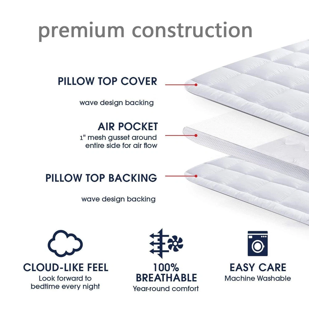 Rejuvenate your old mattress Regardless of whether your current mattress is new or old, nothing is worse than sleeping on a bed that doesn't provide the support and comfort that you need to get a good night's rest. Giving your sleep space new life with Mattress Topper is the perfect upgrade no matter if you have an old mattress that is no longer supportive or you just want to add an extra layer of cushy support. Sleep Like a Baby with Mattress Topper Relax on plush topper that makes it easy to fall and stay asleep. This overfilled mattress topper features a blend of premium microfiber to add a cozy surface to your mattress. It’s super soft and breathable, allowing air to freely flow through the fabric while maintaining its shape. SIZES AVAILABLE Twin: 39"x75" Twin XL:39"x80" Full:54"x75" Short Queen:60"*75" Queen:60"x80" King: 76"x80" PS: Because the mattress topper is vacuum packed. normally, it need take 1 to 3 days to recover its original thickness. LUXURY DOWN ALTERNATIVE Fill: Extra thick soft premium mattress topper provides unbeatable comfort and it is like sleeping on a cloud.new design fabric cover creates a soft touch feeling, sleep like a baby HIGH STRETCH ANCHOR BANDS to 21inch: 4 double Corner Elastic Breathable Premium mattress protector fits up perfectly to 21inches,help keep plush mattress topper in one place NEW FABRIC AND DESIGN: New improved premium 3D fabric and mesh gueest to give a massaging effect while you sleep.this topper has gone through several improvement base on millions of feedback to meet your high standard demand. Great for back/shoulder pain REFRESH IT: Over filled mattress topper was vacummed for convenience, please slightly shake and pat the tope for the maximum fluff, and place the topper on the flat surface for 24 hours AFTER SALES GUARANTEE: Please feel free to contact us if there's any question about the mattress topper