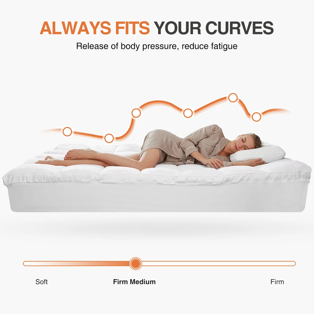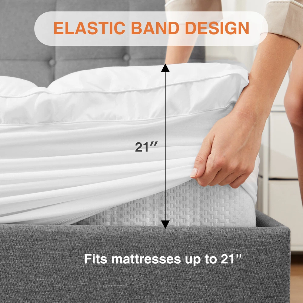 Product Description This pillowtop mattress topper full is filled with 5D virgin fibers to ensure comfort and thickness, providing adequate support for the body, distributing weight evenly, and preventing sagging, making the mattress covers ideal for side, back or stomach sleepers. There are four sizes for you to choose: Queen, Full, Twin, King, and has a soft and comfortable fabric that wicks away sweat and breath, reducing the stuffiness associated with memory foam mattresses or foam mattresses. In addition, the soft pillow top mattress features a unique square quilting design that secures the padding in each square and is not easy to shift. This cool king topper can fit 8-21" high mattresses on the market, the elastic band design can wrap it 360 degrees, and no matter what activities you do on the bed, the mattress can stay still. In addition, the neat stitching improves durability and allows you to wash the hotel mattress topper many times without warping or tearing it. No more worrying about stains on your mattress! This down mattress topper of ours can easily solve these problems, you just need to put it into the washing machine, and after washing and drying bed topper will be restored as before, become clean and fluffy, and very easy to maintain. This mattress cooling topper has been certified by OEKO-TEX Standard 100, safe, comfortable, skin-friendly, and hypoallergenic, it is a great gift for yourself, family, and friends. We also have an excellent customer service team, if you have any questions, please feel free to contact us. We want to give you the best shopping experience with this extra-thick mattress. Color White Size Twin/Full Fabric Type Cotton/Microfiber Special Feature Machine/Hand Washable Closure Type Pull On Product Care Instructions Machine Wash Water Resistance Level Not Water Resistant Age Range (Description) All Age Material Cotton/Microfiber Product Dimensions 75 x 39 x 2 inches / 75 x 54 x 2 inches Item Weight 5.2 lb / 7.36 lb Package include: 1* Mattress Topper