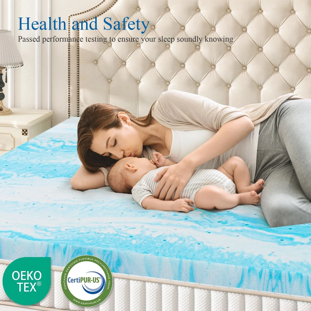 Gel memory foam mattress toppers offer a combination of comfort, support, and temperature regulation, making them a popular choice for individuals looking to improve their sleep quality and overall well-being. 【Support Meets Pressure-relieving and Temperature-regulation for the Best Sleep Ever】The twin mattress topper is made of high-quality memory foam. Specially designed for individuals seeking additional comfort. 【Temperature Regulation】The gel infusion in memory foam helps dissipate body heat, preventing overheating during sleep. Mattress topper can provide a cooler and more comfortable sleeping environment, especially for those who tend to sleep hot. 【Pressure Relief】Mattress topper conforms to the body's contours, which helps distribute weight evenly and alleviates pressure points. This can be particularly beneficial for individuals with joint pain, back pain, or other musculoskeletal issues. 【Ventilation and Refreshing】The gel memory foam mattress topper has small holes designed for ventilation to promote air circulation and prevent sleeping overheating, to help you get a restful night's sleep. 【CertiPUR-US Certified - Health and Safe】The gel memory foam of the mattress topper is CertiPUR-US certified, to ensure your sleep soundly knowing that it is performance tested and meets standards for content, emissions, and durability.