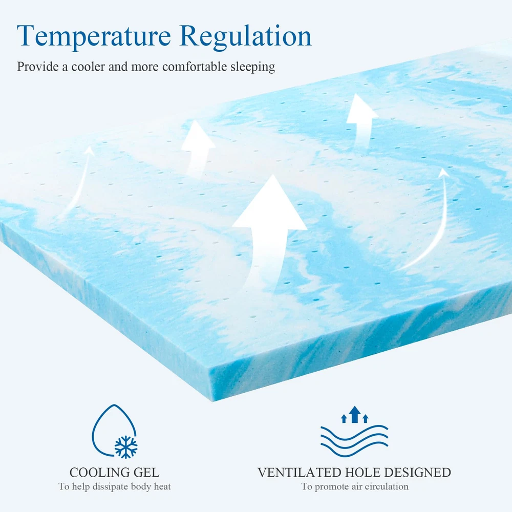 【Support Meets Pressure-relieving and Temperature-regulation for the Best Sleep Ever】The twin mattress topper is made of high-quality memory foam. Specially designed for individuals seeking additional comfort. 【Temperature Regulation】The gel infusion in memory foam helps dissipate body heat, preventing overheating during sleep. Mattress topper can provide a cooler and more comfortable sleeping environment, especially for those who tend to sleep hot. 【Pressure Relief】Mattress topper conforms to the body's contours, which helps distribute weight evenly and alleviates pressure points. This can be particularly beneficial for individuals with joint pain, back pain, or other musculoskeletal issues. 【Ventilation and Refreshing】The gel memory foam mattress topper has small holes designed for ventilation to promote air circulation and prevent sleeping overheating, to help you get a restful night's sleep. 【CertiPUR-US Certified - Health and Safe】The gel memory foam of the mattress topper is CertiPUR-US certified, to ensure your sleep soundly knowing that it is performance tested and meets standards for content, emissions, and durability.