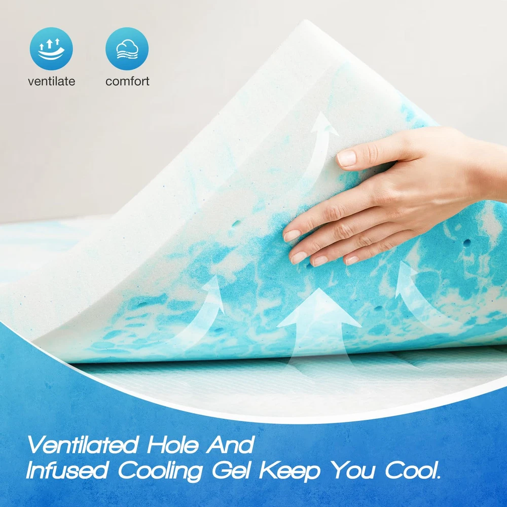 Pressure-relief Foam Topper - The memory mattress topper is designed with ergonomic optimization for various body parts, ensuring it conforms to different body curves and shapes. It effectively distributes body pressure evenly, allowing for comfortable adaptation to different sleeping positions and ultimately enhancing sleep quality. Cooling Gel Distribute Heat - Our mattress topper is skillfully designed using a cooling gel bead injection and vortex technology, precisely engineered to reduce heat and enhance airflow. This thoughtful design ensures that individuals experience a refreshing coolness and superior air permeability, promoting a delightful sensation of freshness. Quality Material - Crafted using CertiPUR-US certified materials. Following a thorough analysis conducted by an independent and certified testing laboratory, its content, emissions, and durability surpass the standard requirements. This guarantees an exceptional level of safety and friendliness, particularly for individuals with highly sensitive skin. Rejuvenate Your Old Mattress - Crafted using high-density memory foam, showcasing exceptional support. Even after numerous uses, it retains its original, like-new feeling, resembling a brand new mattress. Foam toppers make your mattress more comfortable. If a mattress is too firm, a topper will give it a softer feel while maintaining support. The thicker the topper is, the more it changes the mattress's feel. Easy Set Up - The cooling mattress boasts remarkable elasticity and resists deformation effectively. Installing our mattress topper is effortless. The memory foam topper is compressed and packed for easy transportation. So please put it in a ventilated place for 24 hours and let it return to its original size.In addition, please do not leave the sponge in the sun, it will turn yellow.
