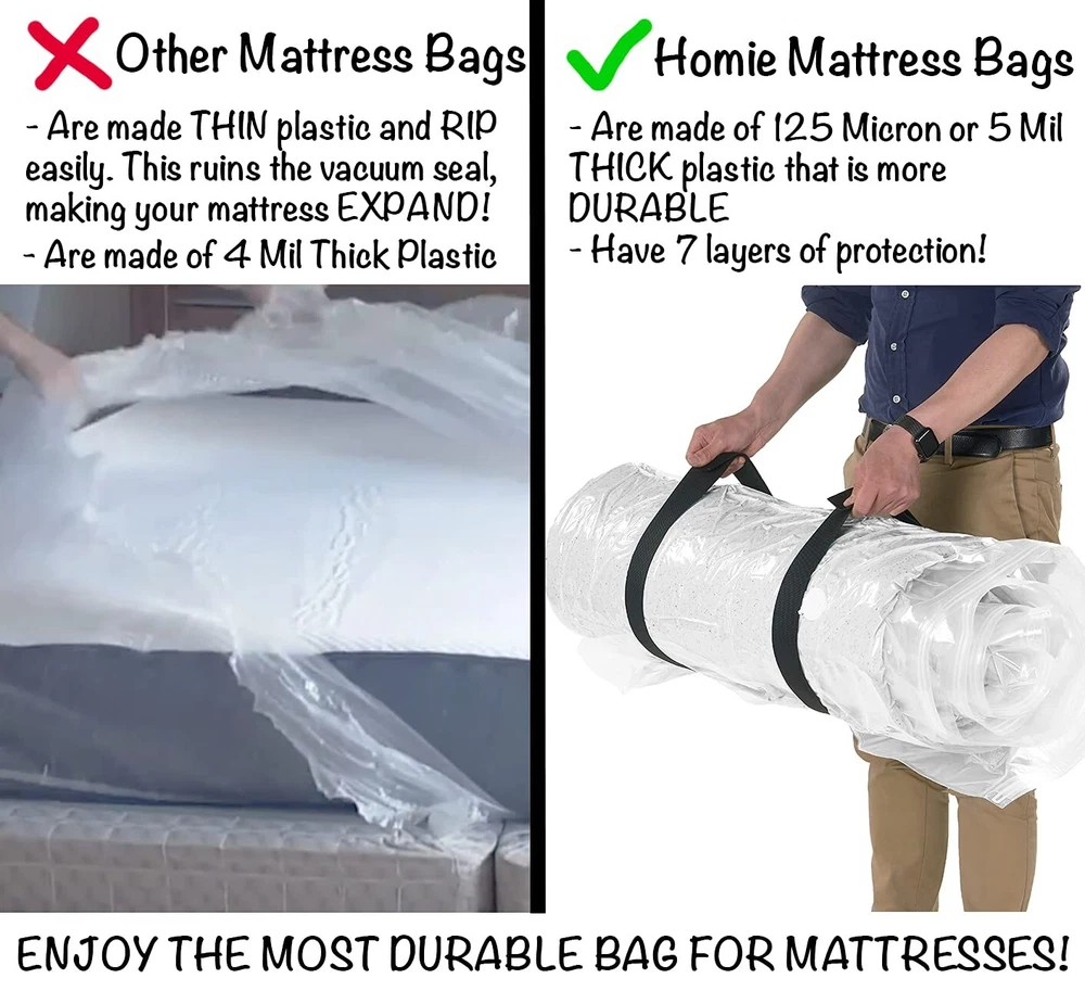 Save Money On Moving Costs - Rather than having to rent a big truck to fit your mattress or movers, save money and do it yourself by being able to fit your mattress in your car! Compress Your Mattress - With the vacuum seal technology, and household vacuum cleaner can be used to compress your mattress to a fraction of its size. Just like when it was first delivered to you. Protect Your Mattress - An added benefit of the airtight seal that is formed when closing this bag is that it protects your mattress from dust, allergens, moisture, and bugs, keeping you mattress clean and safe during storage. Durable Construction - The mattress bag was made with durability in mind. The leakproof valve, double zip seal, and 100 micron (4 mil) thick plastic are premium quality. Reusable Design - The mattress bag is made with all reusable components. With careful use, this bag can be used multiple times and save you money anytime you move the mattress. Simply open and close the zip lock as many times as you need. PATENT PENDING β π¦ππ₯ππ‘π π¬π’π¨π₯ π ππ§π§π₯ππ¦π¦ - Compress your foam or inner spring mattress with vacuum seal technology to the original size it came packed to you. This makes moving and returning it super easy! Works with mattresses from all the foam mattress and inner spring mattress companies that ship their mattress in a box. β π¦ππ©π π π’π‘ππ¬ πͺππππ π π’π©ππ‘π π’π₯ π₯ππ§π¨π₯π‘ππ‘π - Mattresses can be a pain to move or return, they are big and bulky. By compressing the mattress you can save on moving costs by not having to rent a truck to move it. Just move it in your car for free! β πππ₯π§ππππ§ π£π₯π’π§πππ§ππ’π‘ - The airtight seal protects your mattress against moisture, dust and dirt. With a double zip seal, this mattress bag ensures a good seal. β π₯ππ¨π¦ππππ πππ - With proper care, this bag can be reused for multiple moves as it is made with durable components. This will save you a bunch of money in the long run. β ππ¨π₯ππππ π£πππ¦π§ππ - This bag is made with durability in mind, it is 125 microns or 5 mil thick to ensure reliability.