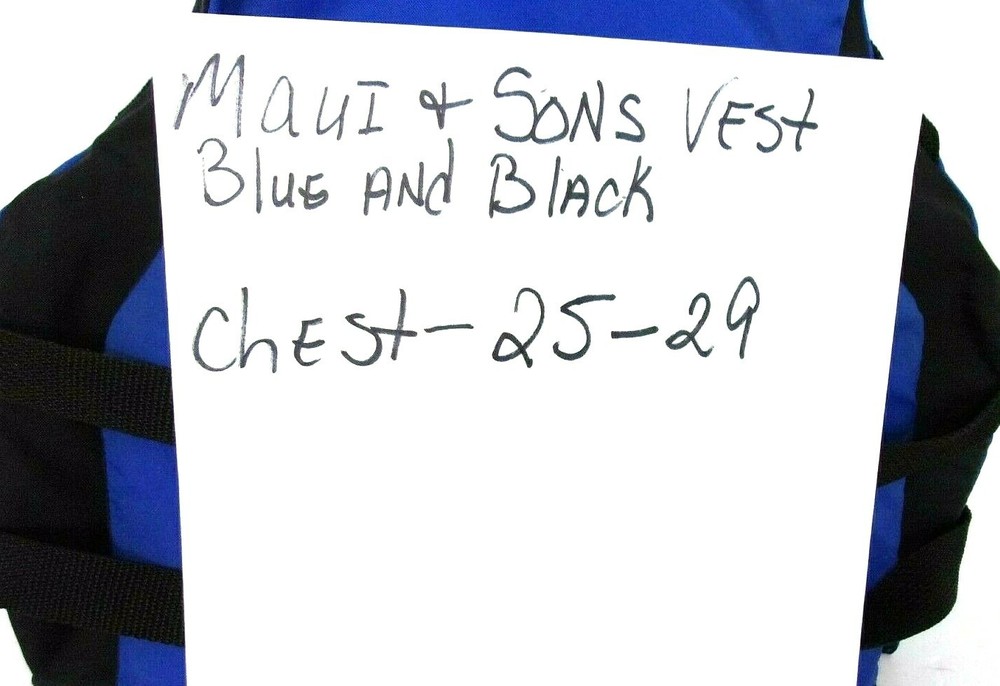 Maui And Sons Life Vest Jacket Boys Girls Size 25-29 Blue Black Youth Chest Please Read The Return Policy,Descriptions And 1 Day Handling Times Carefully Before Purchasing *** ATTENTION !!! My Best Offer Is Set At $3.00 To $10.00 Less Than The Fixed Price *** *** All Photo's Are Of The ACTUAL Item(S) That You Will Receive Guaranteed *** *** Ships From The U.S *** (1 Or Same Day Handling Time ) **PLEASE READ!! *** Saturday-Cut Off Handling Time Is 7 Pm Eastern Standard Time(Will Ship On Monday) Sunday - Cut Off Handling Time Is 7 PM Eastern Standard Time(Will Ship Next Day On Monday) Mon.-Fri. - Cut Off Handling Time Is 1 PM Eastern Standard Time(If Ordered After 1 PM Will Ship Next Day) *** If Order On A Major Holiday We Will Ship The Day When The Post Office Reopens *** *** Ships USPS Priority Mail Package Delivery (Bubble/Paper) *** (U.S) *** ShipsEbay International Standard Delivery (Bubble/Paper) *** ( International ) Item Description : Maui & Sons Life Vest Jacket For Boys Or Girls Blue/Black Chest Size 25-29 User Weight 50-90 LBS. **Be Sure To Inspect Your Item Immediately Upon Arrival Please Leave Positive Feedback If You Are Happy And Satisfied With your Purchase If By Any Chance That The Item Is Not As Described Please Contact Us So That We Can Fix It...Please Report The ERROR To Us. Condition- *** Pre-Owned *** Excellent Condition *Location : From A Smoke Free And Pet Free Home ! *Payment : ALL TRANSACTIONS MUST BE HANDLED THROUGH EBAY ONLY!! *Shipping : We Ship All Items 1 Or Same Business Day Of Payments Clearing (Including Weekends And Holidays) We Ship Worldwide * Return Policy:Please Read Carefully !! IF WE OFFER FREE RETURNS !!! We accept a return for any reason during 30 days after receiving the item Undamaged,in resalable condition and original package for a refund less ALL shipping costs plus restocking fee 10%. Items That are Broken,Taken Apart,Scratched from a smoking environment will not get a refund. Please be gentle with the item. We Provide you with Descriptions; If you need more information about the item ..Please don't hesitate to ASK ! We will be more than happy to help you to make the right purchase. HAPPY AND SATISFIED CUSTOMERS ARE OUR # 1 PRIORITY !!! ***** Contact Us ****** Please Feel Free To Contact Us With Any Questions About The Item Thank You For Stopping By And Have A Great Day!!