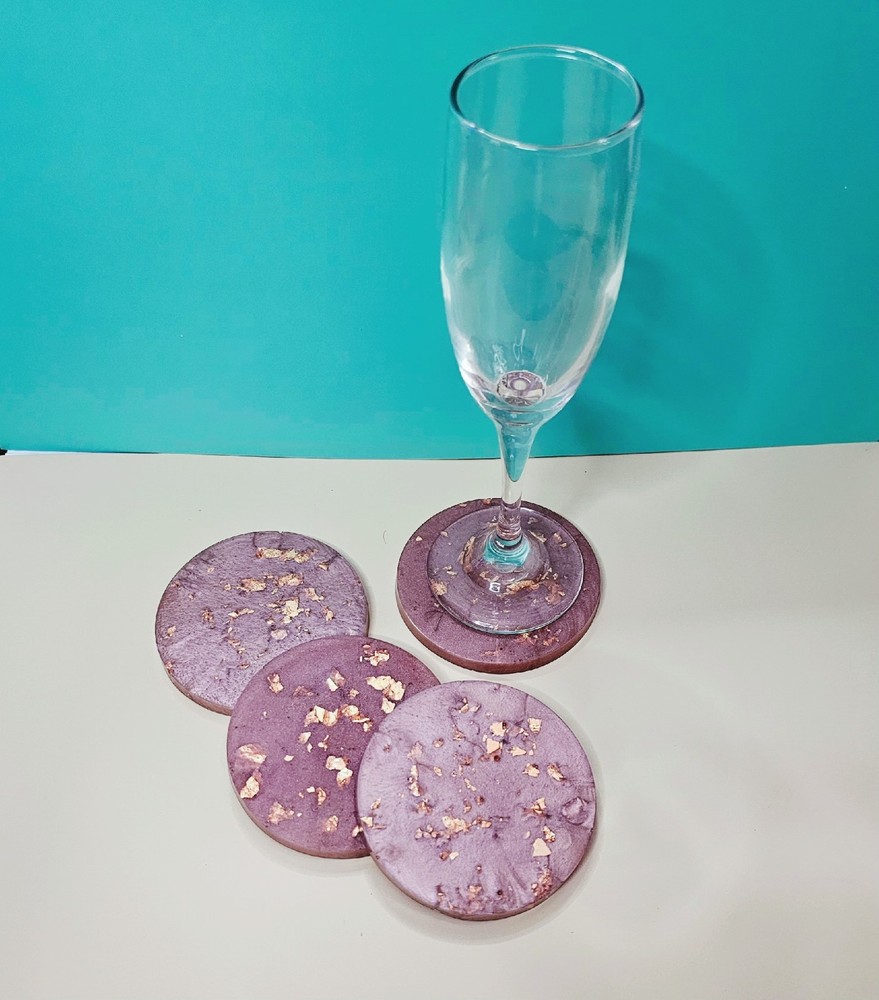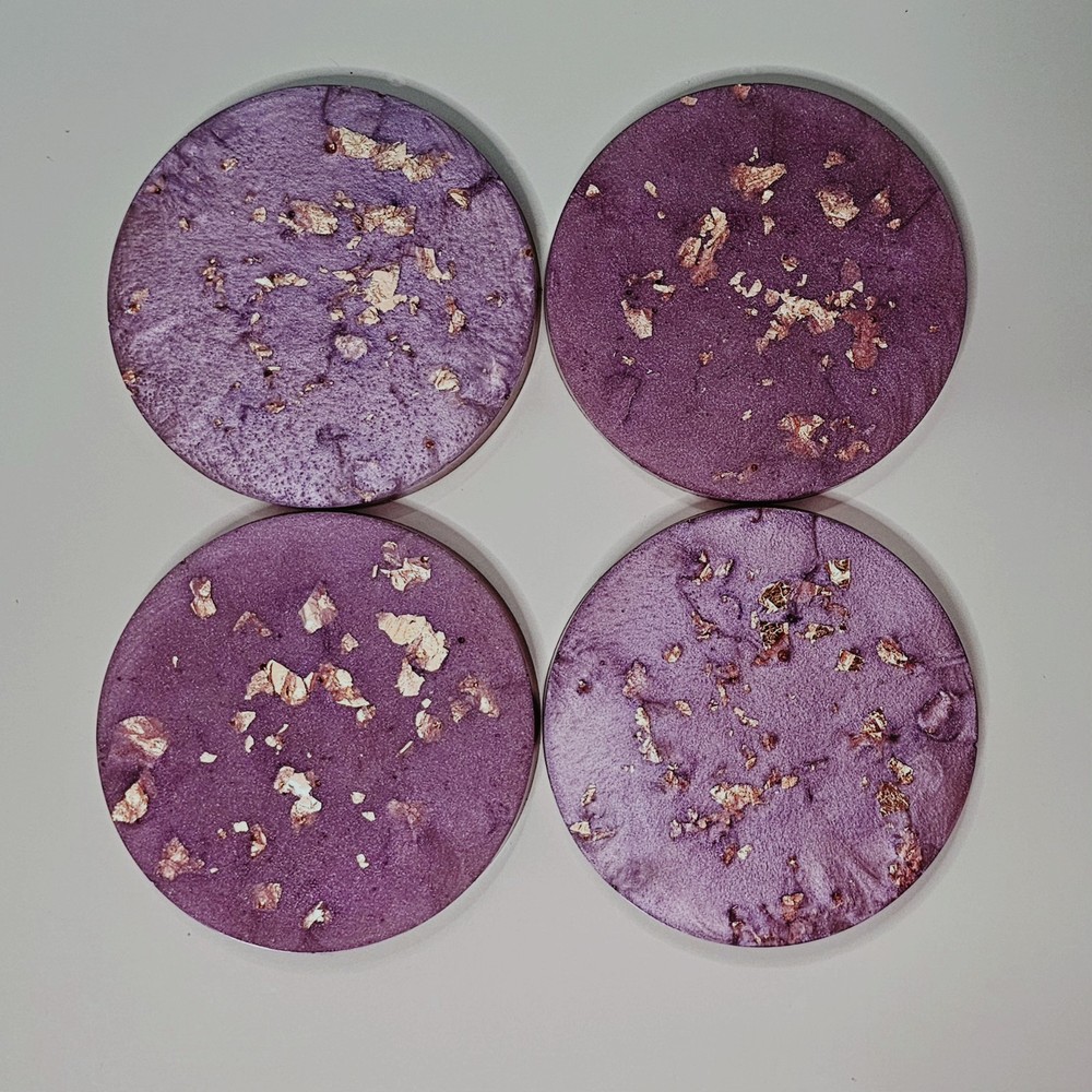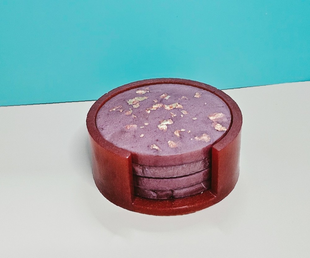 This 5-piece set of round handmade coasters in mauve and rose gold is perfect for any occasion. Made with mica powder, foil flakes, and epoxy resin, these coasters are lightweight, stackable, and feature a modern design. They come with a rack/holder and are slip-proof, making them both functional and stylish. Handmade in the United States, these coasters are 4 inches in diameter and adorned with an all-over pink color that adds a touch of elegance to your home decor.