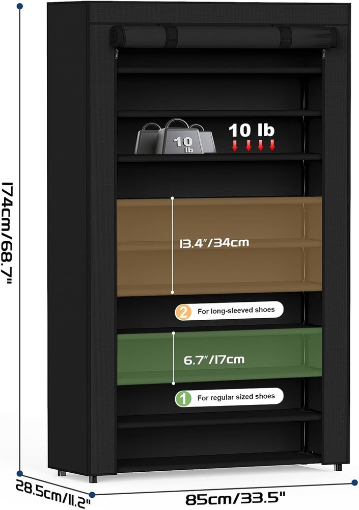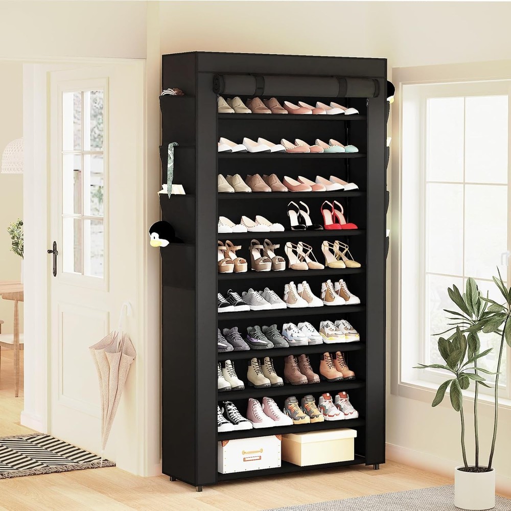 LARGE CAPACITY SHOE RACK: This 10-tier shoe rack measures 33.5'' W x 11.2'' D x 68.7'' H, offering ample storage space for your shoes. Its design helps keep your floors clutter-free and makes organizing your footwear a breeze SHOE RACK WITH DUSTPROOF COVER: This tall shoe rack with cover features a dustproof cover, ensuring your shoes stay clean and protected from dust and pets. The closed design is suitable for maintaining a tidy and hygienic shoe cabinet STURDY SHOE ORGANIZER: Made from a metal frame, non-woven fabric, and durable plastic connectors, this shoe organizer is sturdy and built to last. It provides excellent carrying capacity, making it a reliable shoe closet solution for your home FUNCTIONAL SHOE STORAGE: With adjustable tier, this shoe storage allows for easy organization of various shoe types, including sneakers, heels, boots, and sandals. The removable tier feature offers flexibility, and the 8 pockets are ideal for storing ties, keys, wallets, and small items SPACE-SAVING SHOE CLOSET: This vertical shoe rack efficiently utilizes space, making it suitable for small areas. Its free-standing design is ideal for use in closets, front door entrances, garages, hallways, dorms, bedrooms, living rooms, or as a zapateras organizer for entryways