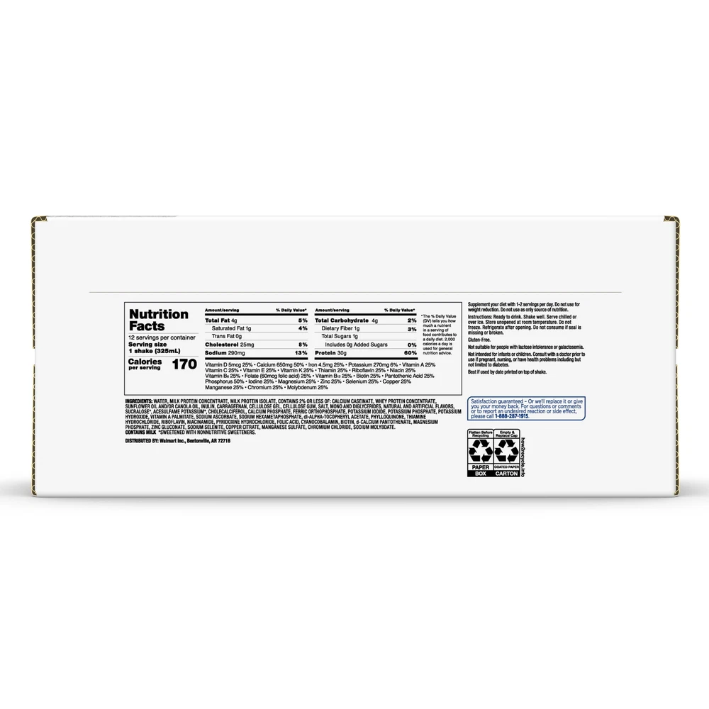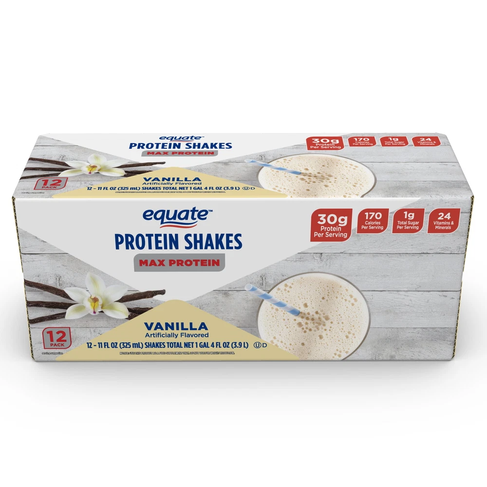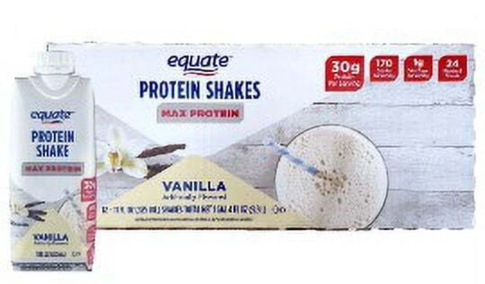 Product details Equate Max Protein Nutrition Shake, Vanilla Flavored, 12 Pack (11 fl oz). Stay energized and refuel your body with Equate Protein Shakes. These ready-to-drink shakes are perfect for busy lifestyles. Packed with essential nutrients and a delicious taste, they provide the ideal post-workout recovery or on-the-go snack. With Equate Protein Shakes, achieving your fitness goals has never been easier. Enjoy a Equate Vanilla Protein Shake today! Equate Max Protein Nutrition Shake, Vanilla Flavored, 12 Pack (11 fl oz) 30g protein per serving 170 calories per serving 1g total sugar per serving 24 vitamins and minerals Artificially flavored Max protein Vanilla