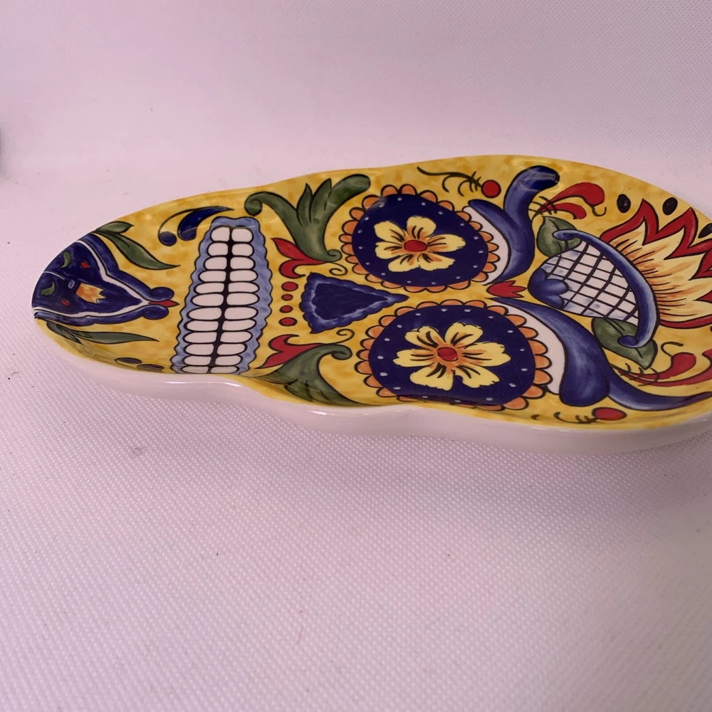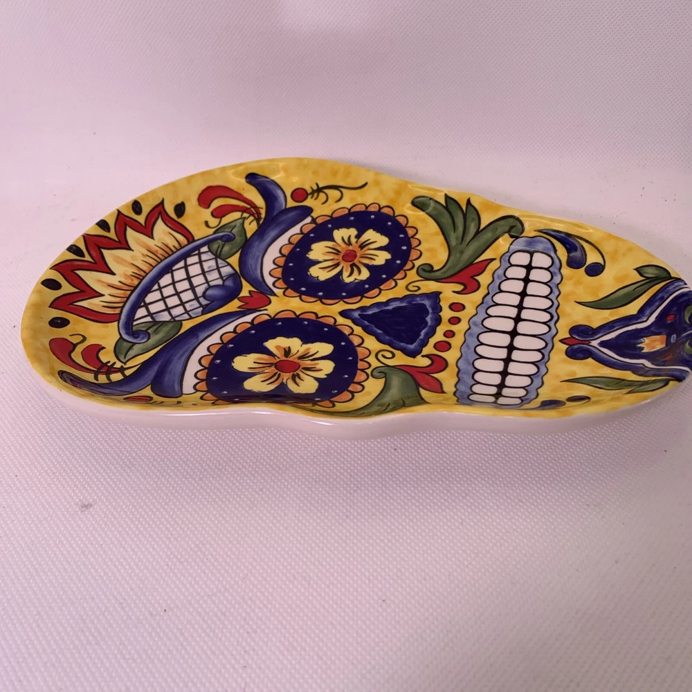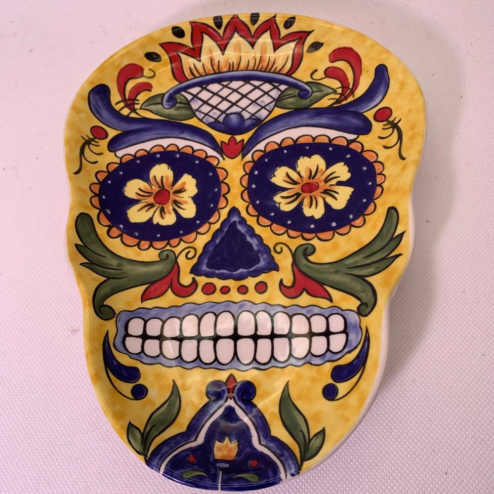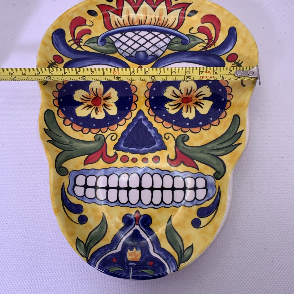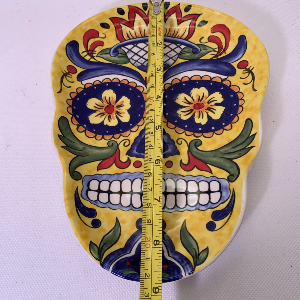 Features:Bright ColorsProduction Technique:PotteryProduction Style:Art PotteryShape:SkullTheme:FlowerPattern:FloralProduct Line:Day of the DeadBrand:MaxceraCountry/Region of Manufacture:ChinaSet Includes:PlateMaterial:CeramicVintage:NoHandmade:YesType:PlateColor:YellowOccasion:Halloween