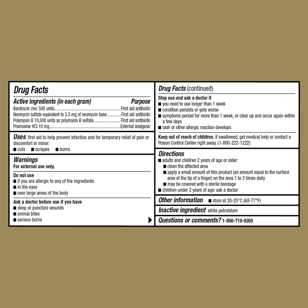 ACTIVE INGREDIENTS: Compare to the active ingredients in Neosporin + Pain Relief OINTMENT CONTAINS: Bacitracin Zinc, Neomycin Sulfate, Polymyxin B Sulfate, Pramoxine HCl DIRECTIONS: adults and children 2 years of age and older: Clean the affected area and apply a small amount (an amount equal to the surface area of the tip of a finger) of GoodSense Triple Antibiotic Ointment on the area 1 to 3 times daily. May be covered with a sterile bandage. Children under 2 years of age: ask a doctor. INJURY: It is a general term that refers to harm caused by accidents, falls, hits, weapons, and more. Injuries can happen at work or play, indoors or outdoors. MAXIMUM STRENGTH: antibiotic ointment that helps prevent infection and relieves pain in minor Cuts, Scrapes and Burns Compare to Neosporin® + Pain Relief active ingredients. First Aid Antibiotic Pain Relieving Ointment active ingredients are bacitracin zinc, first aid antibiotic; neomycin sulfate, first aid antibiotic; polymyxin B sulfate, first aid antibiotic; and pramoxine HCl, external analgesic. Soothes painful cuts, scrapes, and burns. Triple antibiotic infection protection. Helps skin heal to look healthy.