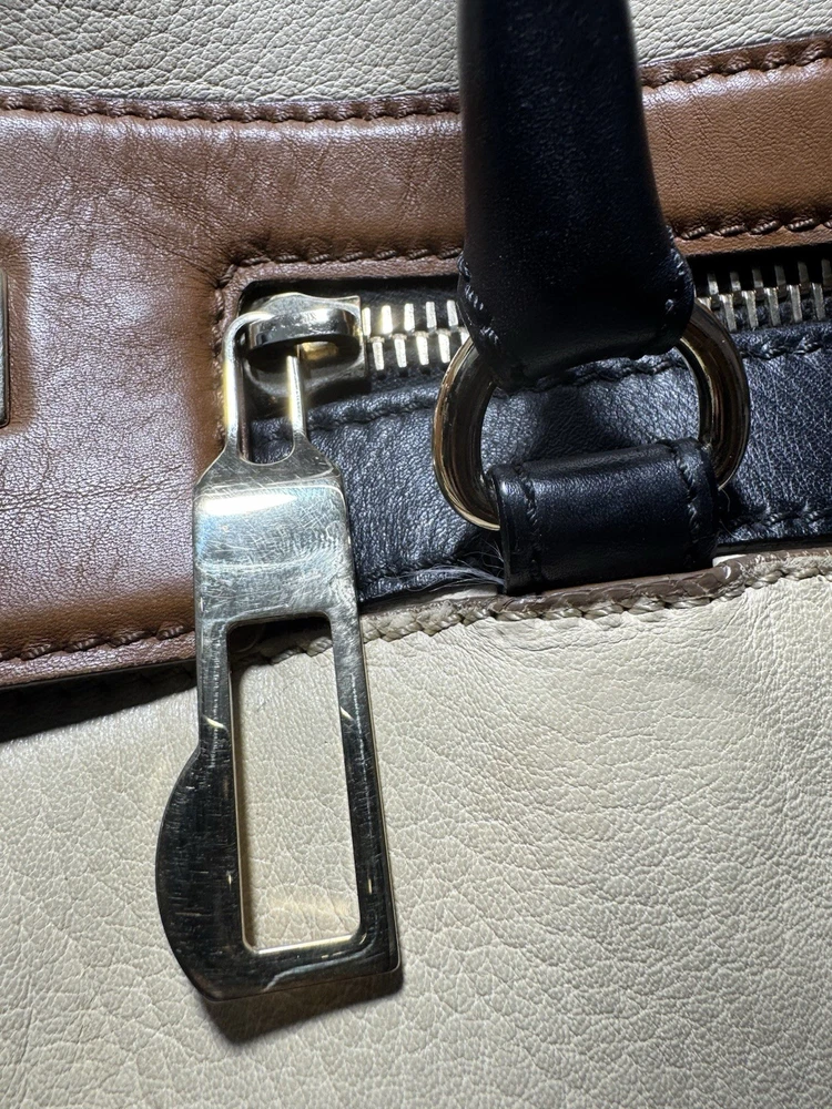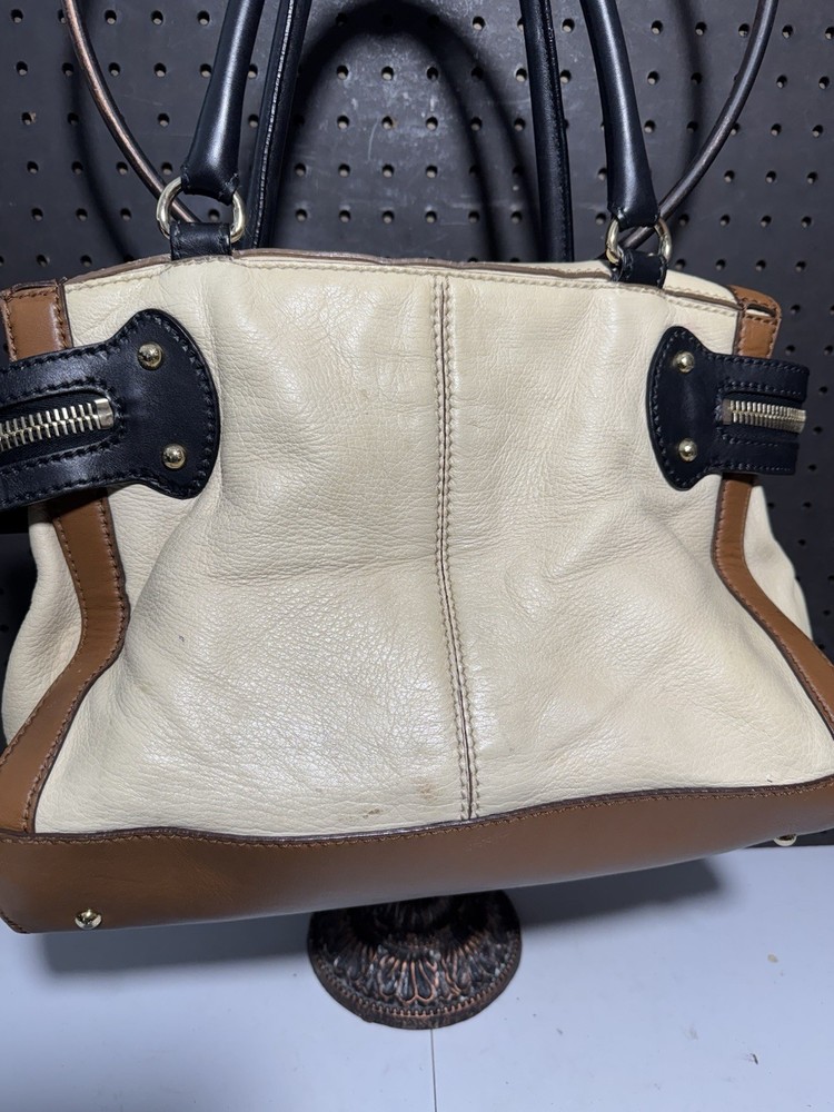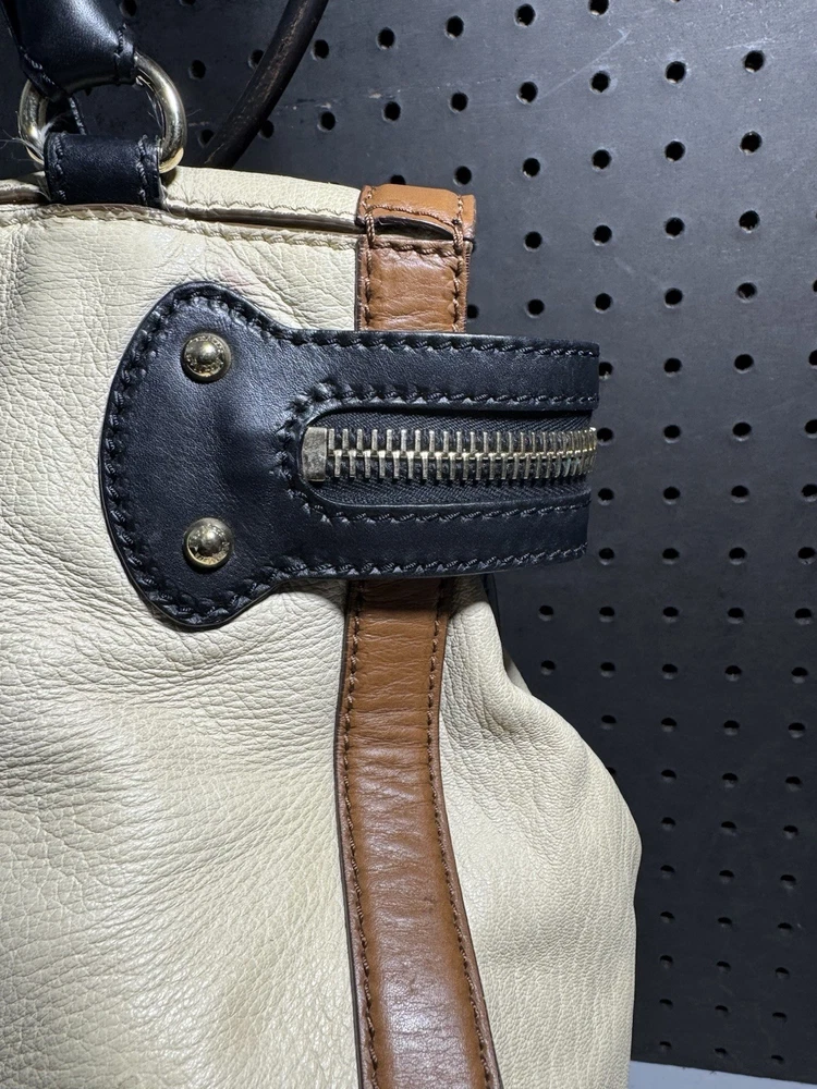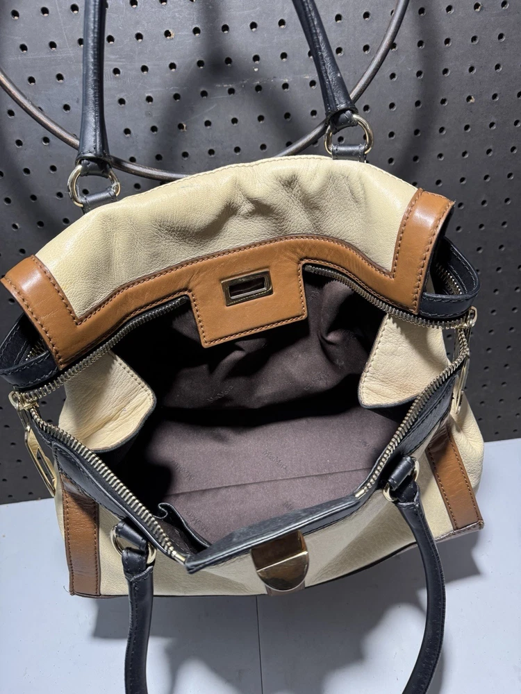 Crafted with precision, the Maxmara Margo Handbag is a testament to Italian craftsmanship, offering a blend of functionality and elegance. The bag features a durable leather exterior in a versatile beige hue, complemented by a sleek black leather lining. Its medium size, measuring 13 inches in width and 9 inches in height with a depth of 7 inches, makes it spacious enough to carry your daily essentials with ease. Attention to detail is evident in the bag's design, which includes a secure zip closure, gold hardware accents, and a comfortable leather strap in black, ensuring both style and practicality. The Maxmara Margo is an ideal accessory for those who appreciate a touch of luxury and a colorful theme, all while enjoying the quality and reputation of the Max Mara brand.