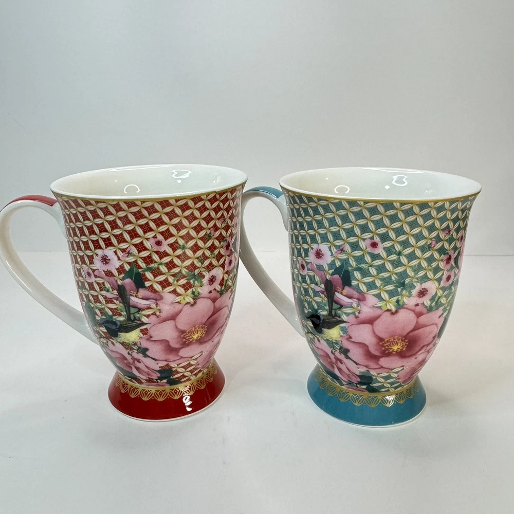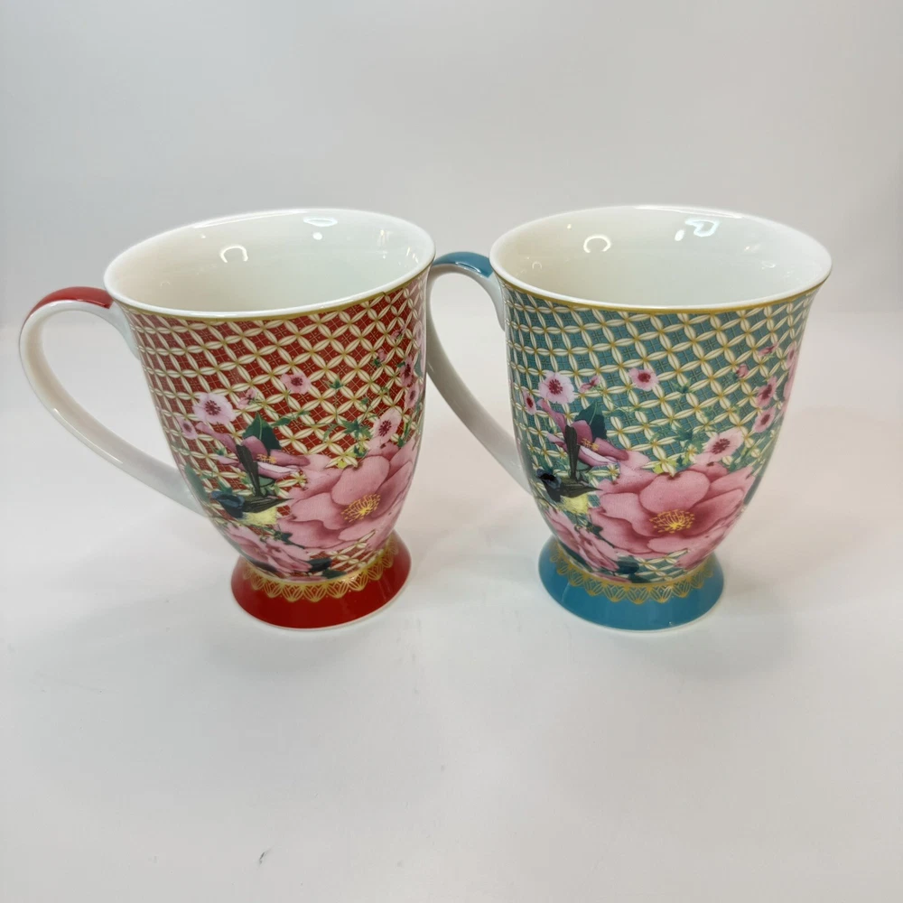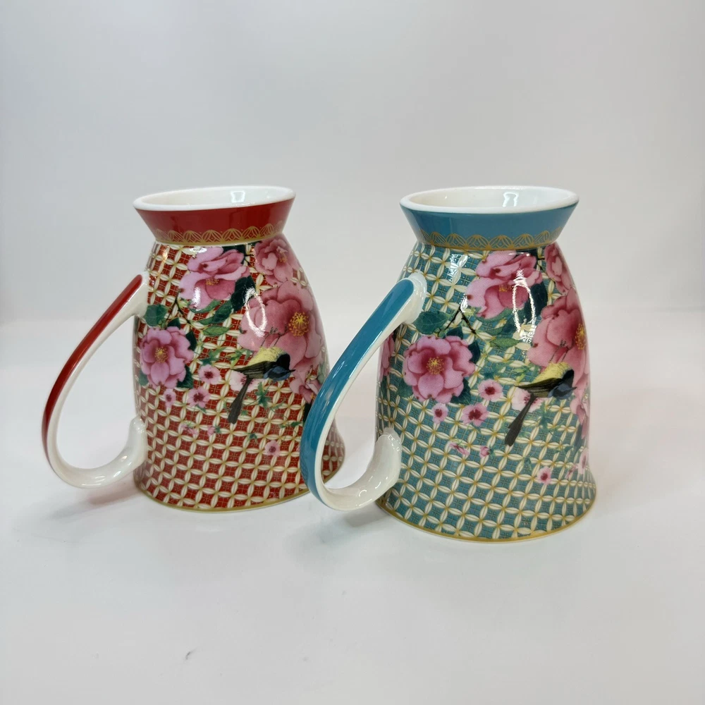 Elevate your morning ritual with the Maxwell & Williams TC Silk Road Mugs. Crafted from high-quality porcelain, this set promises a touch of elegance to your coffee or tea experience. Each mug features a vibrant, multicolored floral pattern that bursts with life, complementing any occasion whether it's a cozy morning or an after-dinner treat. The set includes two 300 ml mugs, presented in a striking red and teal color scheme that is sure to add a splash of color to your kitchen collection. The beaker design is both contemporary and functional, suitable for both hot and cold beverages. Designed by Designer Homeware Distribution GmbH, these mugs bring a blend of style and utility to your tabletop. Excellent used condition.