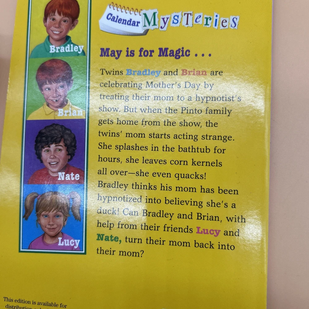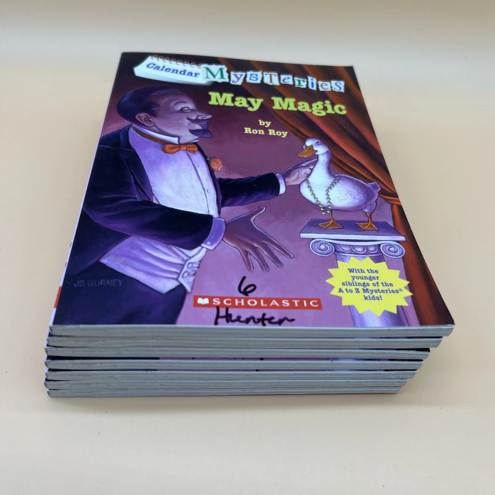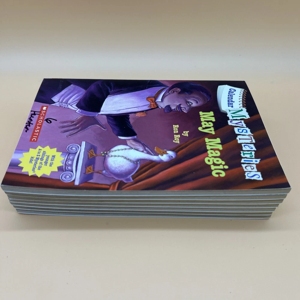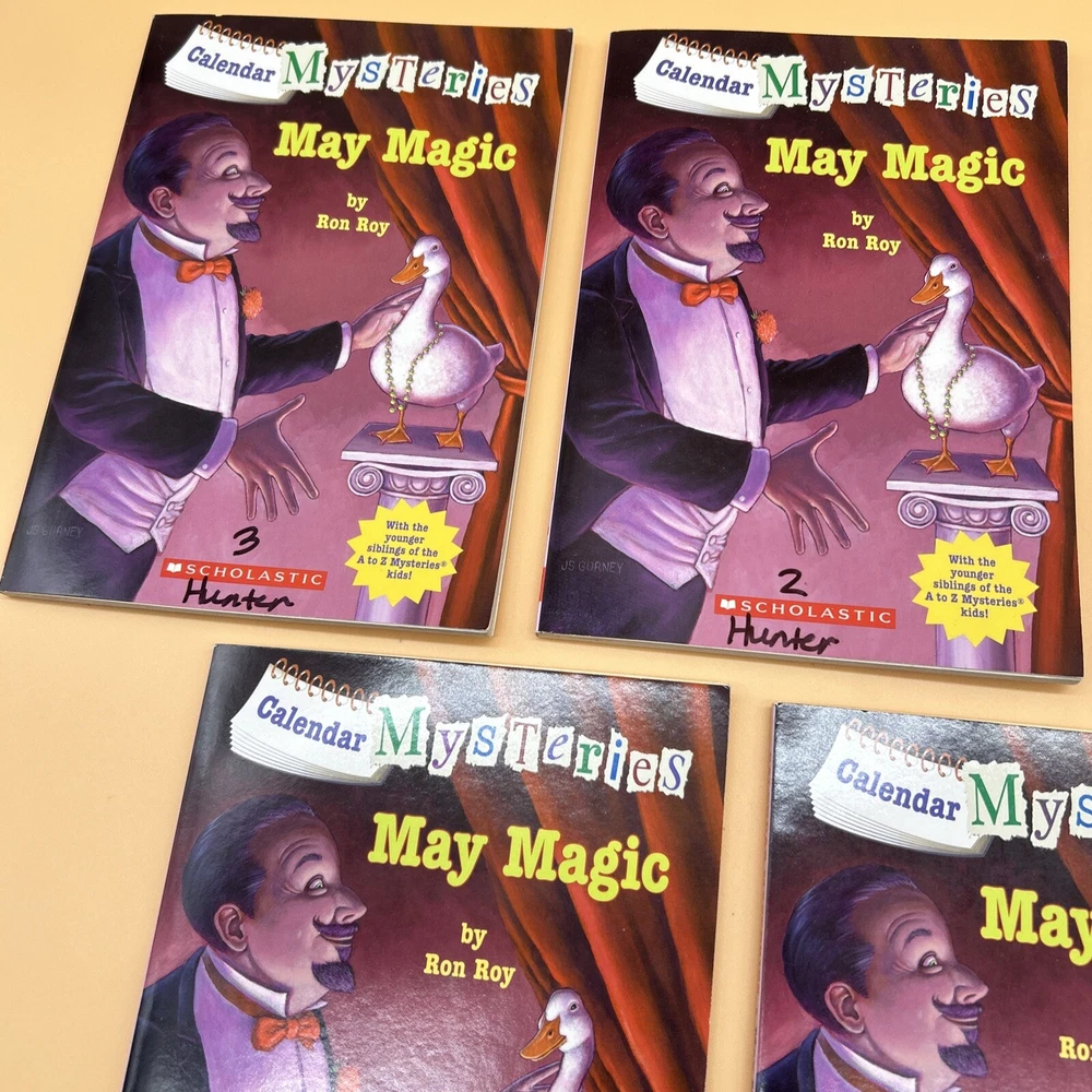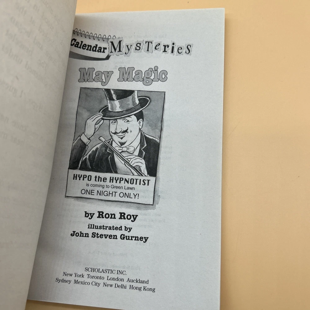Publisher: Scholastic gtin13: DoesNotApply Language: English Type: Novel Features: Illustrated Format: Paperback Topic: Boys' Interest, Detective Stories, Friendship, Girls' Interest, Magic Tricks Book Title: May Magic ISBN: DoesNotApply Genre: Adventure, Children & Young Adults, Mystery Publication Year: 2011 Original Language: English Author: Ron Roy Illustrator: John Steven Gurney Era: 2010s Book Series: Calendar Mysteries Narrative Type: Fiction