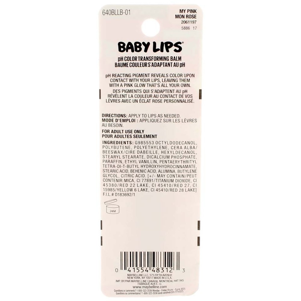 Product Description Ph color changing lip balm Lip balm reveals your ideal, custom shade of pink Hydrates lips for four hours Get a lip glow that's all your own with glow lip balm Ingredients Octyldodecanol Polybutene Polyethylene Cera Alba / Beeswax / Cire Dabeille Hexyldecanol Stearyl Stearate Dicalcium Phosphate Paraffin Ethyl Vanillin Pentaerythrityl Tetra-Di-T-Butyl Hydroxyhydrocinnamate Stearic Acid Behenic Acid Alumina Butylene Glycol Citric Acid [+/- May Contain / Peut Contenir Mica Ci 77891 / Titanium Dioxide Ci 45380 / Red 22 Lake Ci 45410 / Red 27 Ci 15985 / Yellow 6 Lake Ci 45410 / Red 28 Lake ] F.I.L. D183692/1. Instructions Apply lip balm in the center of your upper lip and follow the contours of your mouth Glide the lip balm across the entire bottom lip Reveal your ideal, custom shade of pink Product Description Ph color changing lip balm Lip balm reveals your ideal, custom shade of pink Hydrates lips for four hours Get a lip glow that's all your own with glow lip balm Ingredients Octyldodecanol Polybutene Polyethylene Cera Alba / Beeswax / Cire Dabeille Hexyldecanol Stearyl Stearate Dicalcium Phosphate Paraffin Ethyl Vanillin Pentaerythrityl Tetra-Di-T-Butyl Hydroxyhydrocinnamate Stearic Acid Behenic Acid Alumina Butylene Glycol Citric Acid [+/- May Contain / Peut Contenir Mica Ci 77891 / Titanium Dioxide Ci 45380 / Red 22 Lake Ci 45410 / Red 27 Ci 15985 / Yellow 6 Lake Ci 45410 / Red 28 Lake ] F.I.L. D183692/1. Instructions Apply lip balm in the center of your upper lip and follow the contours of your mouth Glide the lip balm across the entire bottom lip Reveal your ideal, custom shade of pink Disclaimer The product descriptions and instructions provided by vitabox.com are for informational purposes only and are qualified in their entirety by the information available from manufacturers of the products. You should carefully read all product packaging, and contact the manufacturer with any questions before using a product. While we endeavor to ensure that product descriptions are current, manufacturers sometimes change their products. We are not liable for inaccuracies or misstatements about products. We do not provide medical advice or recommendations. You should not use the information provided by vitabox.com for diagnosing or treating a health problem or disease. If you have or suspect that you have a medical problem, immediately contact your health care provider. Information and statements regarding dietary supplements have not been evaluated by the Food and Drug Administration or any other government agency and are not intended to diagnose, treat, cure, or prevent any disease.