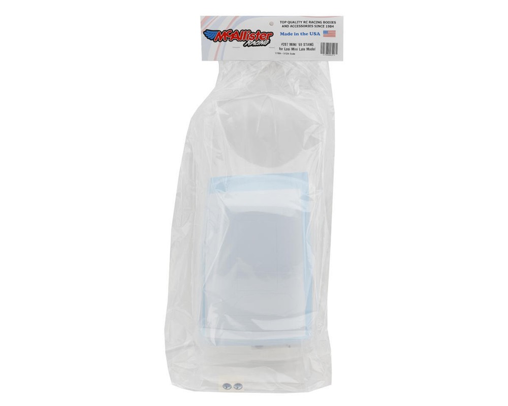 Body Overview: McAllister 1969 Mini Mustang 1/18 Oval Body. This mini scale clear Lexan RC car body, perfect for Losi Mini Late Model conversion kit. Made from genuine American-made .030 thick Lexan, this body provides durability and high performance. The package includes window masks, an outer overspray film, and detailed decals for easy customization. This body is ideal for racers aiming to reduce weight while maintaining a sleek and robust design for competitive racing. Note: Painted body shown in the photos is for illustrative purposes only. The product you will receive is clear and unpainted. Features: Drop on fit for the Losi Mini Late Model conversion kit Vintage American Muscle Style Super scale detailed Made in the USA from .030 genuine American made polycarbonate Specifications: Scale: 1/18 Application: Oval Wheelbase: 9in (230mm) Thickness: .030in (0.76mm) Includes: (1) 1969 Mini Mustang 1/18 Oval Body (1) Windows Mask Sheet (1) Decal Sheet About Us | View Store