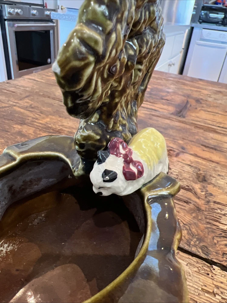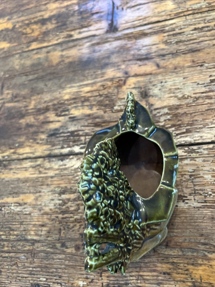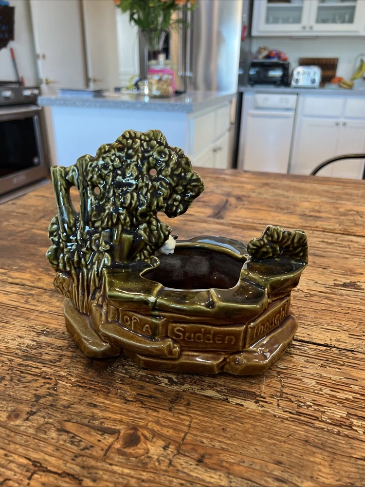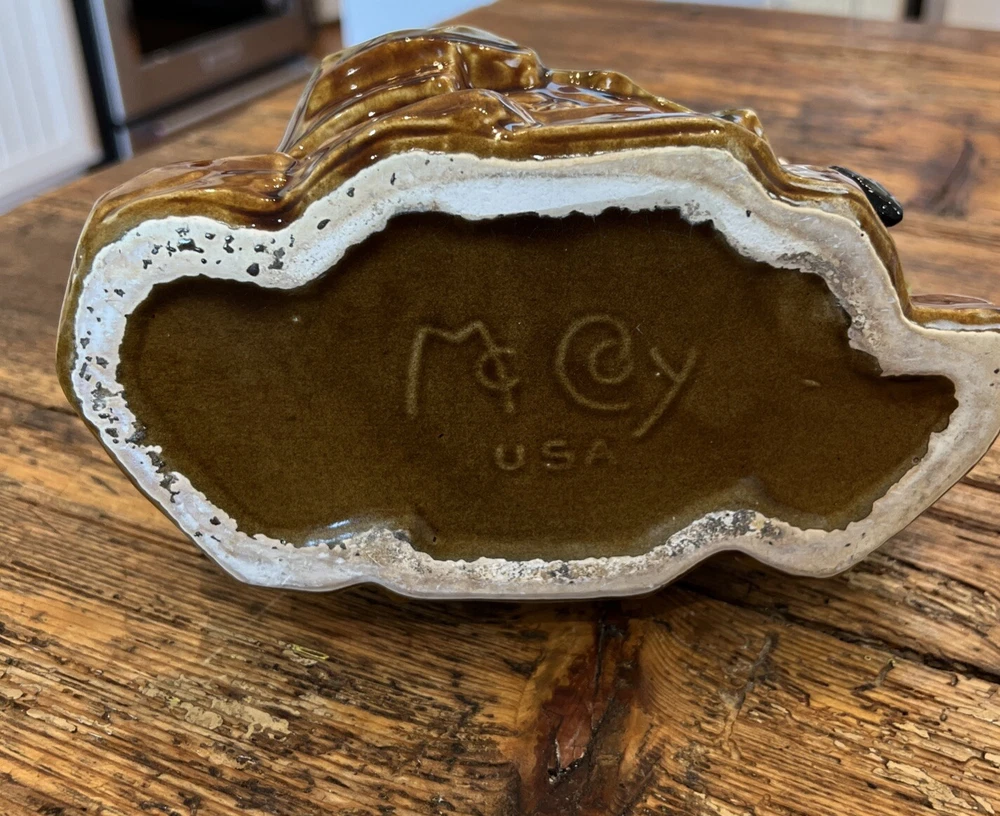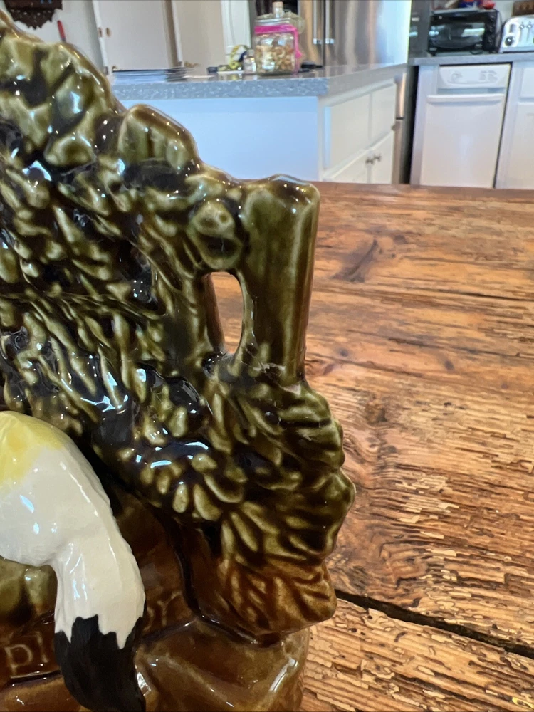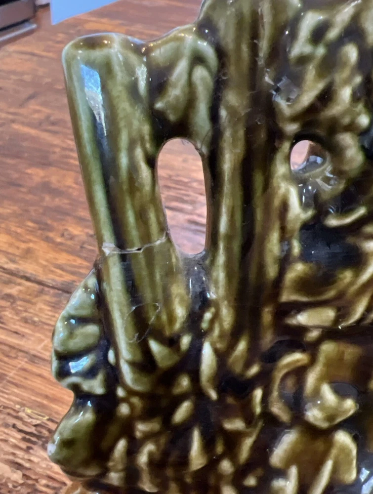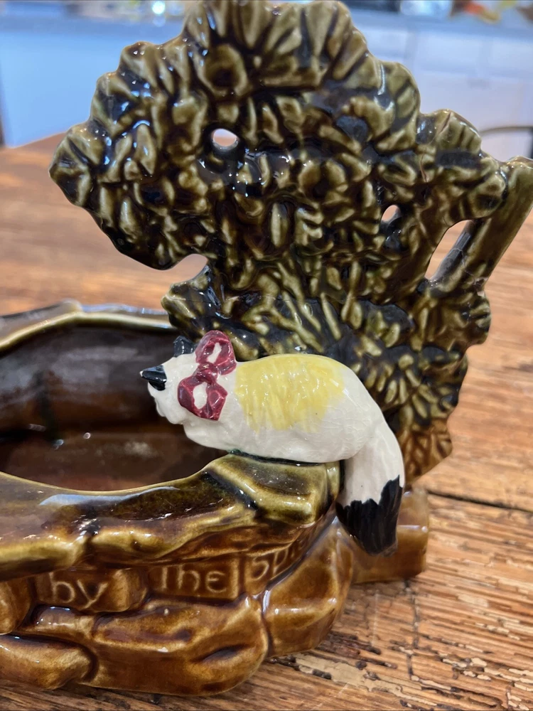 Add a touch of vintage charm to your cat-themed collection with this McCoy Pottery Cat By The Well Planter. Featuring the Cat At The Well pattern, this art pottery piece is a beautiful addition to any home decor. Made of high-quality clay material, this planter is sturdy and durable, perfect for housing your favorite indoor plants. With a production style of art pottery and a production technique of pottery, this planter was manufactured in the United States in 1957. Measuring at 8 1/2" in length, 7" in height, and 4 3/4" in width, it's the perfect size for any space. Don't miss out on the opportunity to own this unique piece of history. This looks great but does have a repaired break in the tree branch and one cat ear is rough on the tip.