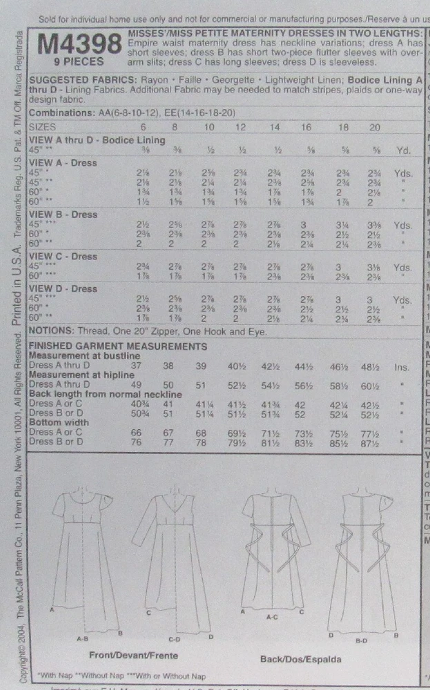McCalls 4398 EASY Womens 6-8-10-12 Maternity Empire Smock Dress Pattern UNCUT McCalls 4398 EASY Womens 6-8-10-12 Maternity Empire Smock Dress Pattern UNCUT McCall's Sewing Pattern 4398, dated 2004 Maternity Dress with Empire Bodice, neckline & sleeve variations & optional back ties Misses Sizes 6--8--10--12 included fits busts 30½--34" Pattern is UNCUT, factory folded, complete & unused condition Envelope is in great condition ~I mail All patterns in an archival quality storage sleeve. ~I ship SAME or NEXT business day . . . always! ~I don't use tracking for patterns. They are shipping USPS Flat 1st Envelope. ~I personally guarantee delivery within 10 business days or will process a full refund! Listing and template services provided by inkFrog