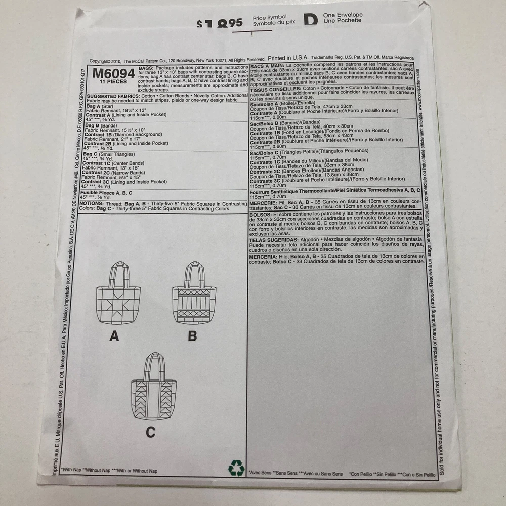 McCall's 6094 Whistlepig Creek Productions Tote Bag Quilt Designs Pattern cut All pieces included