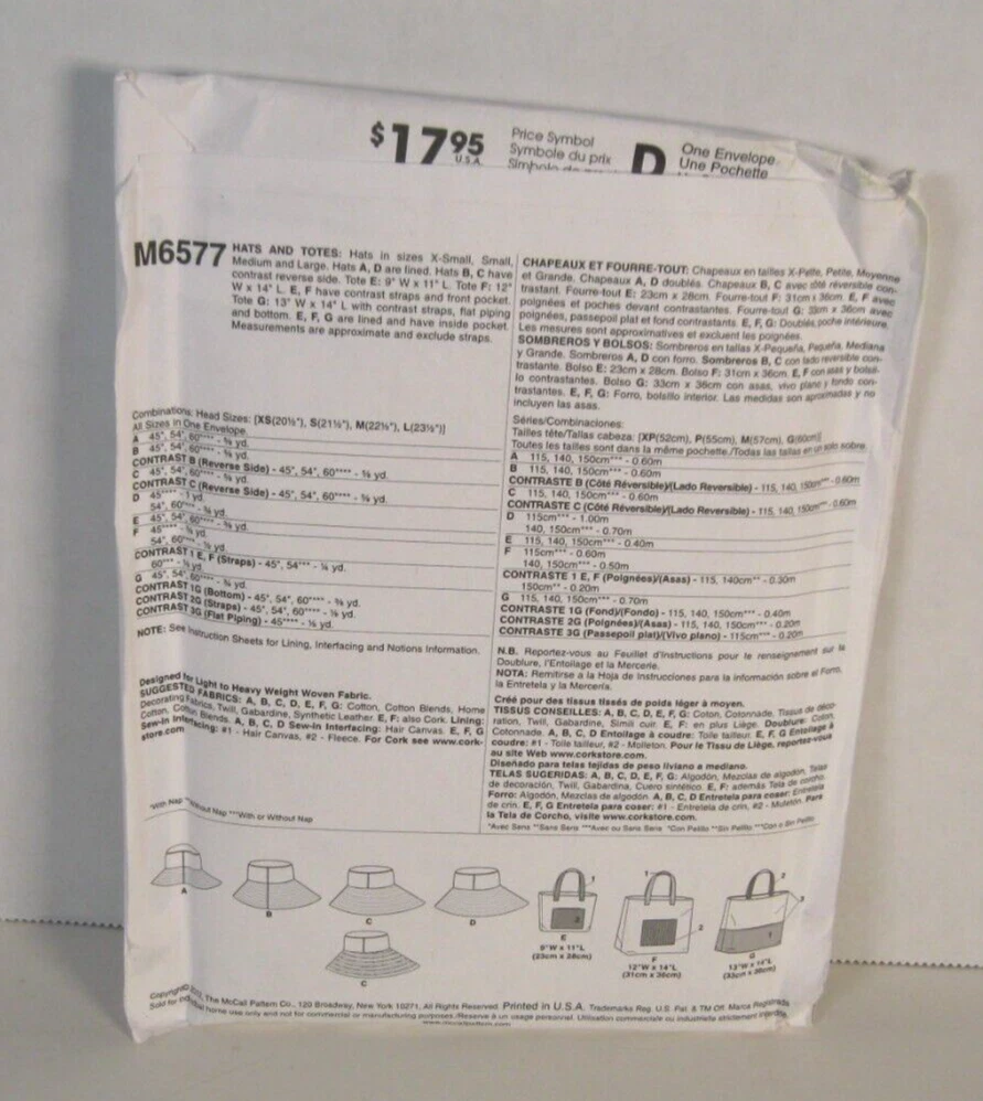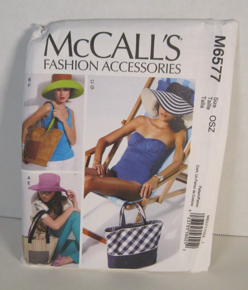I have a McCall's Fashion Accessories pattern # 5677 that features hats and totes in different styles. The package contains instructions and patterns for the following: Hats in sizes X-Small, Small, Medium and Large. Hats A, D are lined. Hats B, C have contrast reverse side. Tote E: 9" W x 11" L. Tote F: 12" W x 14" L. Tote G: 13" W x 14" L with contrast straps, flat piping and bottom. E, F, G are lined and have inside pocket. Measurements are approximate and exclude straps. This is a brand new, uncut pattern. It is from a smoke-free home and shipping is free in the U.S. Please check my other listings - I have many other patterns and will be glad to discount multiple purchases (10% off for two items, 15% off for three items and 20% off for four or more items).