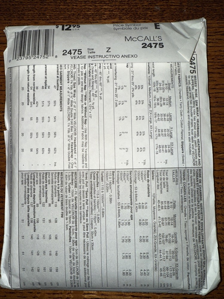 Get ready to unleash your inner fashionista with this stunning McCalls Sewing Pattern 2475. This pattern includes a Robe, Spa Wrap, Headband, and Headwrap in sizes XLG-XXL. You'll be able to create your own unique pieces that are perfect for any occasion. This pattern is uncut and ready to use, so you can start crafting right away. It's perfect for adult females who want to take their sewing skills to the next level. With this pattern, you'll be able to create beautiful and comfortable garments that are sure to impress.