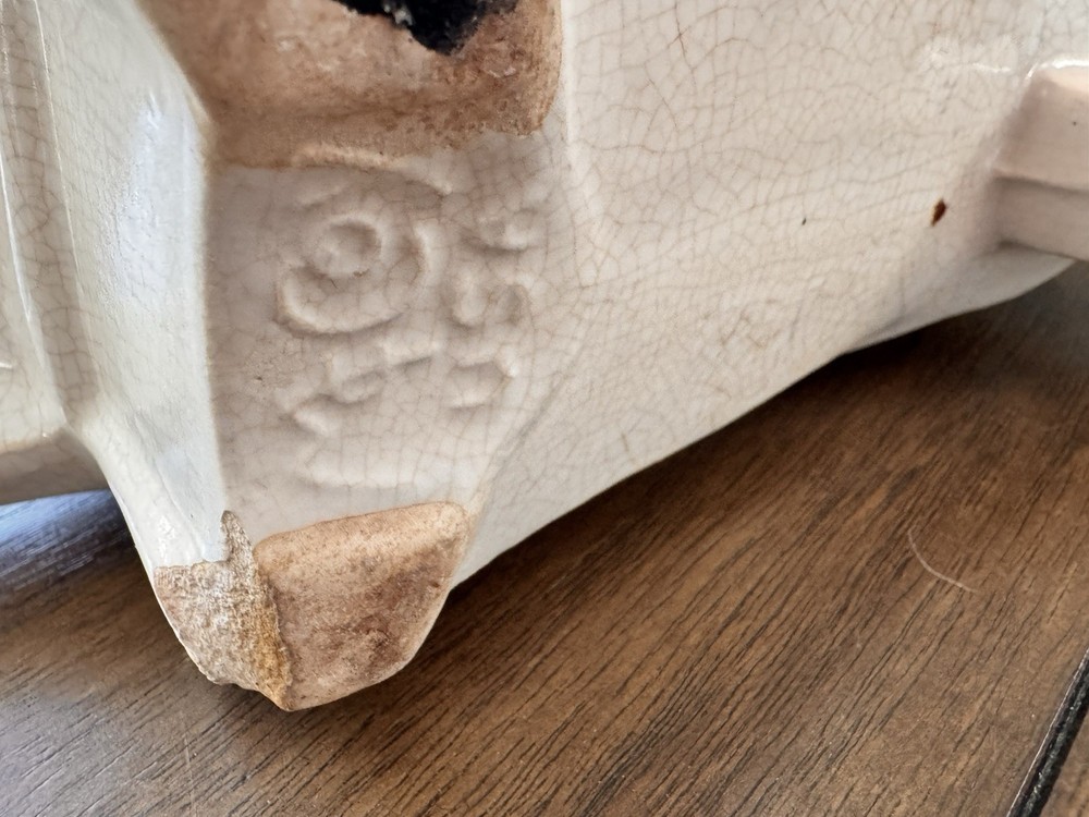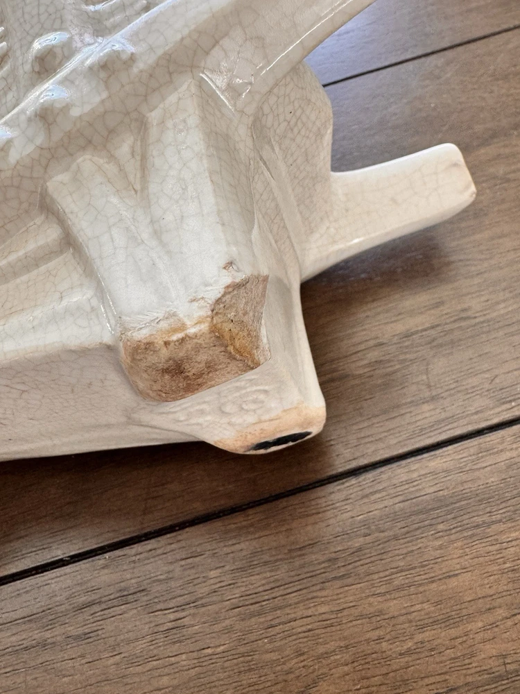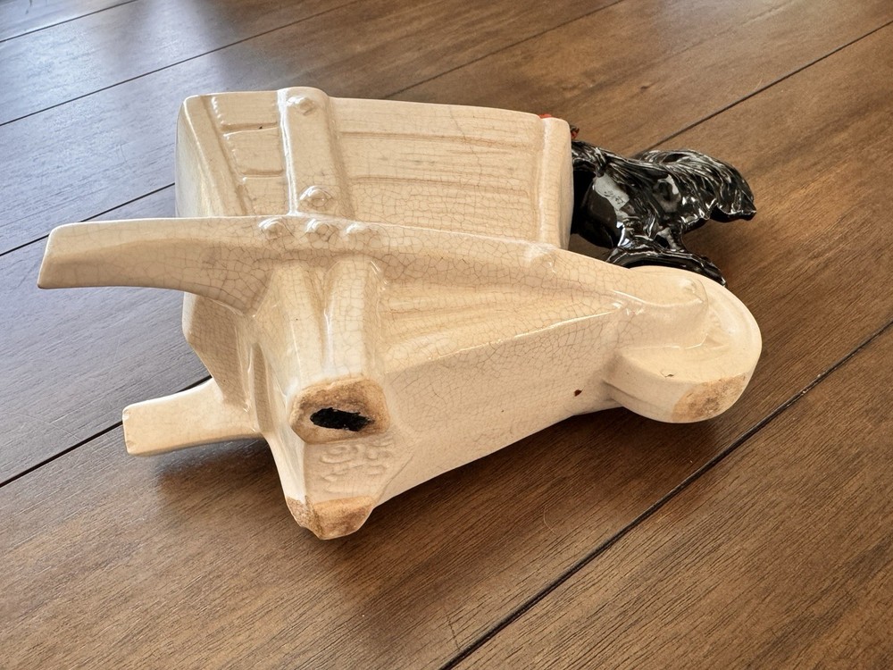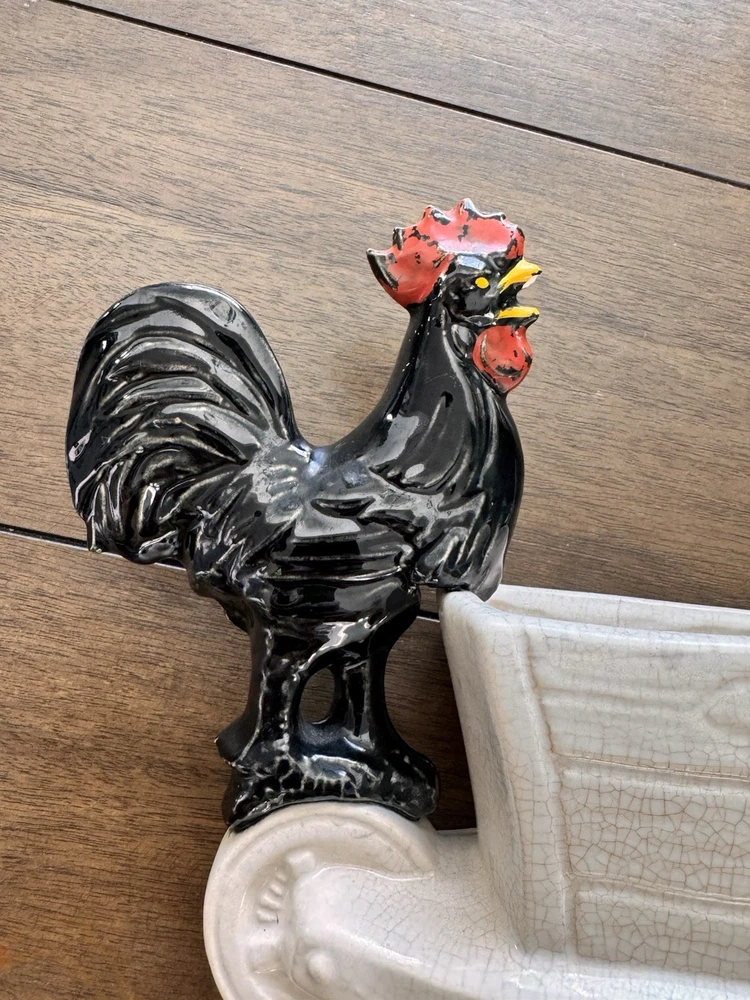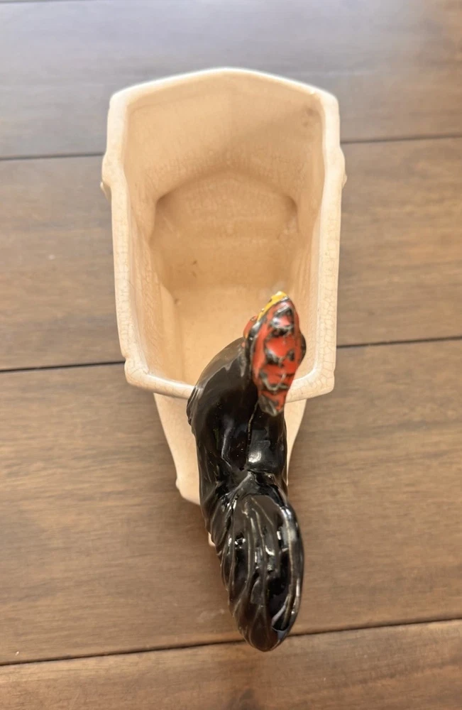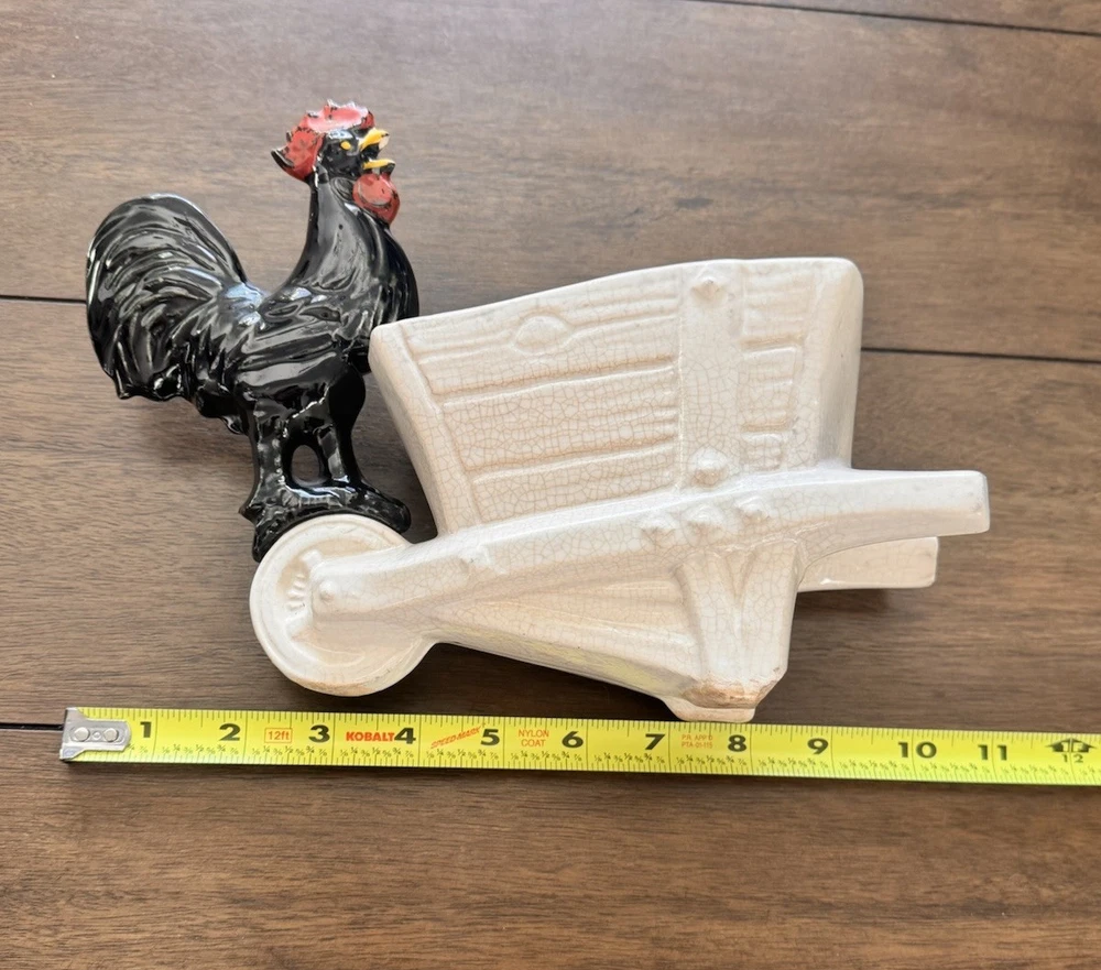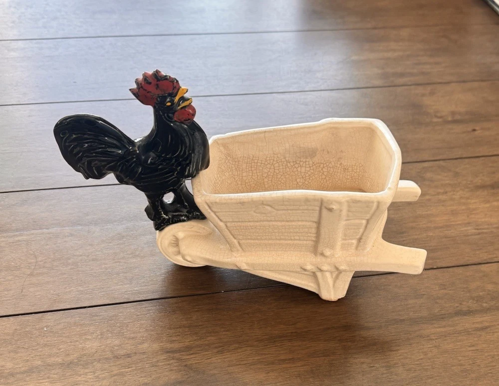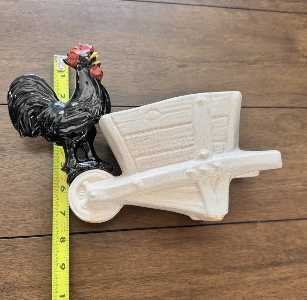 Paint is excellent. ***Please note*** The rooster beak is chipped and a small Knick on the corner of the wheelbarrow - see pictures for details. If the planter is positioned to one side the beak blemishes is unnoticeable. The McCoy Pottery Cold Painted Black Red Rooster On Wheelbarrow Planter is a vintage farmhouse style piece made of clay in the United States. The planter features a rooster design in black, red, and white colors, with an art pottery production style and technique. The item measures 10 inches in length, 7 inches in height, and 3 1/2 inches in width, making it a unique and charming addition to any decorative pottery collection.