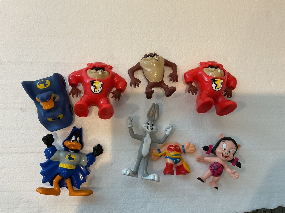 McDonald's Looney Tunes Super Heroes Happy Meal Toys 1991 Lot Includes: Bugs Bunny as Super Bunny Daffy Duck as Batduck Tasmanian Devil as Taz Flash Petunia Pig as Wonder Pig Lot of 8 Items. Three Tasmanian Devil. Missing part of the outfit for Petunia Pig and Bugs Bunny. What you see is what you will receive. Please see pictures for most accurate description of description. You may see small flaws such as light marks, scratches, paint loss etc. but no major issues.