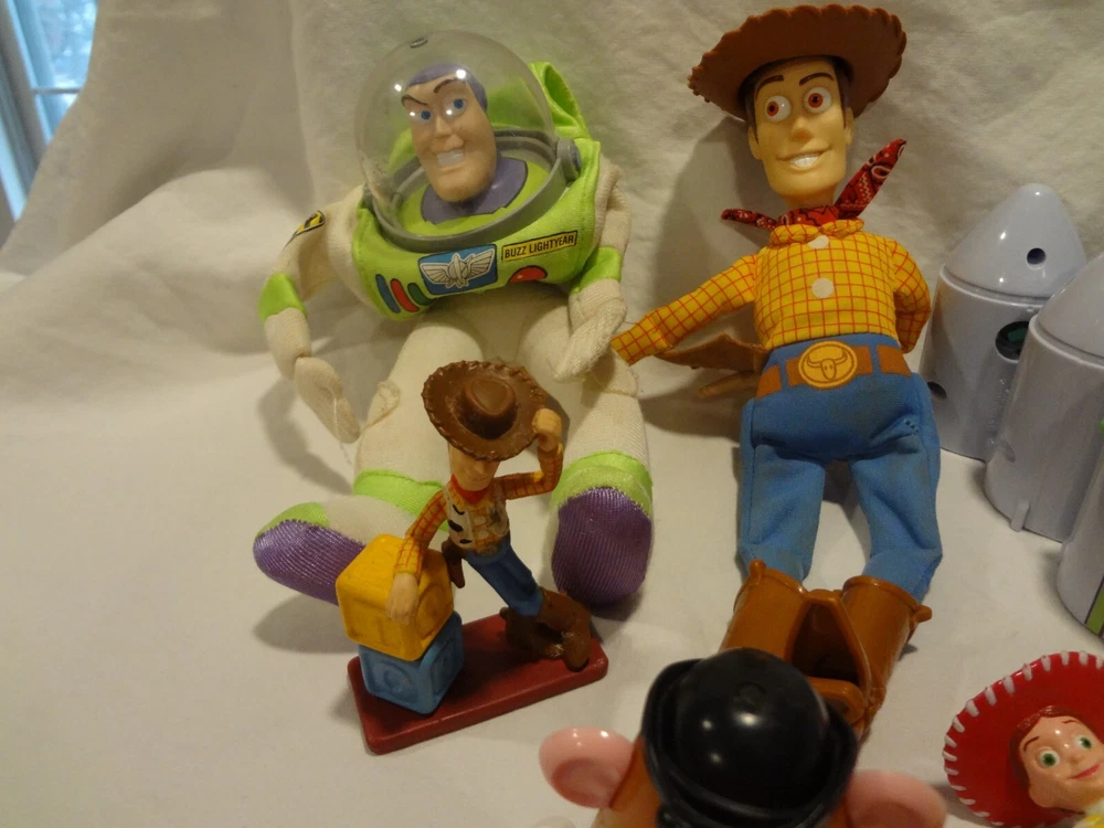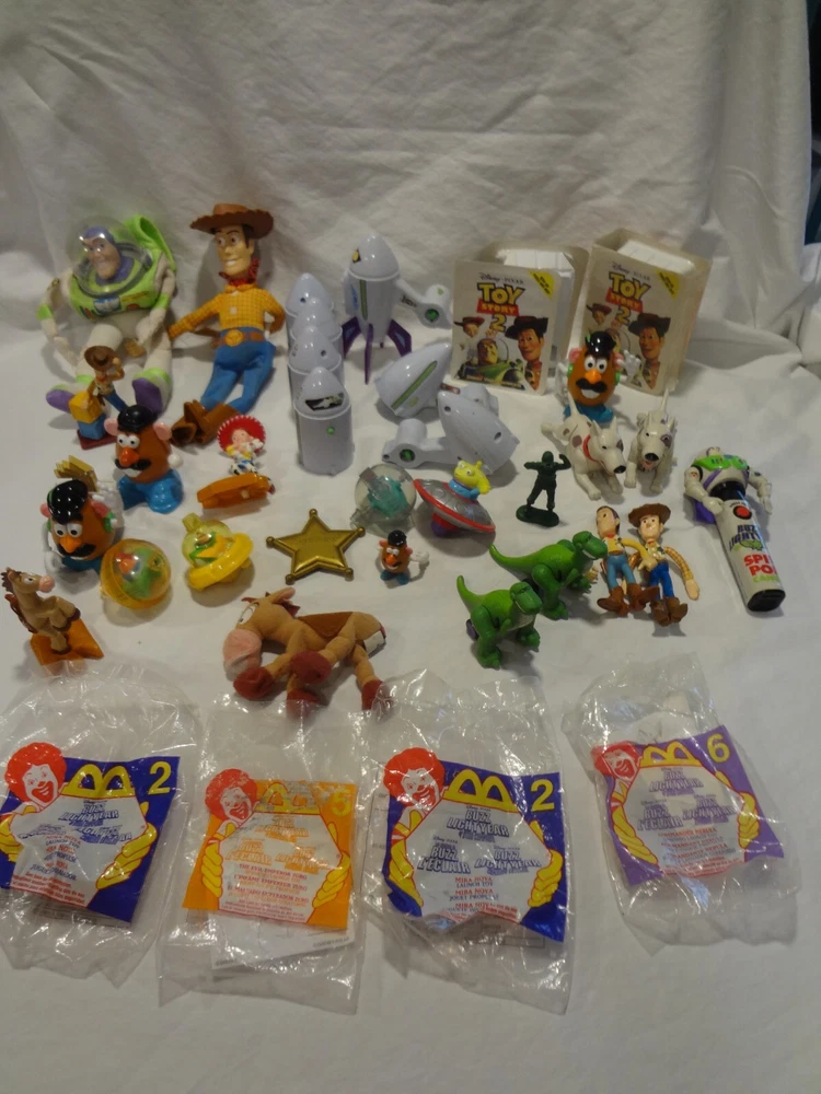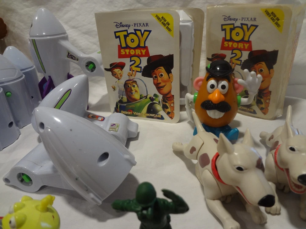 McDonalds Happy Meal Toy Story Toys Figures Lot . One of the books is still wrapped in plastic. The other book is empty. Mr. Potato with the french fries and without the french fries on his back swings his arm when you push the button on the back. both wind-up dogs work