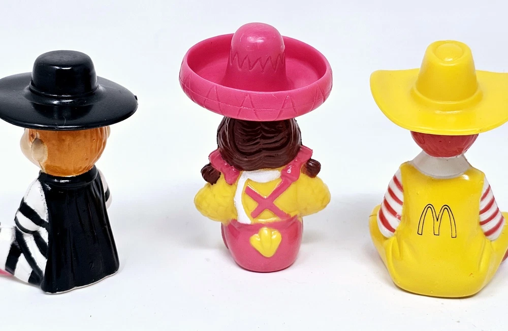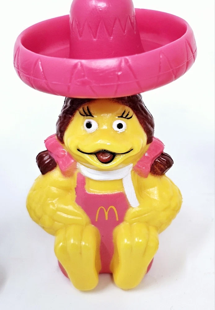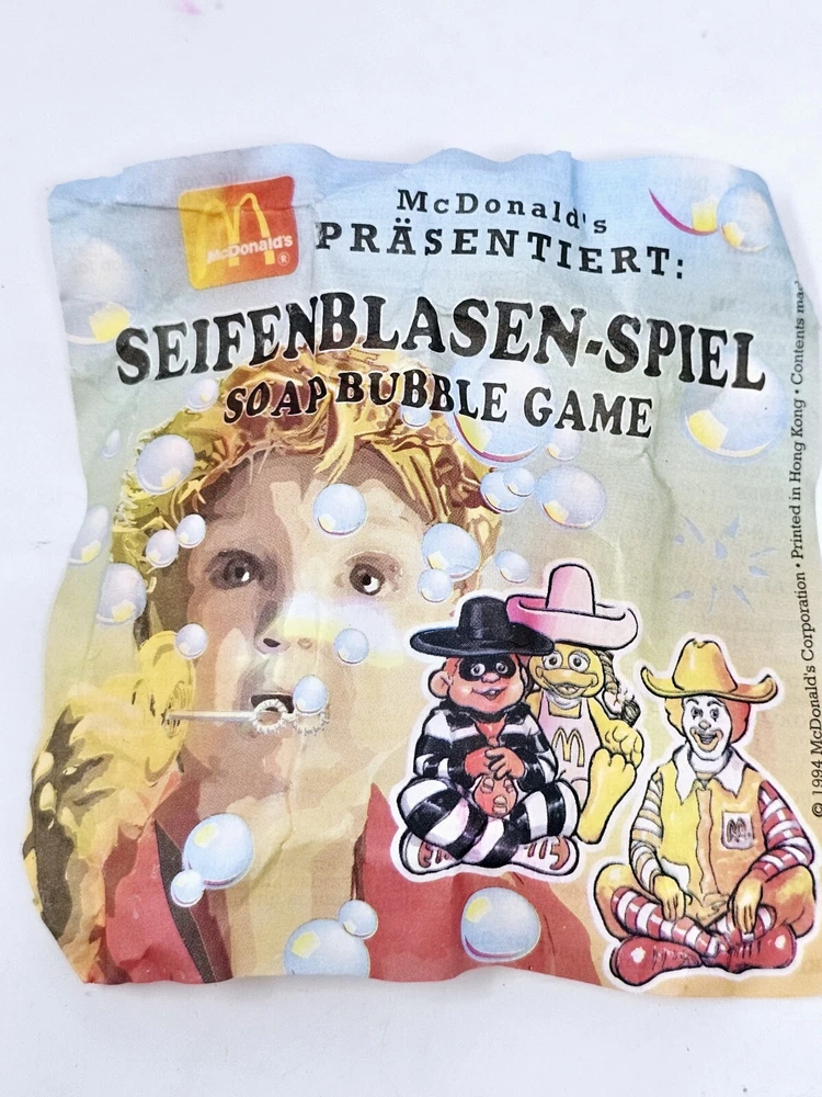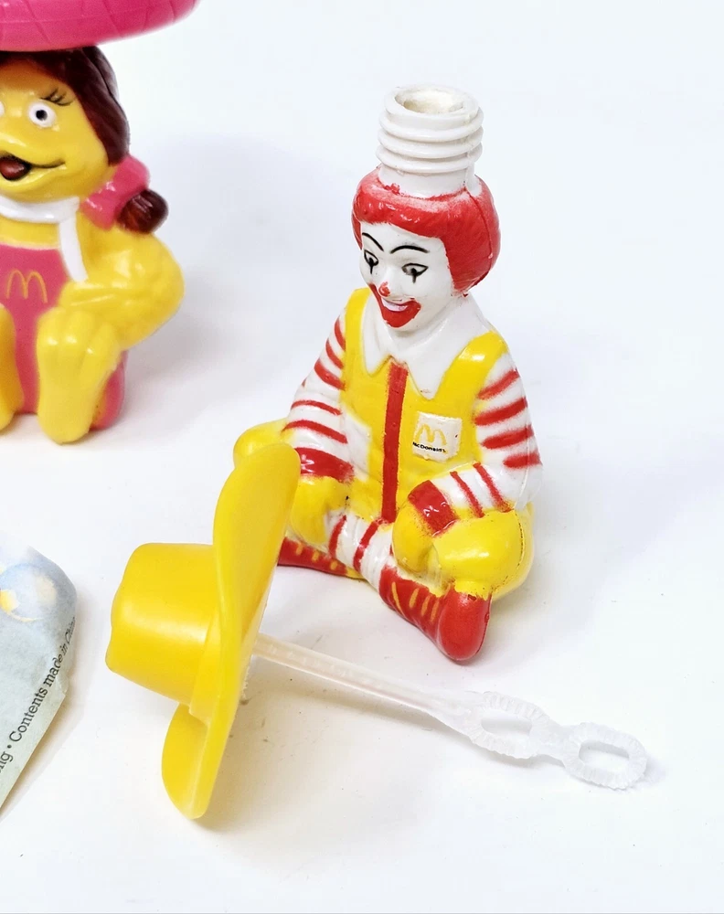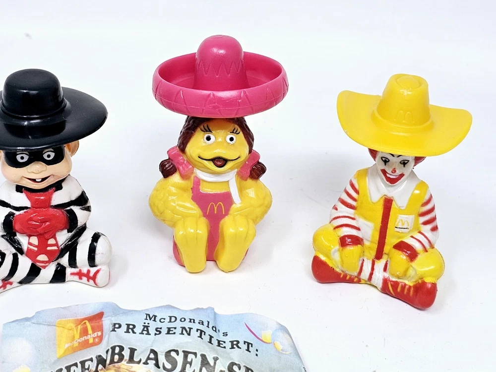 Super rare collectible McDonald's Toys, from Promo Germany! We're in bags but the soap inside every bottle leaked out and made it look nasty inside. So cleaned them all. This collectible McDonald's Meal Toy features Ronald Soap Bubble Ronald Hamburglar Birdie from Germany in 1994. The toy is a great addition to any collection of fast-food advertising memorabilia. The item is an original and is not modified. The toy is multi-colored and features the iconic Ronald Hamburglar character. The theme of the toy is restaurants and fast food. The item is perfect for collectors or fans of McDonald's and fast-food culture.