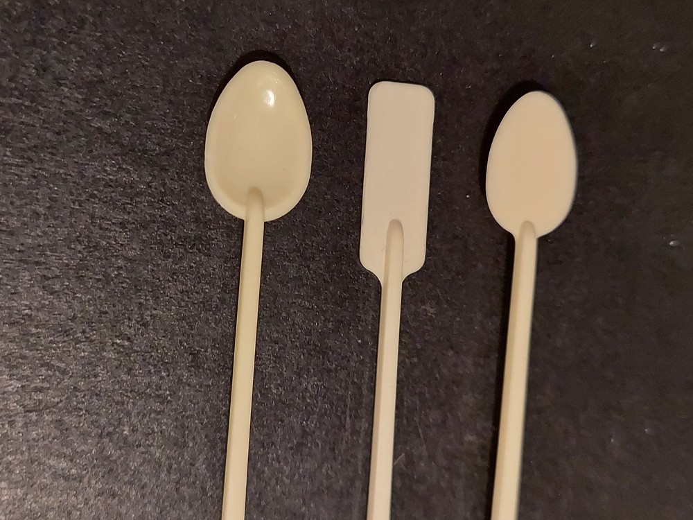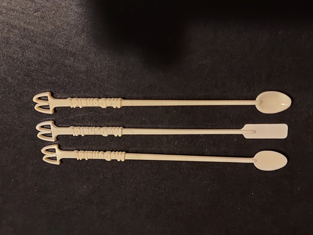 The product is a set of three vintage McDonald's coffee stirrer spoons, featuring a white color and a restaurant and fast food theme. These original collectibles were manufactured in the United States and bear the iconic McDonald's brand. Perfect for advertising or adding a touch of nostalgia to a collection, these spoons provide a unique and classic touch to any memorabilia assortment. this is a lot of 3 1 Spoon 1 flat Paddle and 1 flat Spoon.
