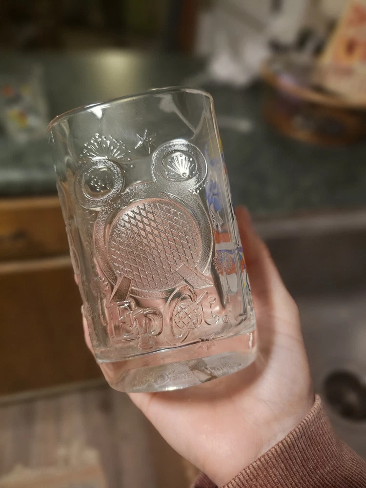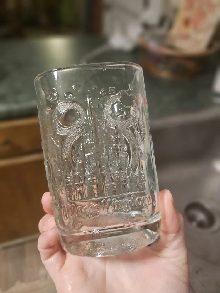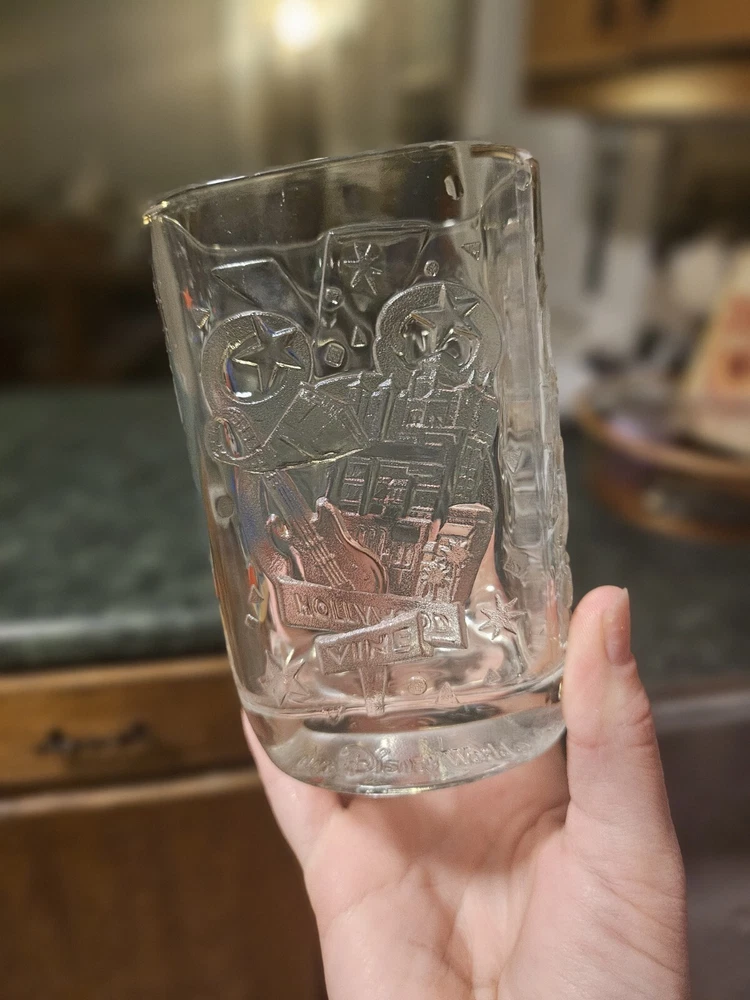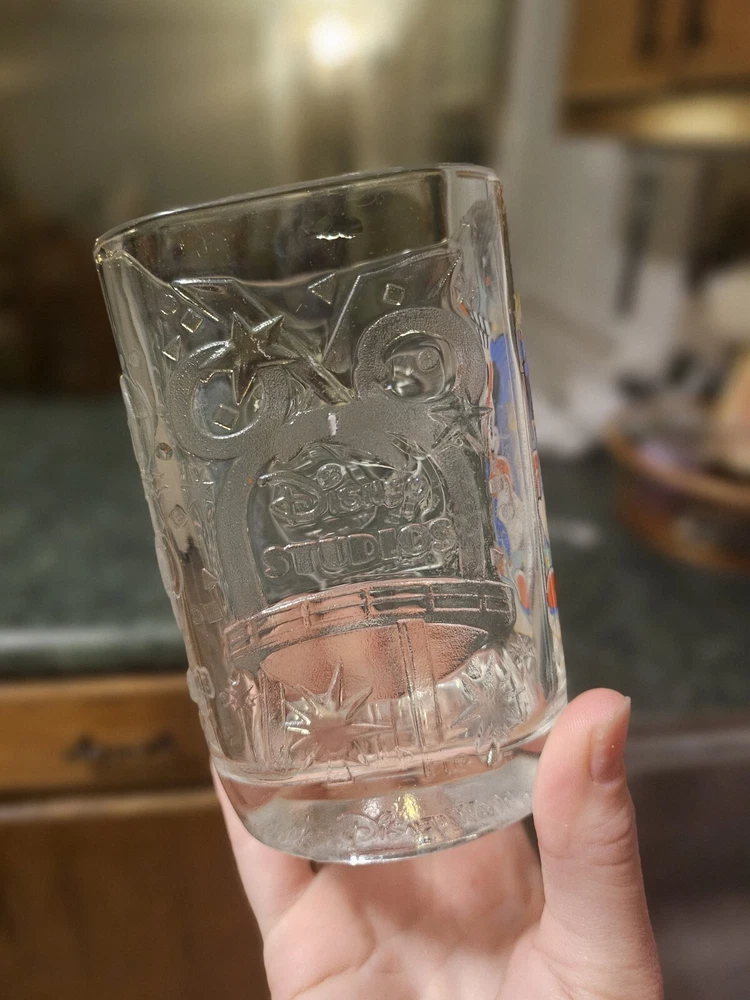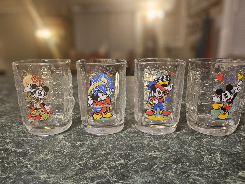 The product is a set of six glass tumblers featuring designs from the Walt Disney World 2000 Millennium Celebration, a collaboration between McDonald's and Disney. In excellent condition! Made of glass, these collectible tumblers are a nostalgic piece for fans of Disney and those who attended the Millennium Celebration at Walt Disney World in 2000. Each glass cybolizes one of the 4 parks, with two duplicate parks to make a total of 6 glasses.